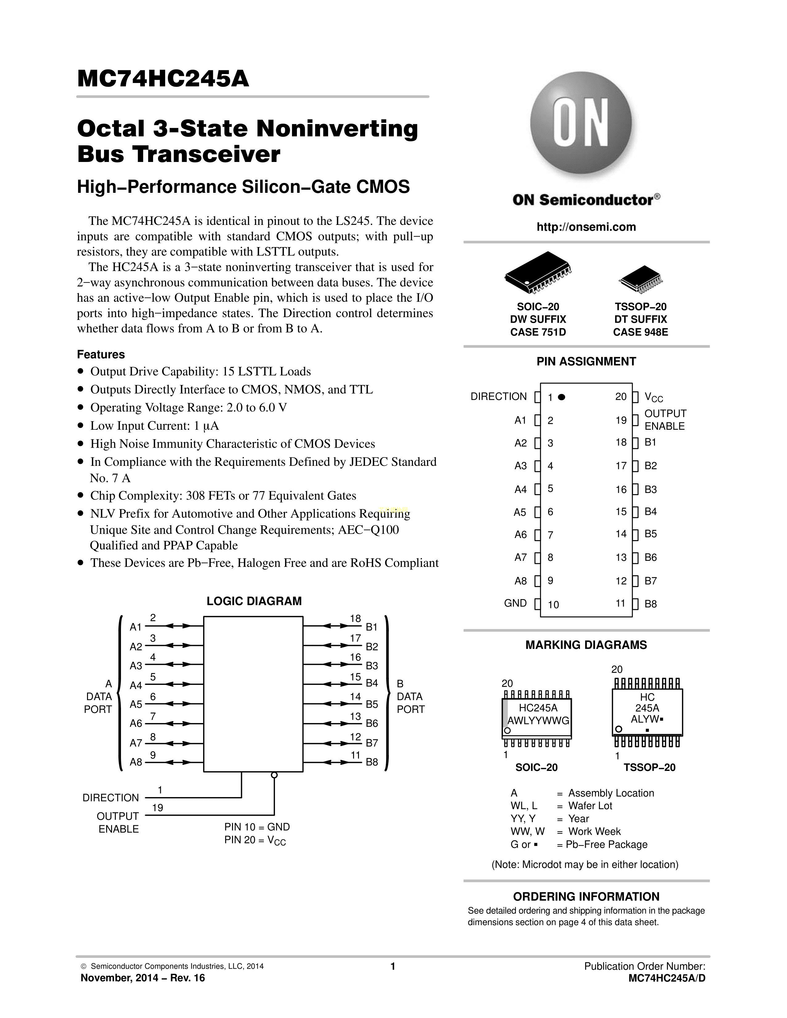 NLV74HC245ADWG数据手册SOIC-20Wide封装onsemi(安森美)PDF规格书,中