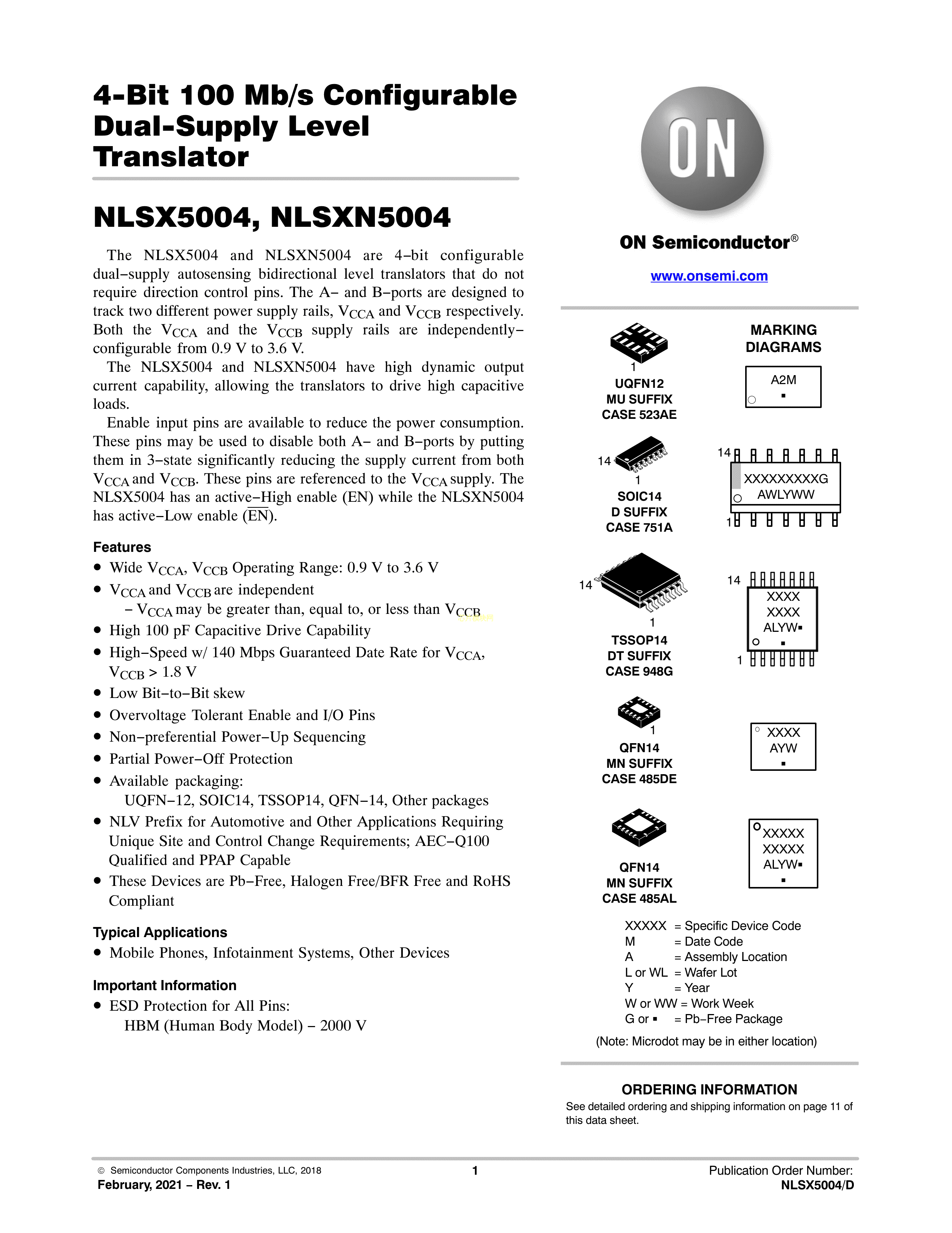 NLVSX5004MUTAG数据手册UQFN-12封装onsemi(安森美)PDF规格书,中英文下载