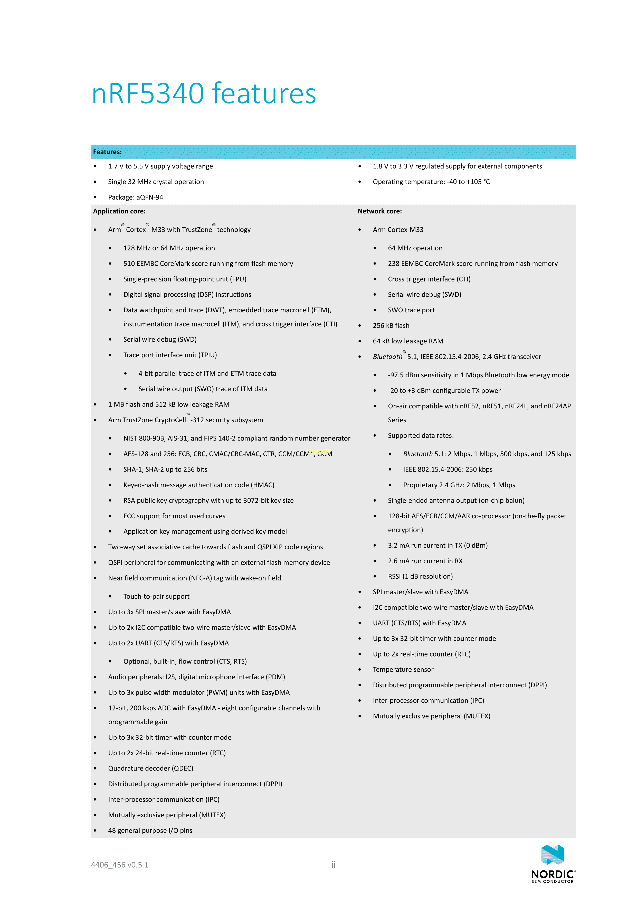 NRF5340-QKAA-R数据手册AQFN-94封装NORDICPDF规格书,中英文下载