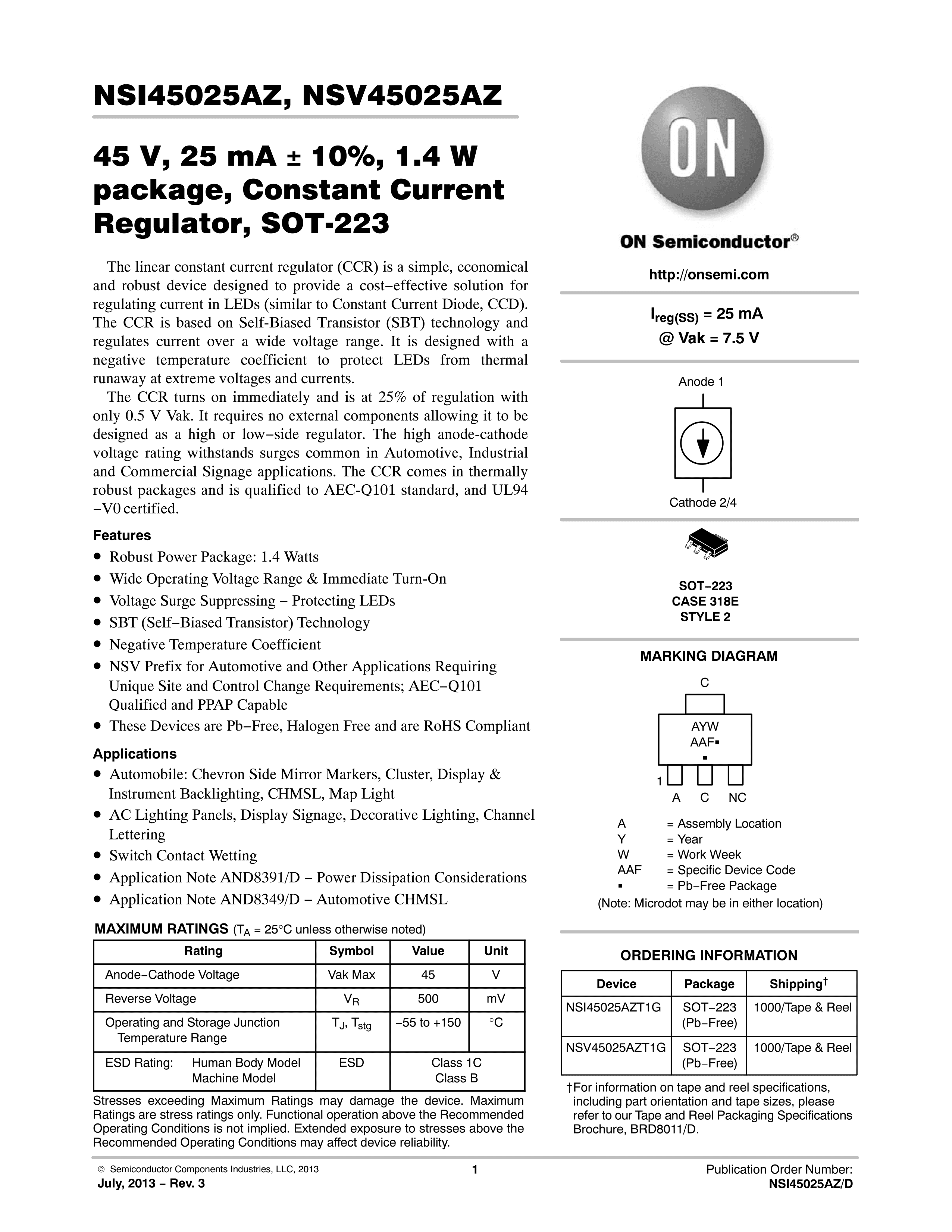 NSI45025AZT1G数据手册SOT-223封装onsemi(安森美)PDF规格书,中英文下载