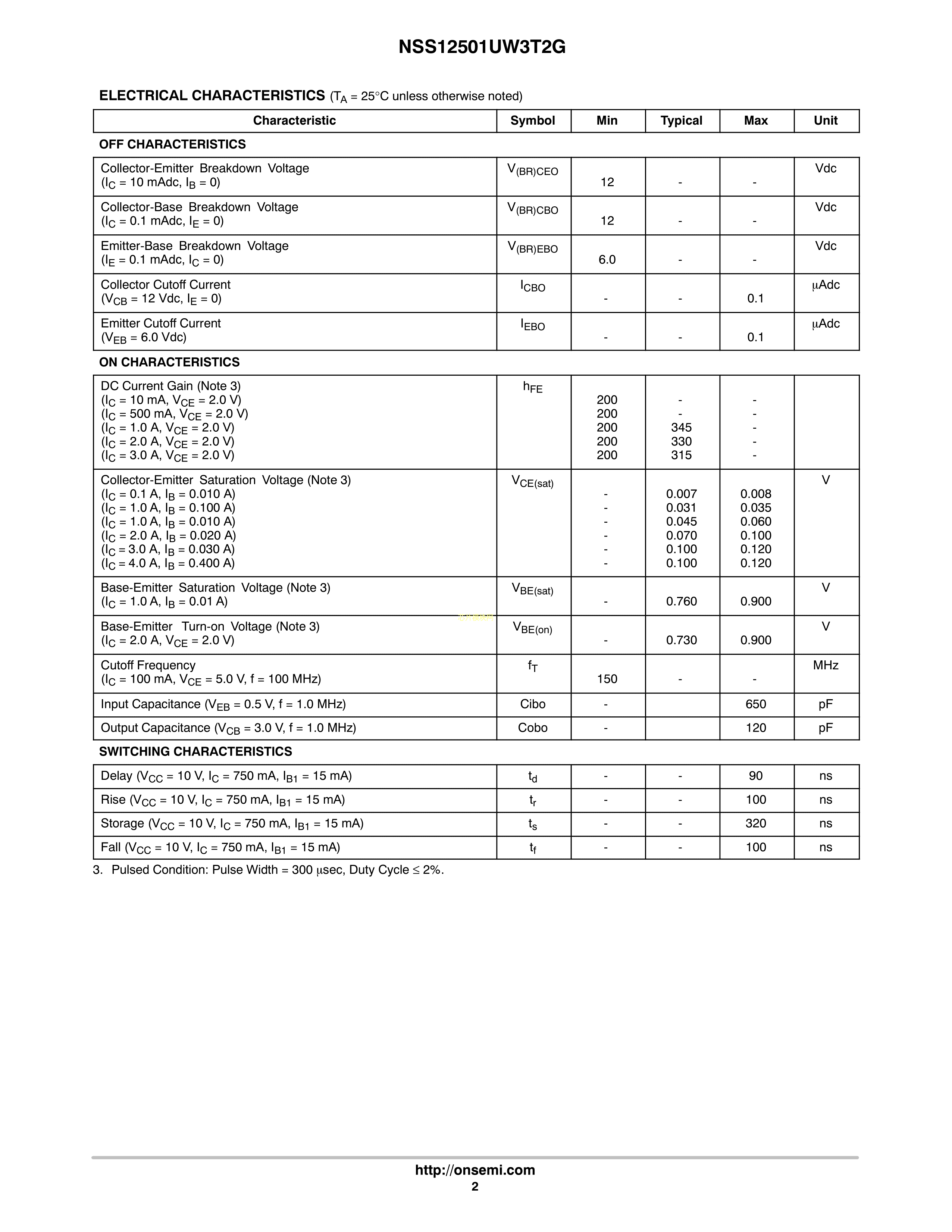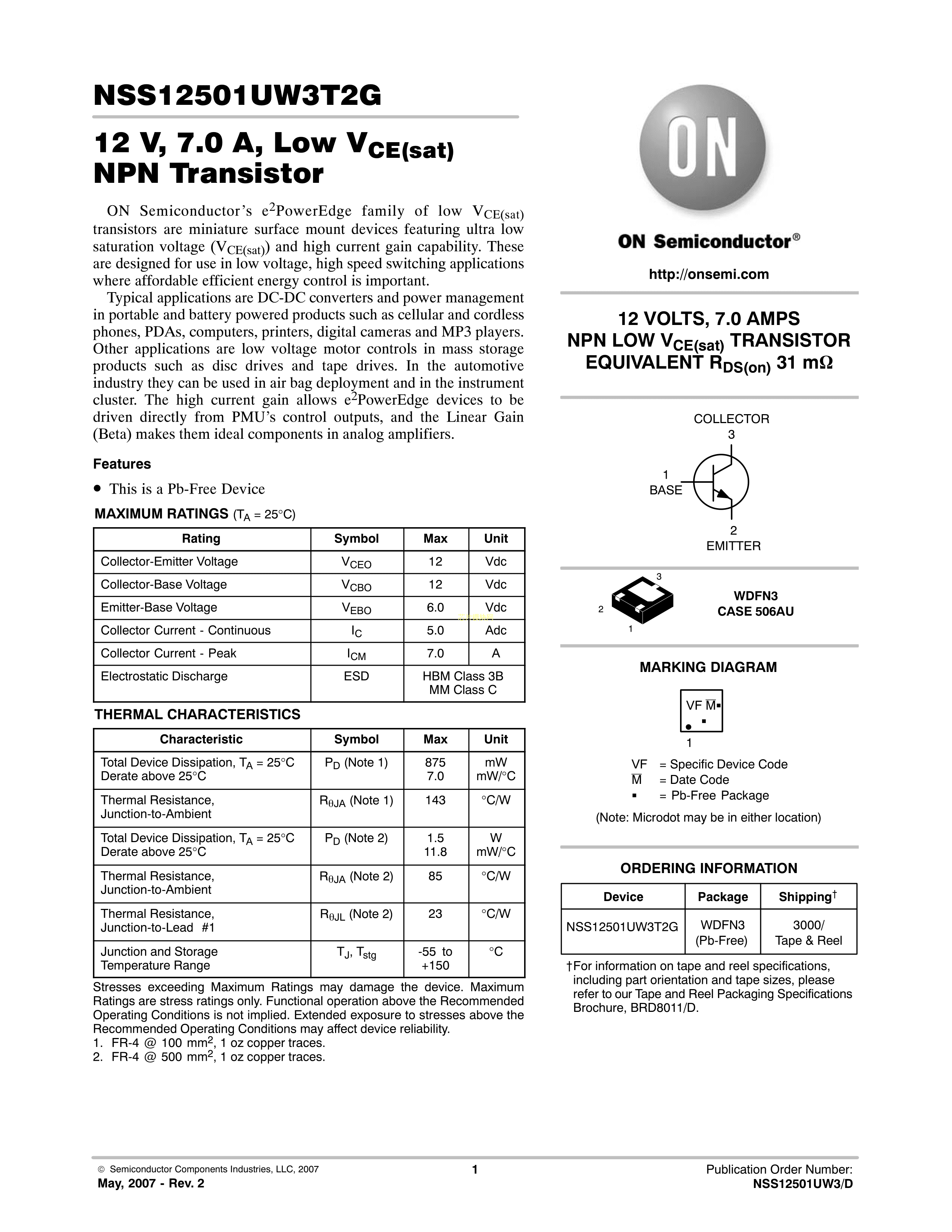 NSS12501UW3T2G数据手册WDFN-3封装onsemi(安森美)PDF规格书,中英文下载