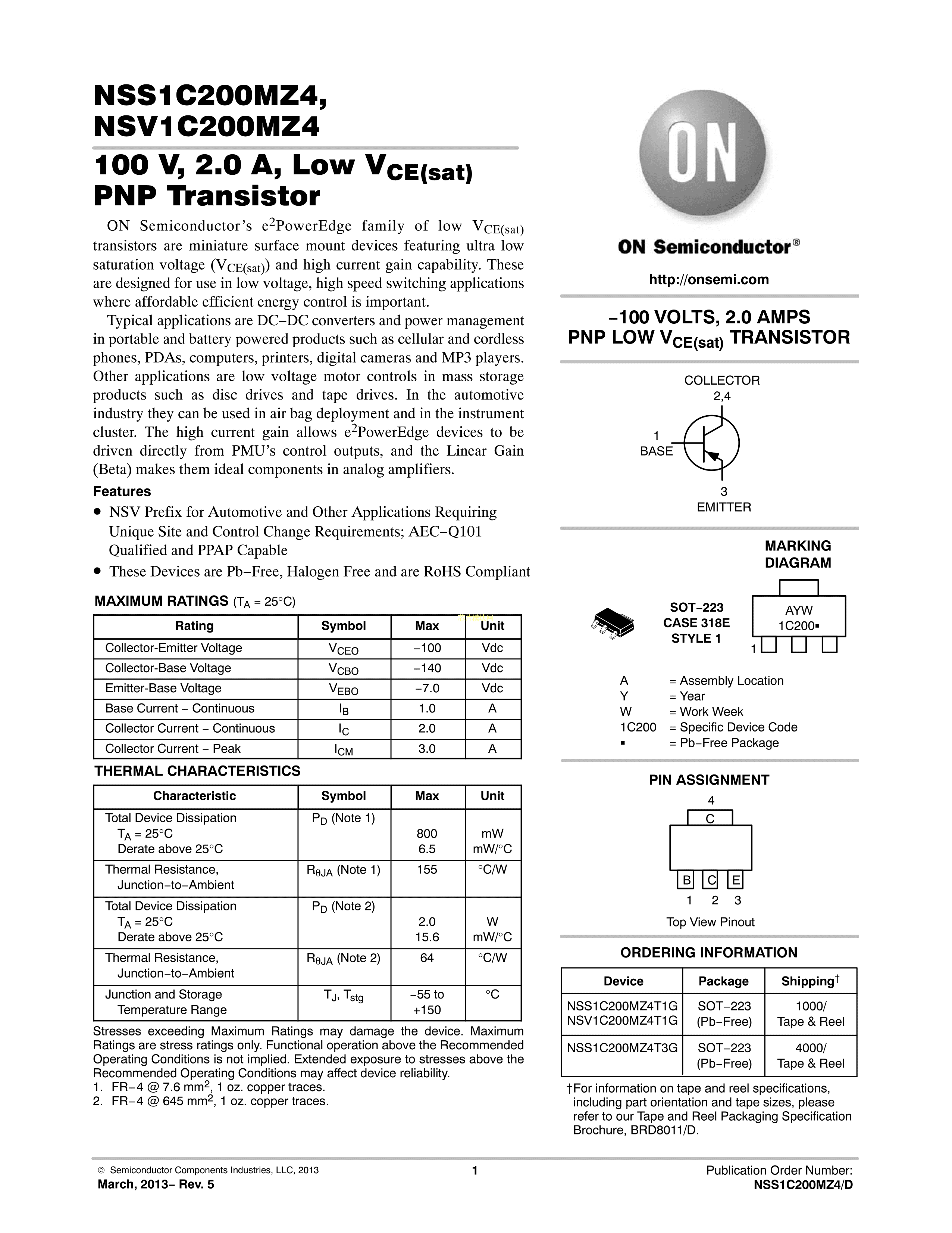 NSS1C200MZ4T1G数据手册SOT-223封装onsemi(安森美)PDF规格书,中英文下载