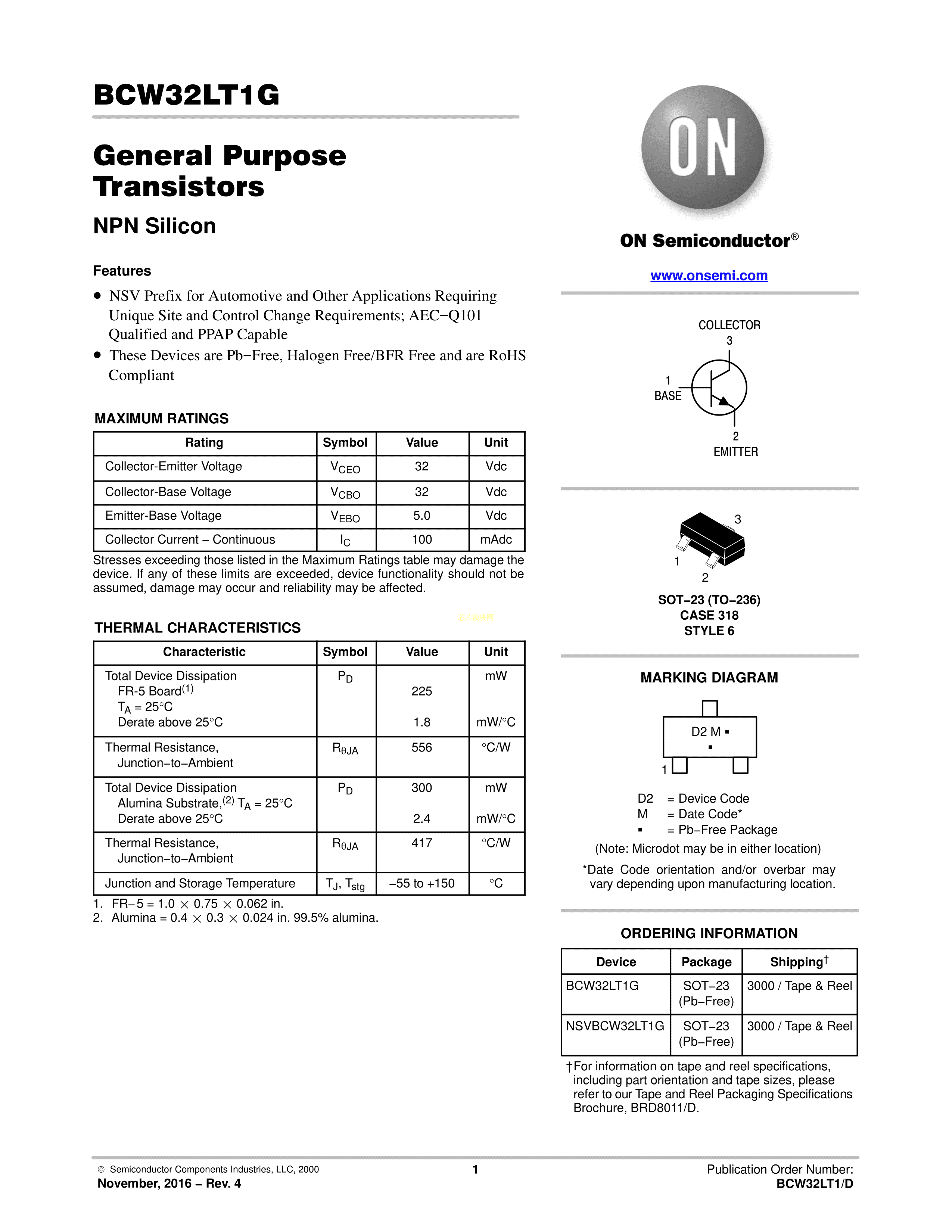 NSVBCW32LT1G数据手册SOT-23封装onsemi(安森美)PDF规格书,中英文下载