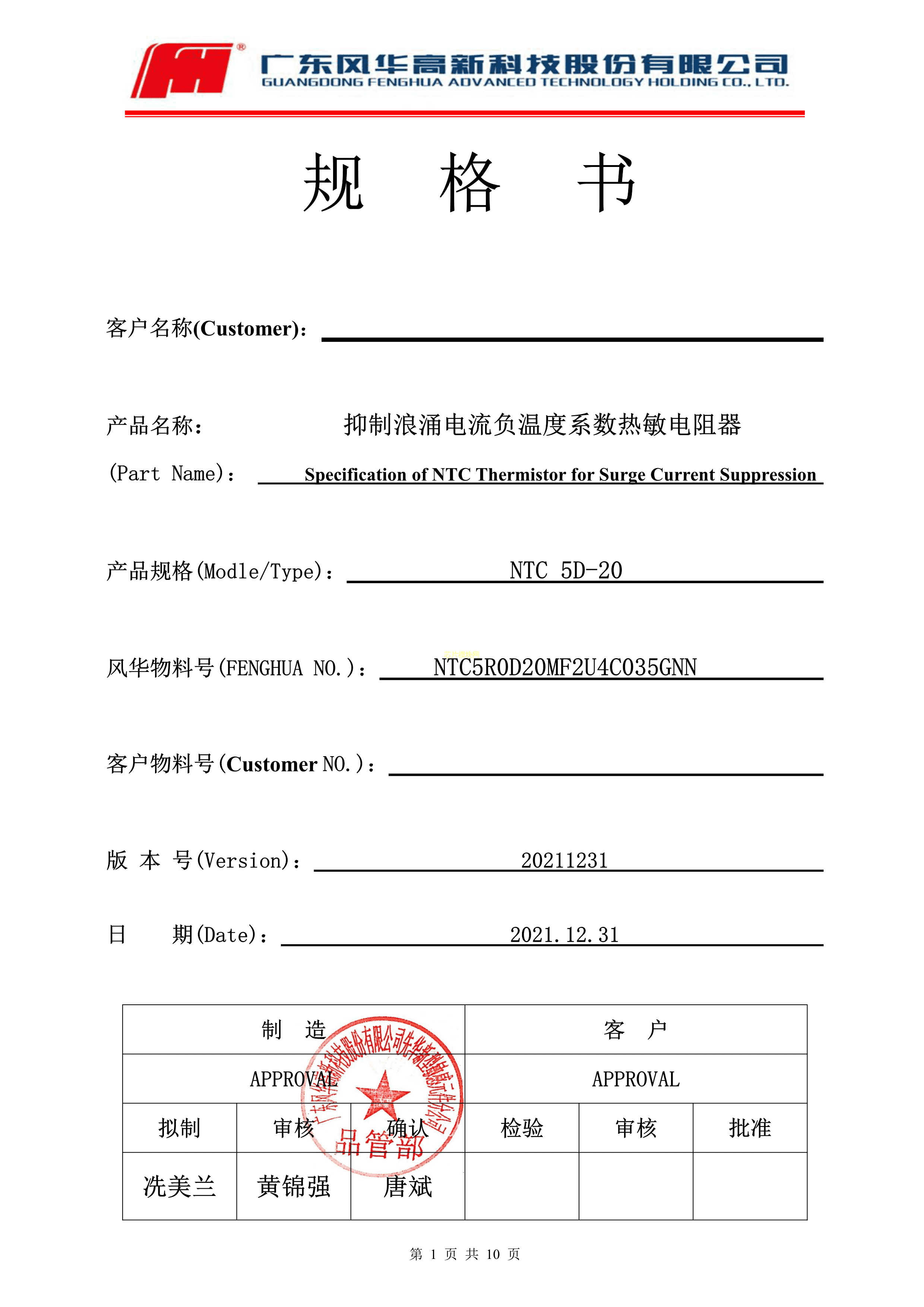 NTC5R0D20MF2U4C035GNN数据手册径向引线P7.5mm封装FH(风华)PDF规格书,中英文下载