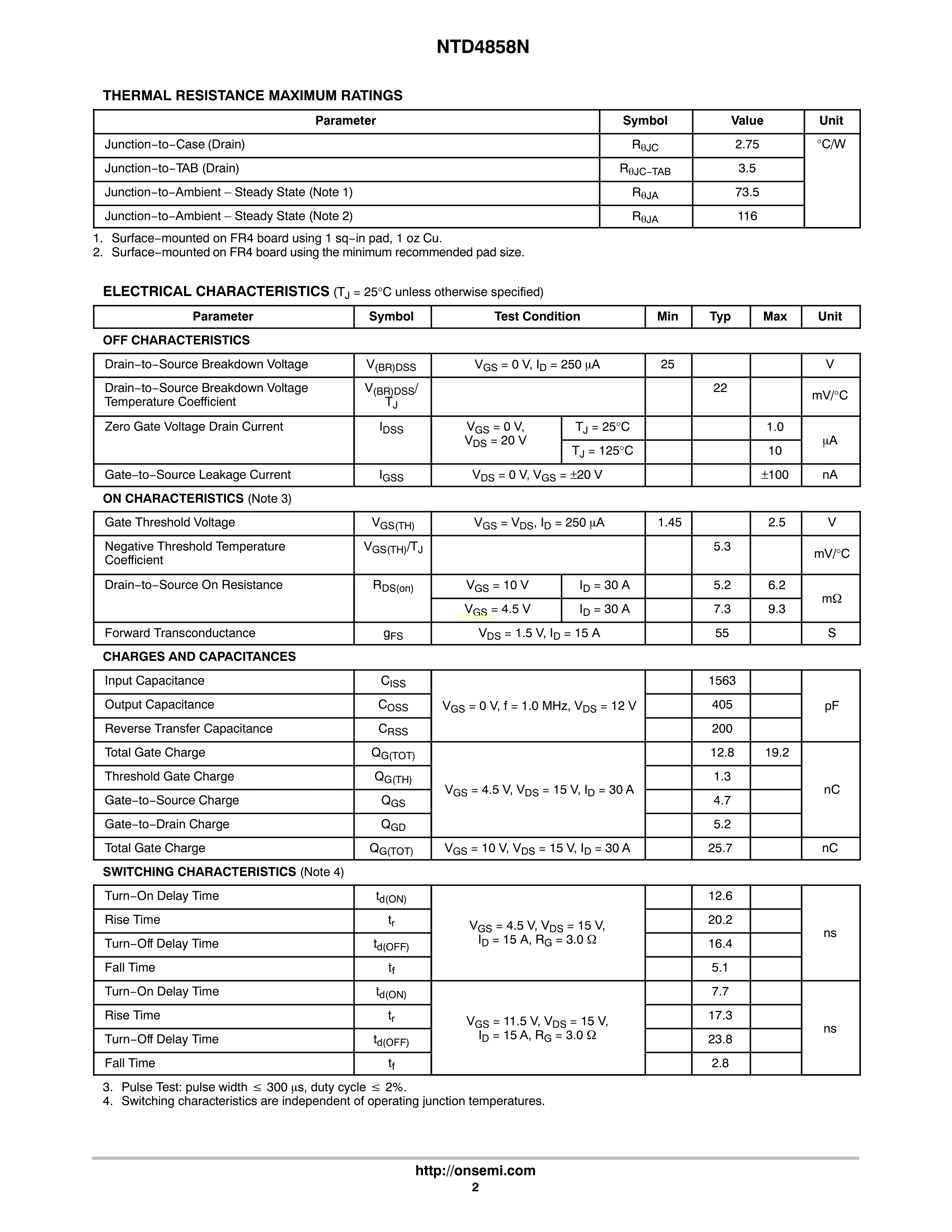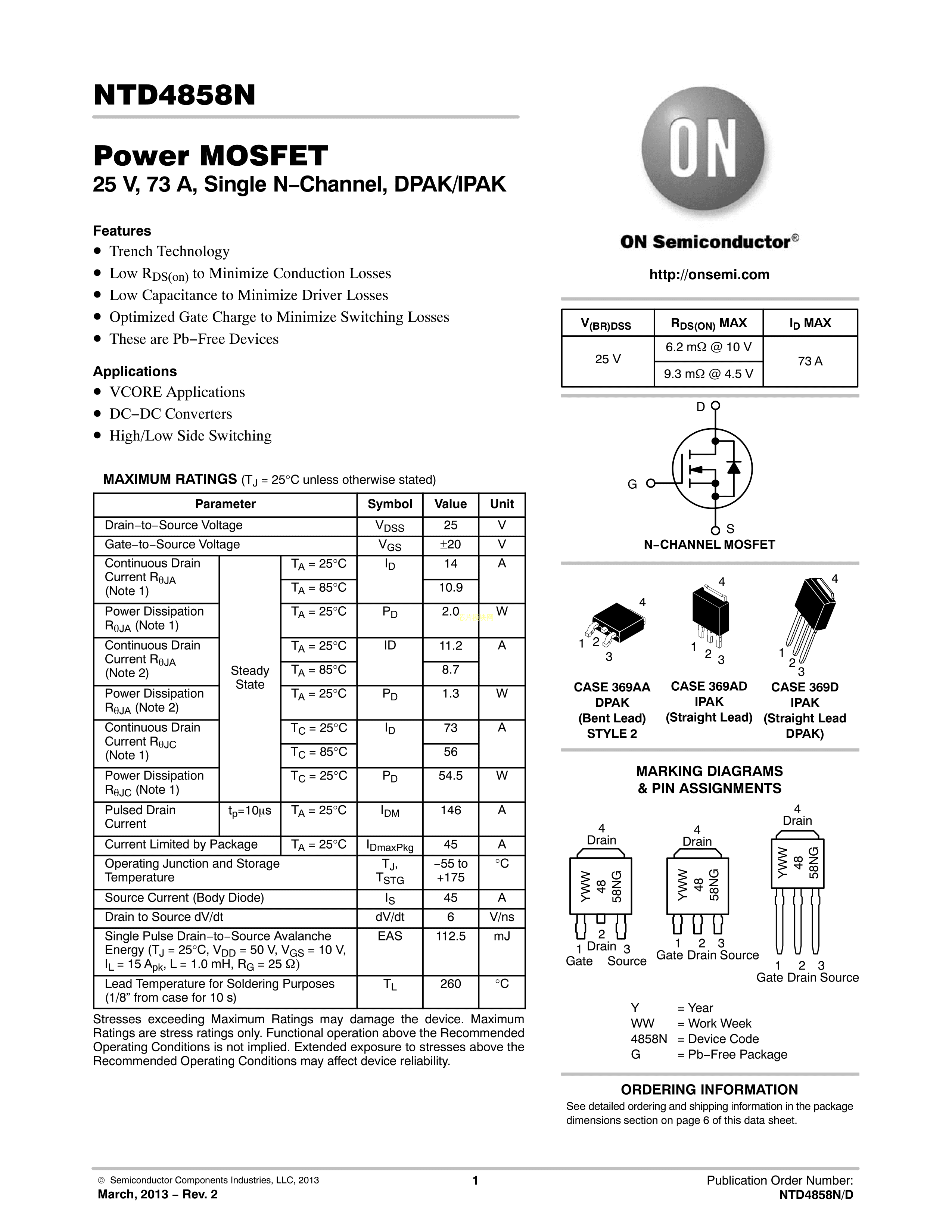 NTD4858NT4G数据手册TO-252-2(DPAK)封装onsemi(安森美)PDF规格书,中