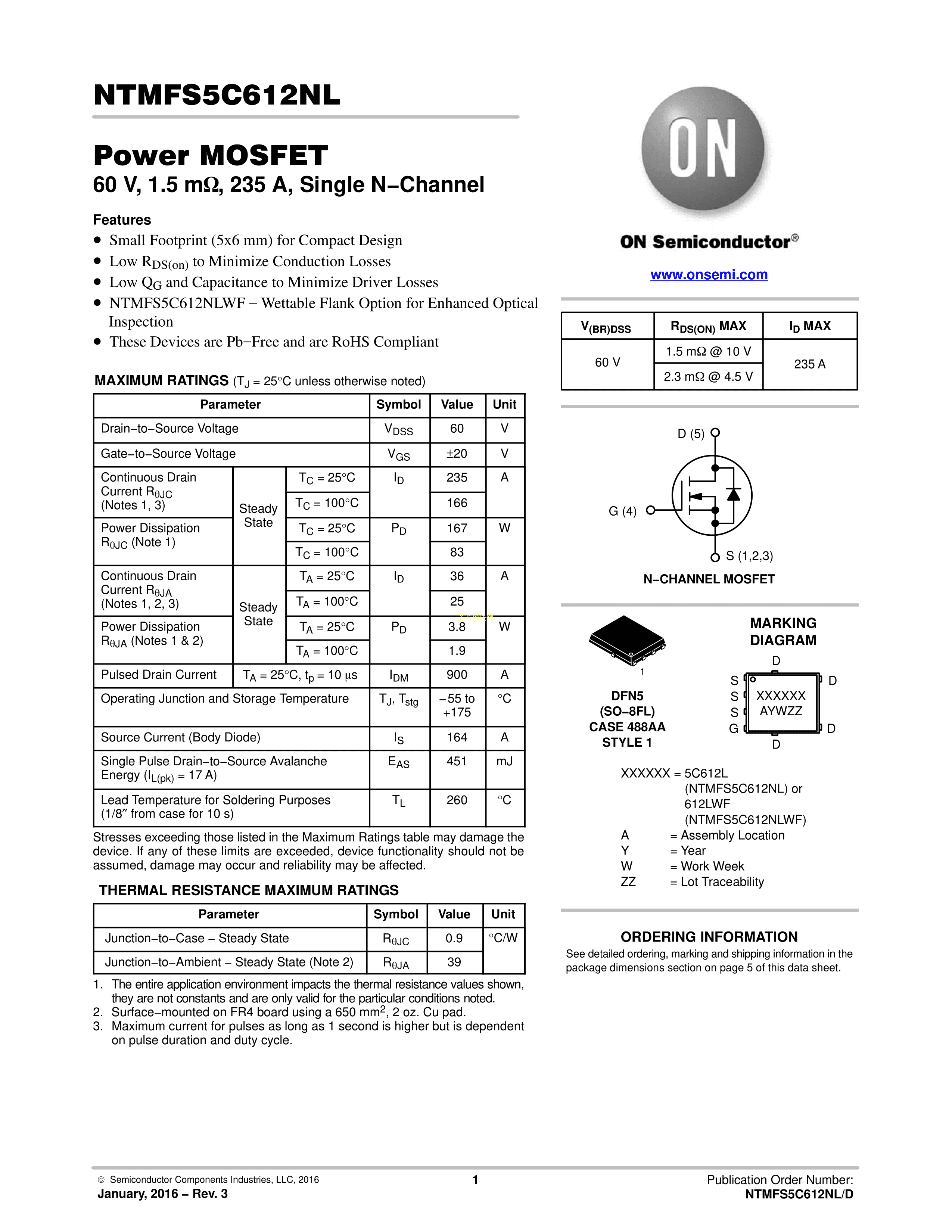 NTMFS5C612NLT1G数据手册DFN-5封装onsemi(安森美)PDF规格书,中英文下载
