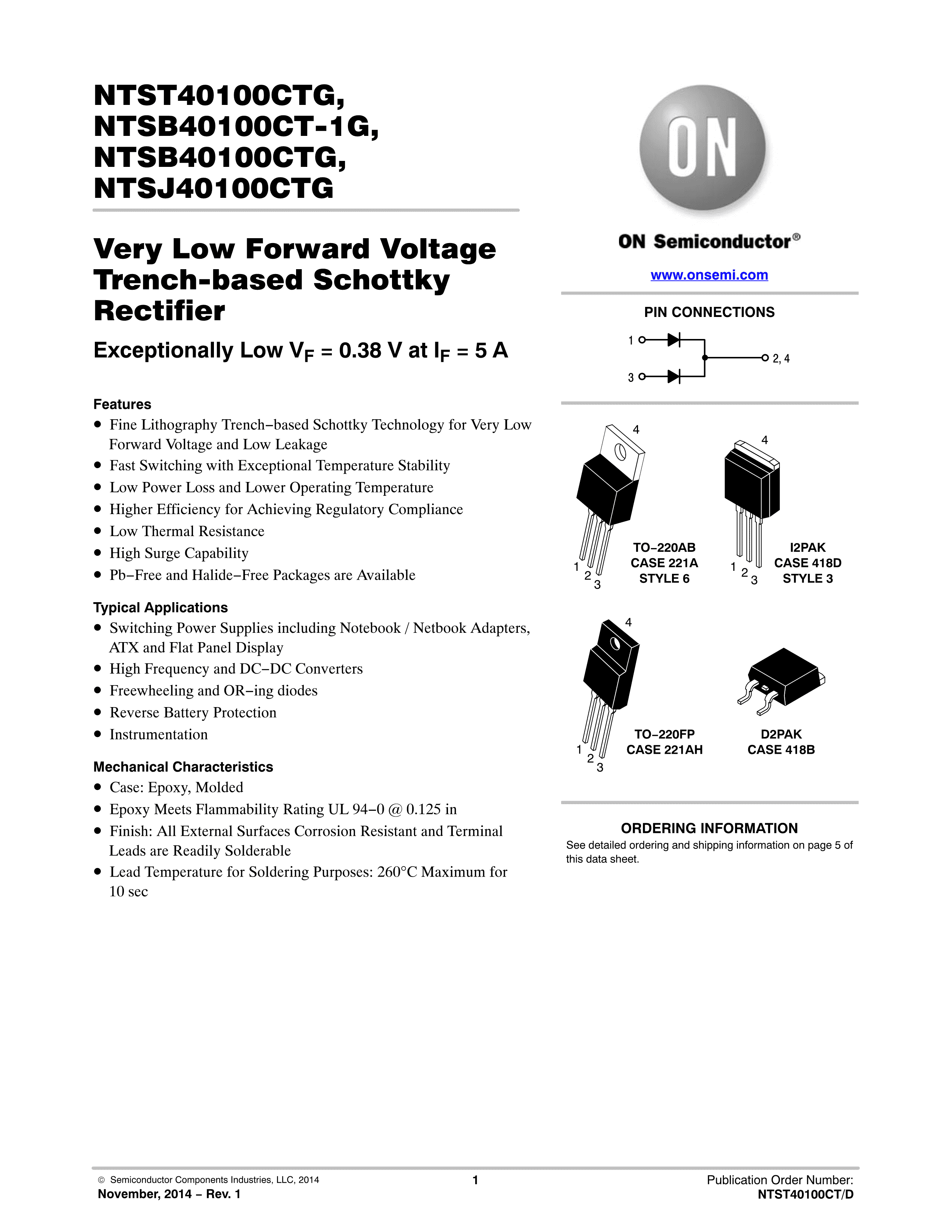 NTSB40100CT-1G数据手册I2PAK封装onsemi(安森美)PDF规格书,中英文下载
