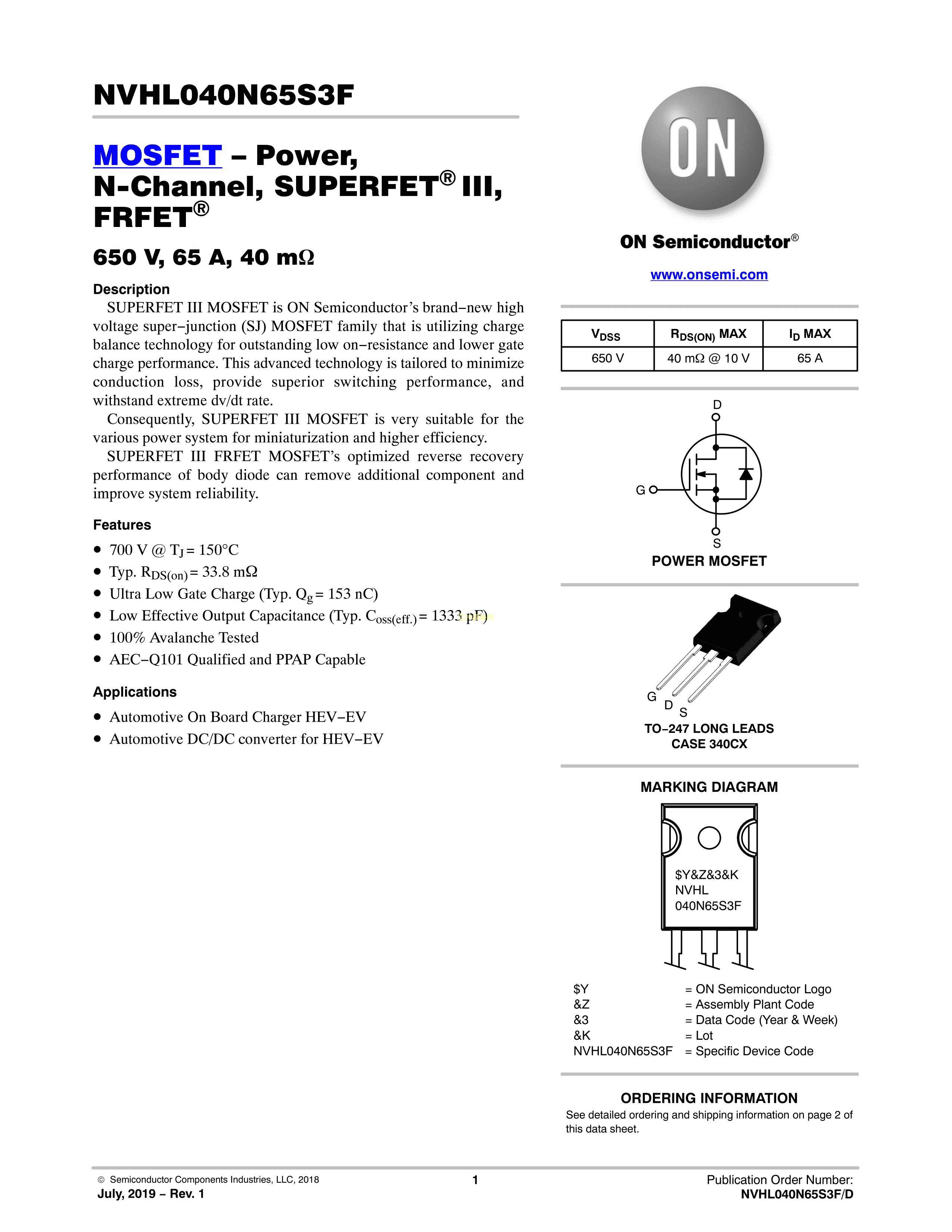 NVHL040N65S3F数据手册TO-247封装onsemi(安森美)PDF规格书,中英文下载