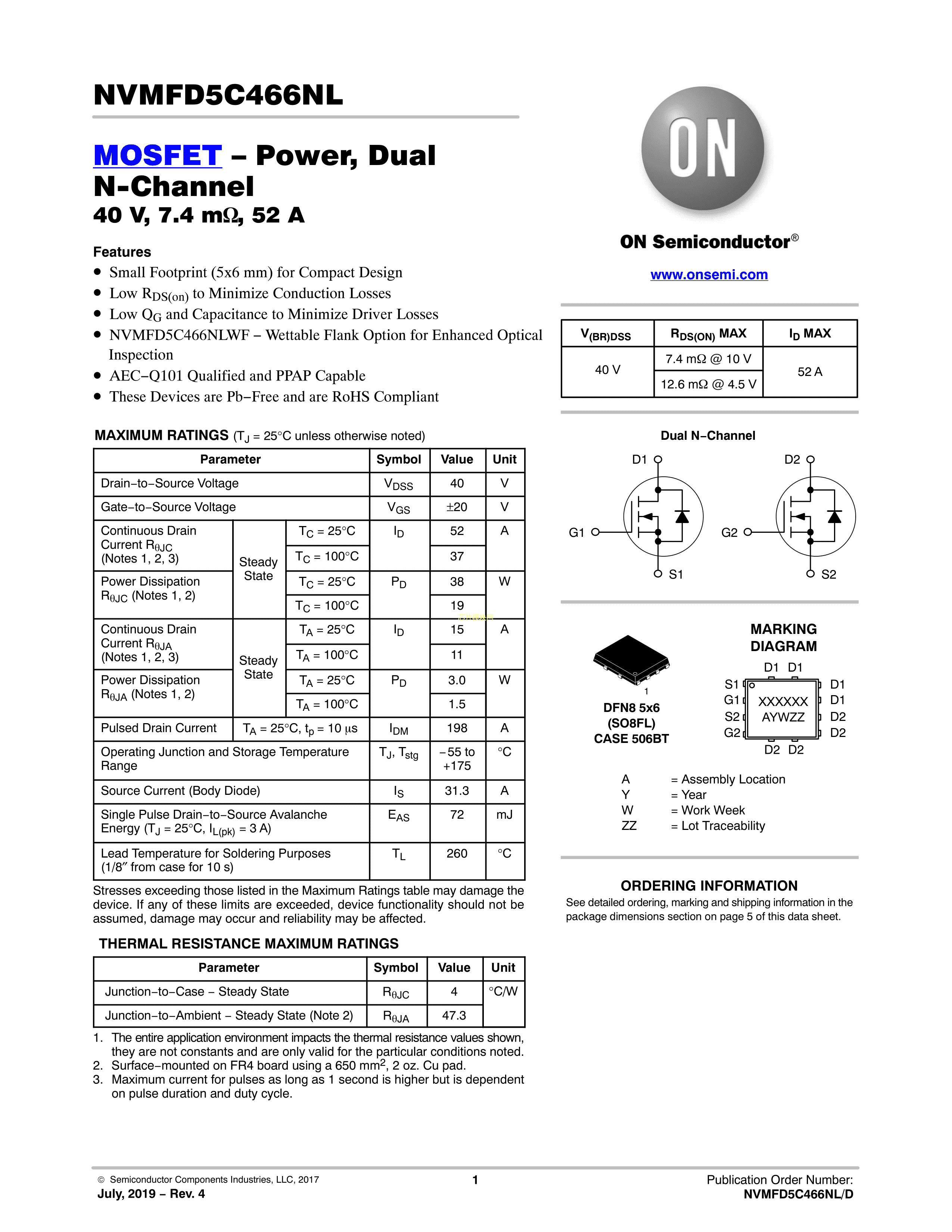 NVMFD5C466NLWFT1G数据手册DFN-8封装onsemi(安森美)PDF规格书,中英文下