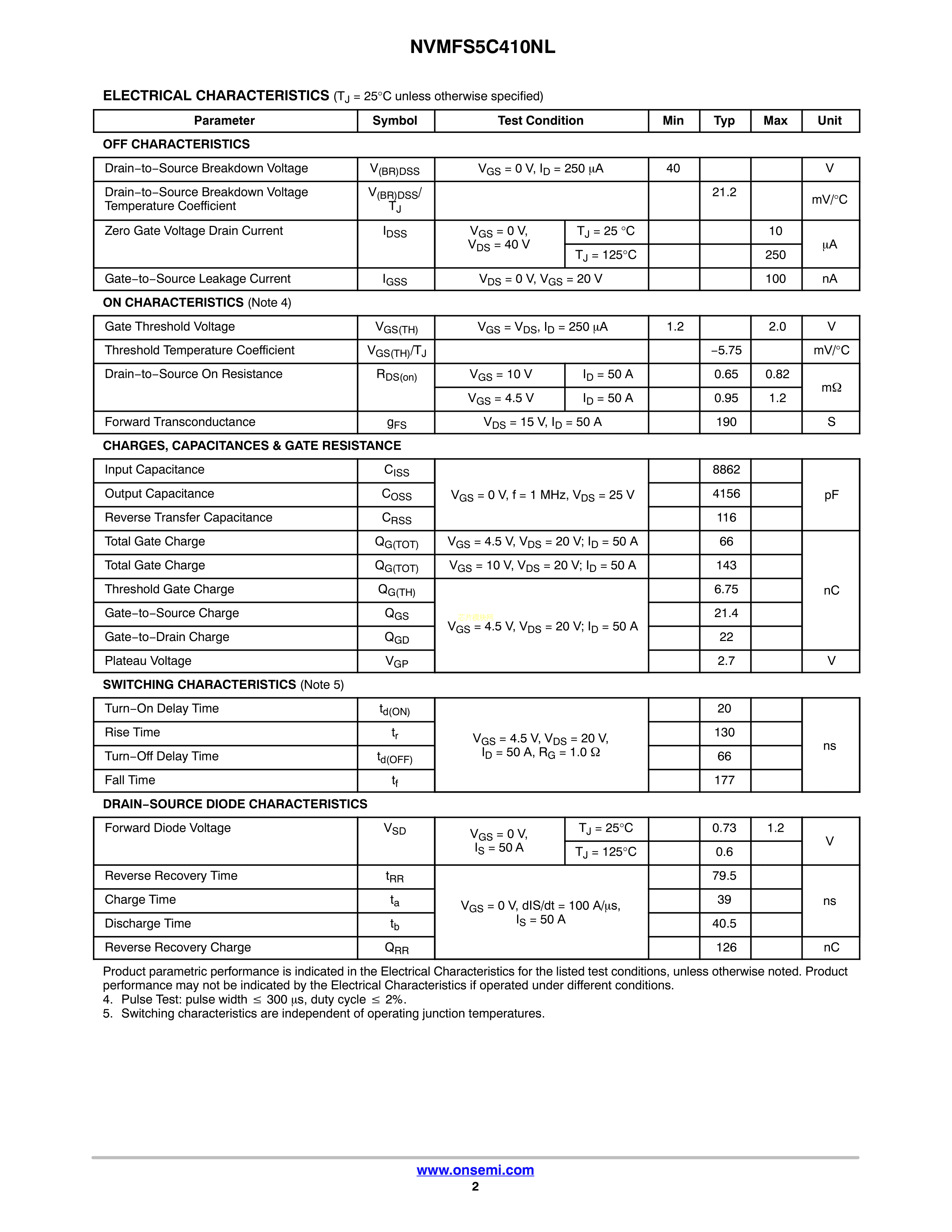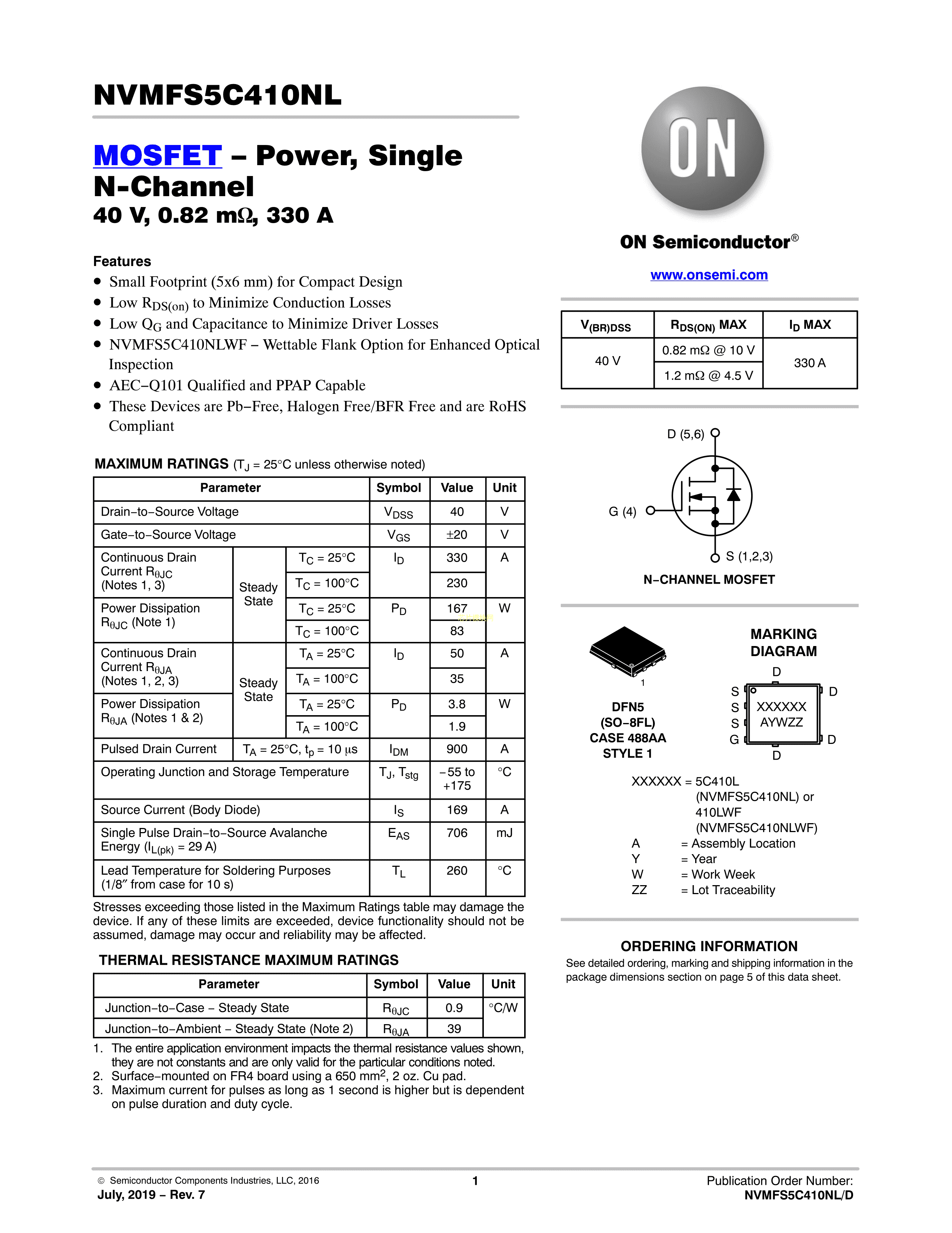 NVMFS5C410NLWFAFT1G数据手册DFN-5封装onsemi(安森美)PDF规格书,中英