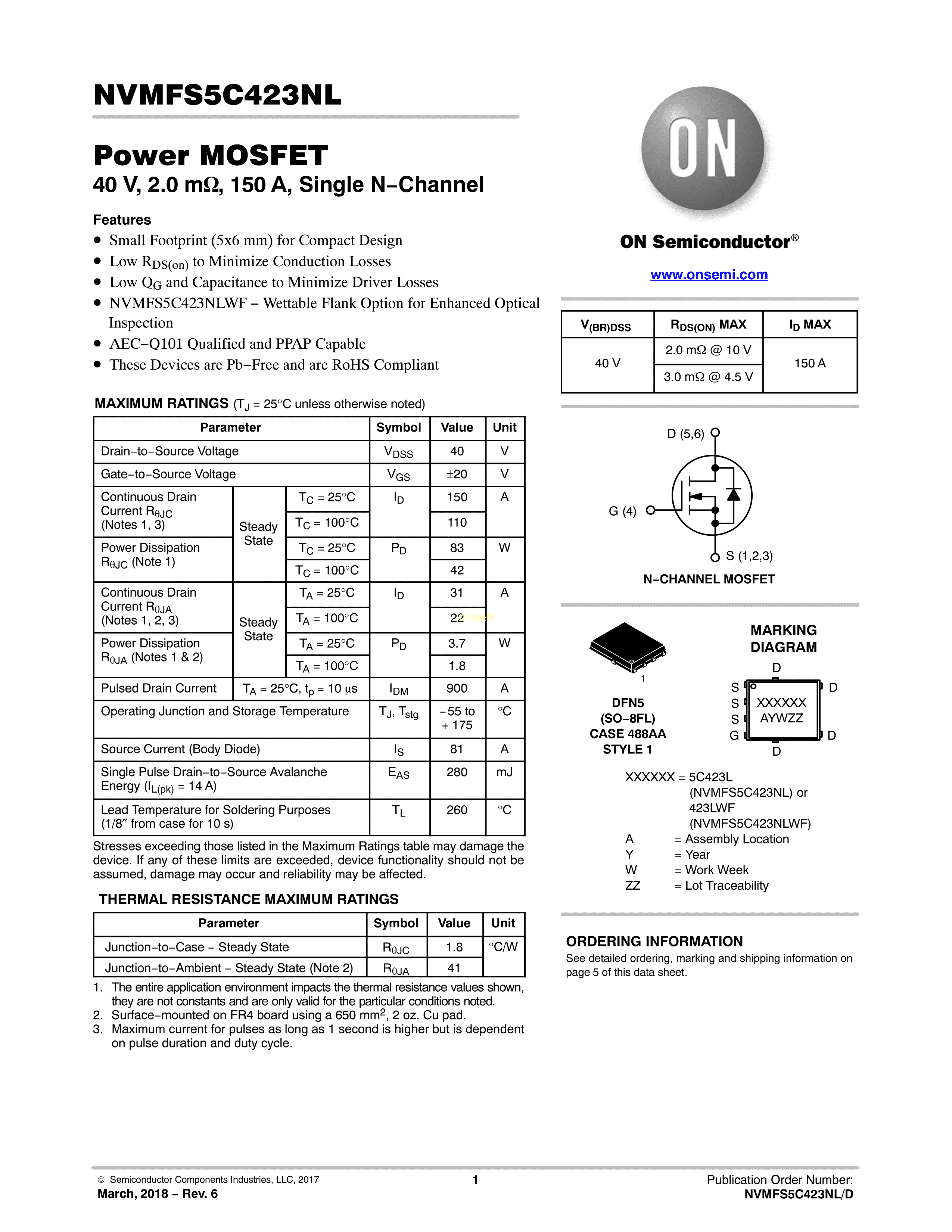NVMFS5C423NLWFAFT1G数据手册DFN-5封装onsemi(安森美)PDF规格书,中英