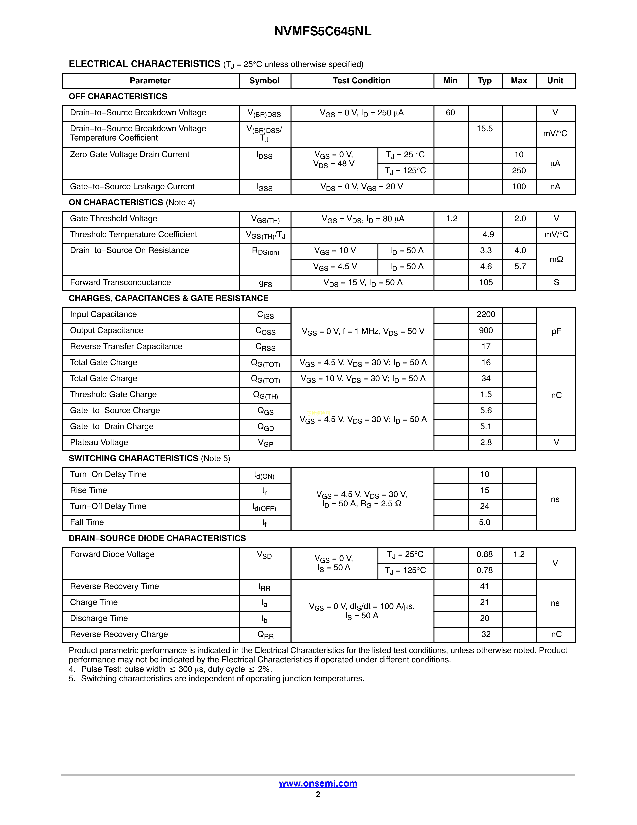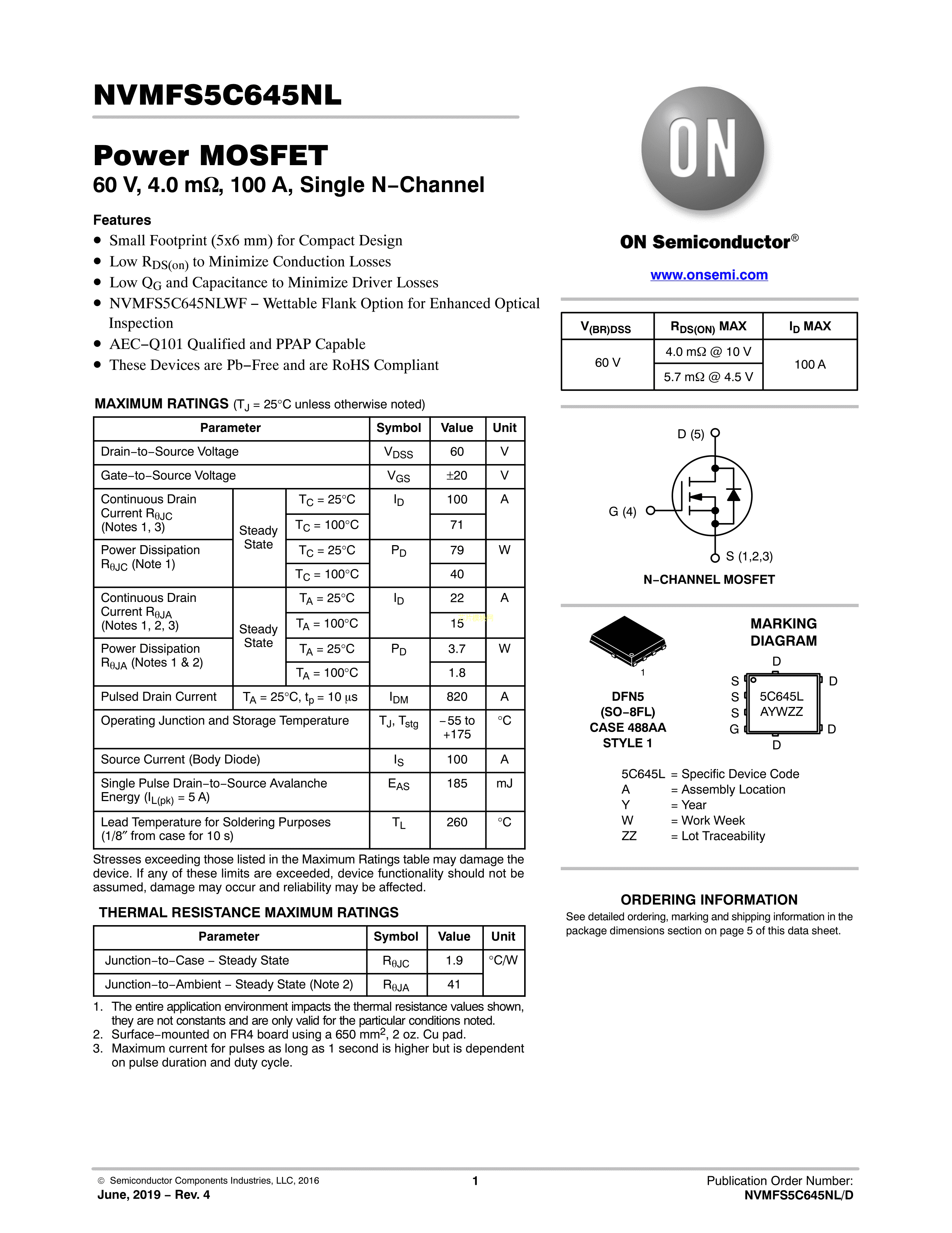 NVMFS5C645NLWFAFT1G数据手册DFN-5封装onsemi(安森美)PDF规格书,中英