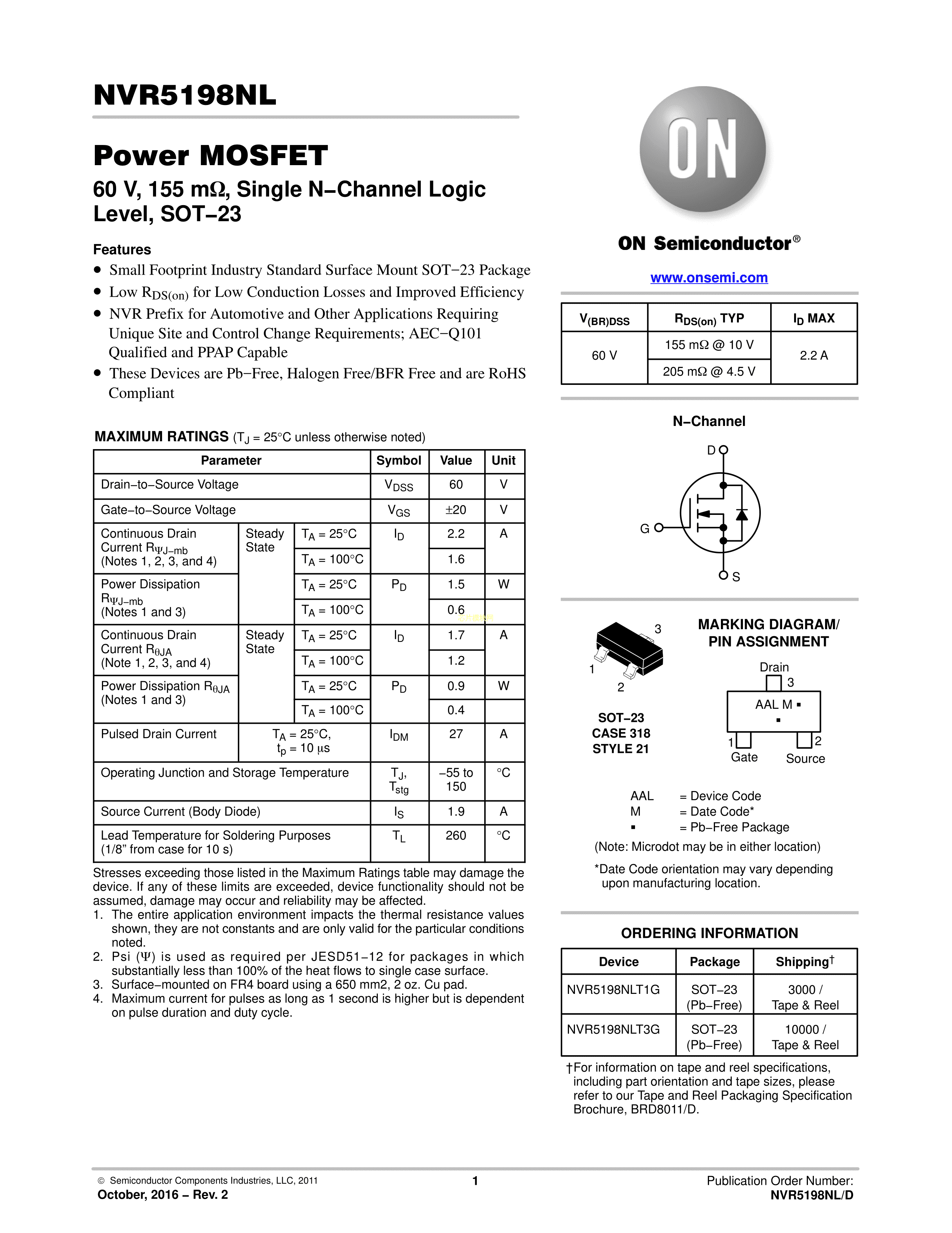 NVR5198NLT1G数据手册SOT-23(SOT-23-3)封装onsemi(安森美)PDF规格