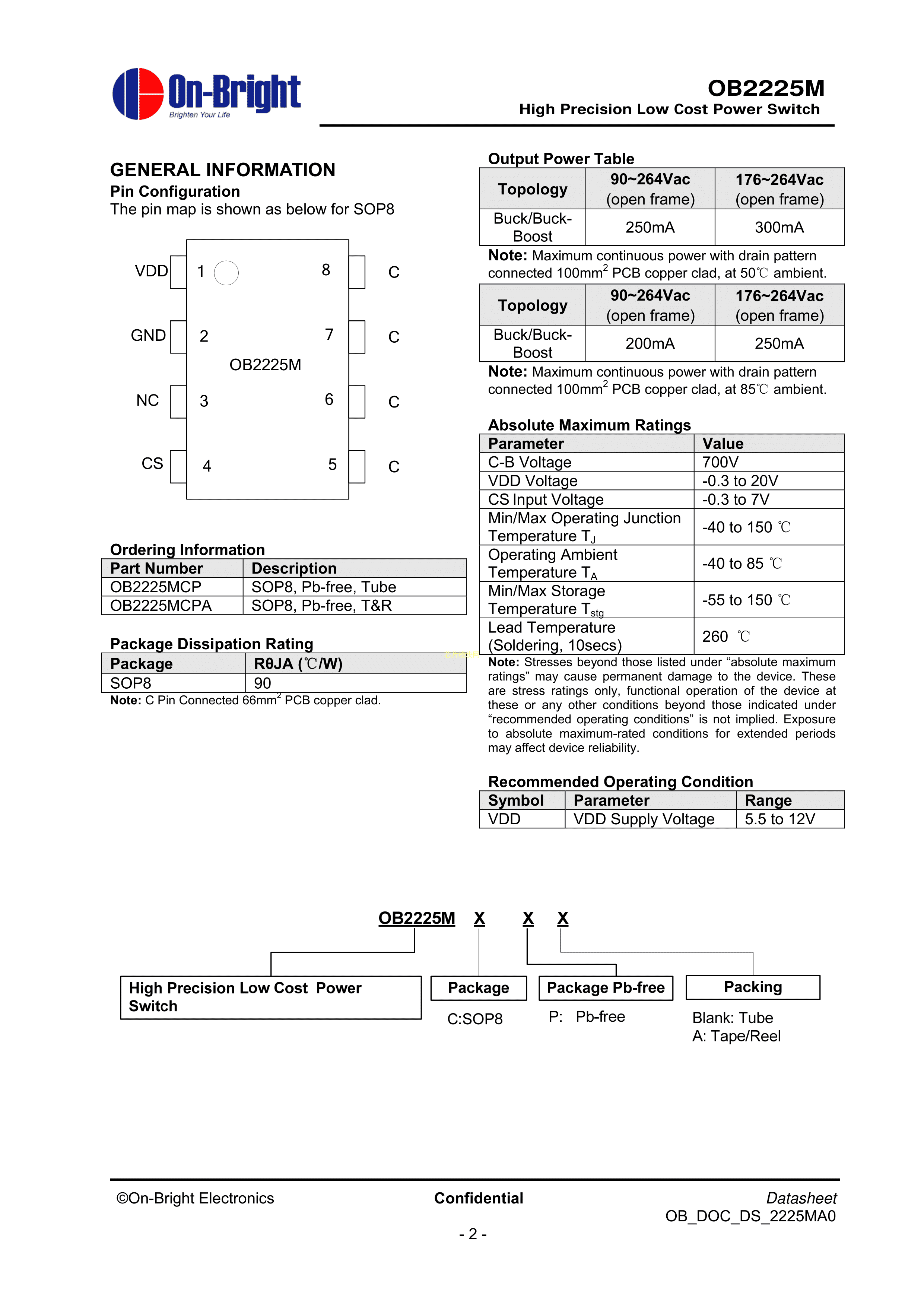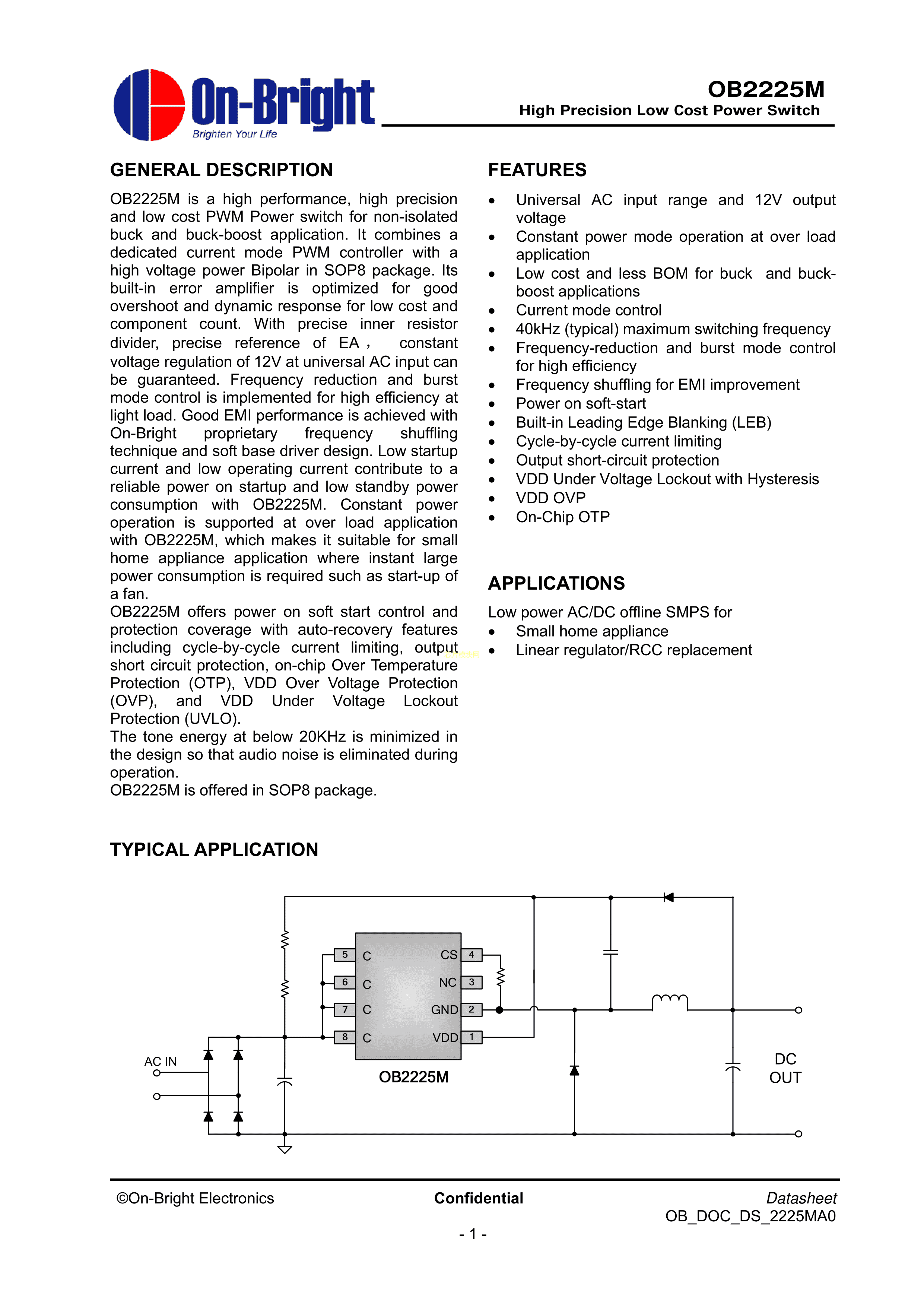 OB2225MCPA数据手册SOP-8封装OB(昂宝)PDF规格书,中英文下载