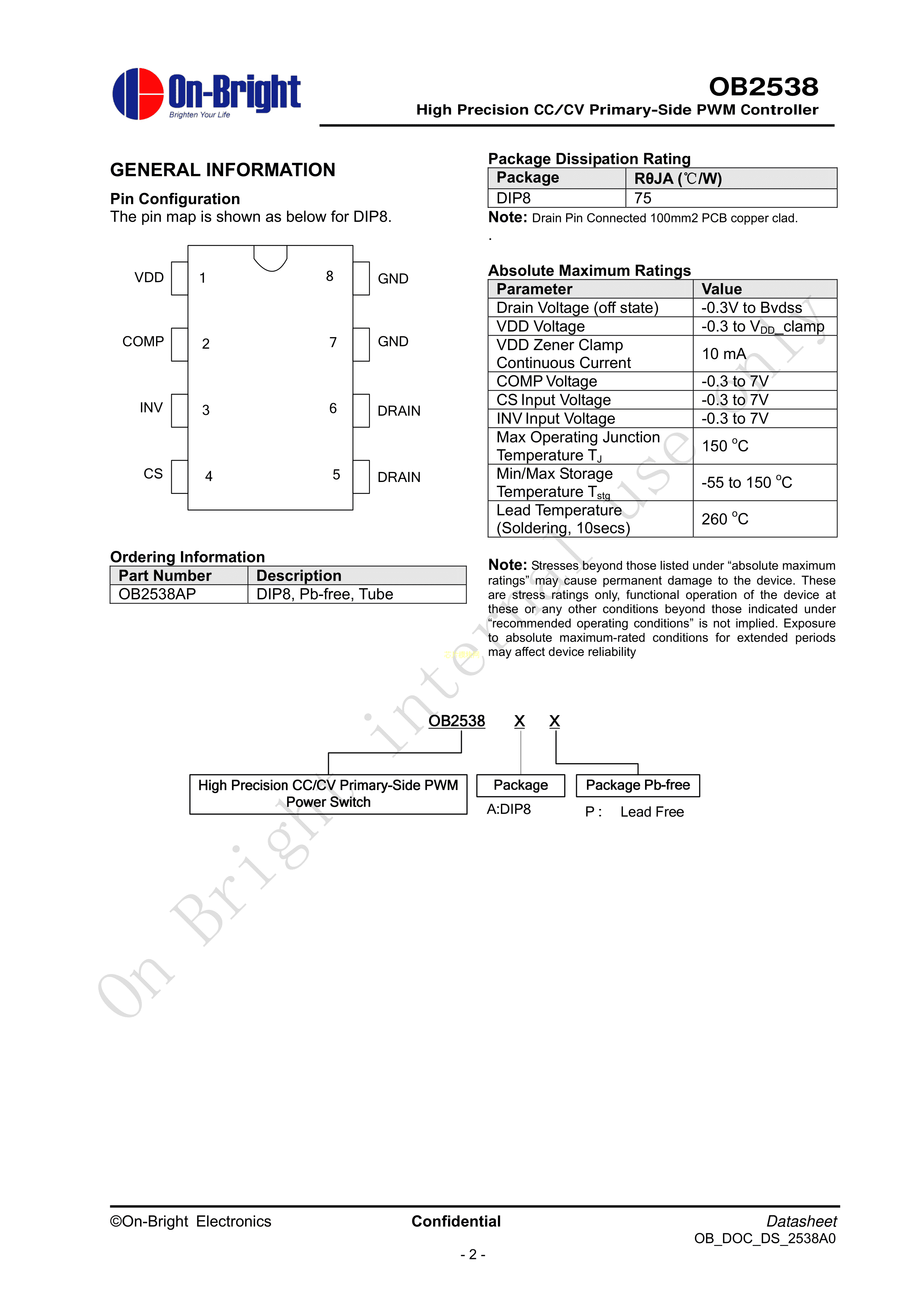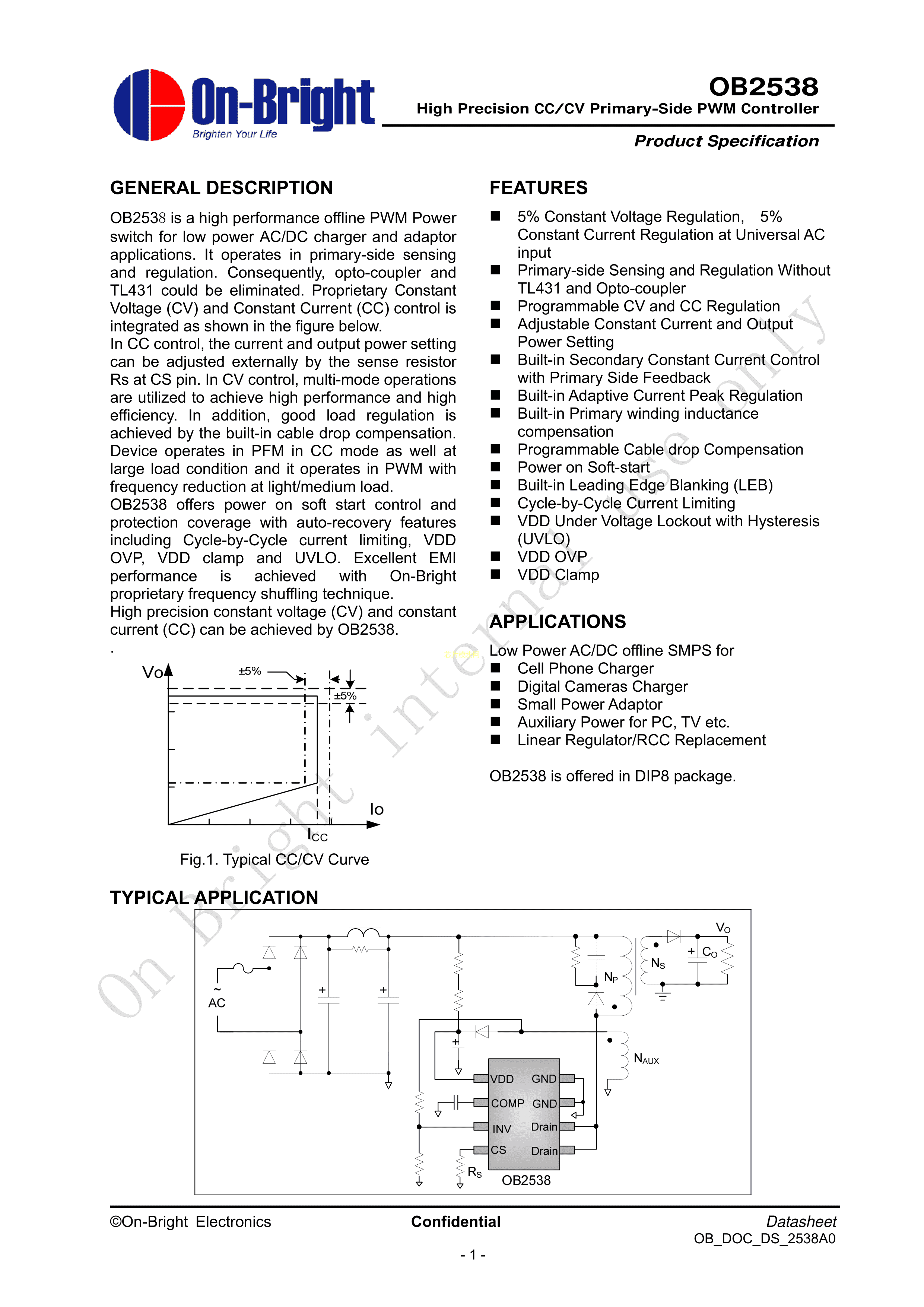 OB2538AP数据手册DIP-8封装OB(昂宝)PDF规格书,中英文下载