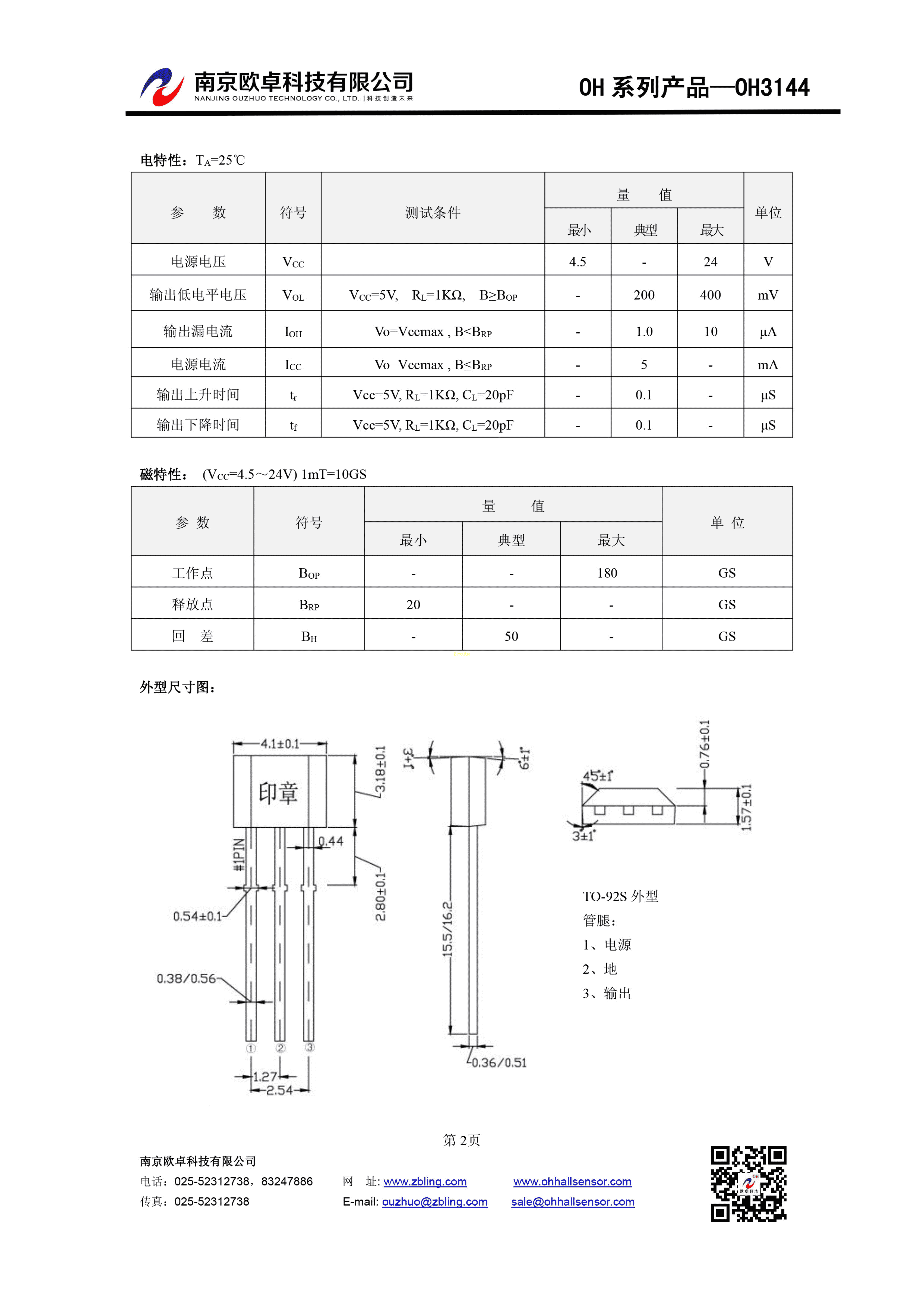 OH3144数据手册TO-92S封装南京欧卓PDF规格书,中英文下载