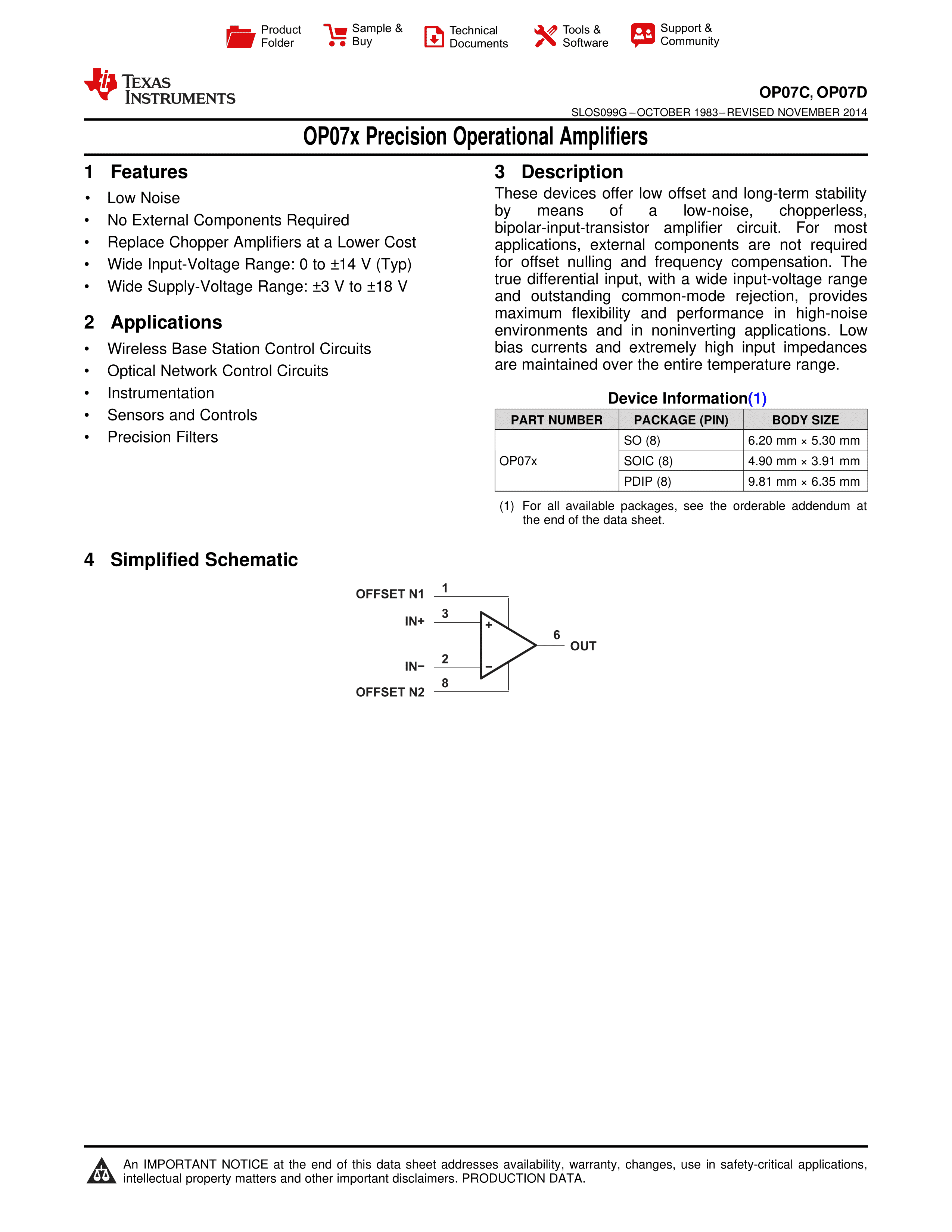 OP-07DPSR数据手册SOIC-8_208mil封装TI(德州仪器)PDF规格书,中英文下载