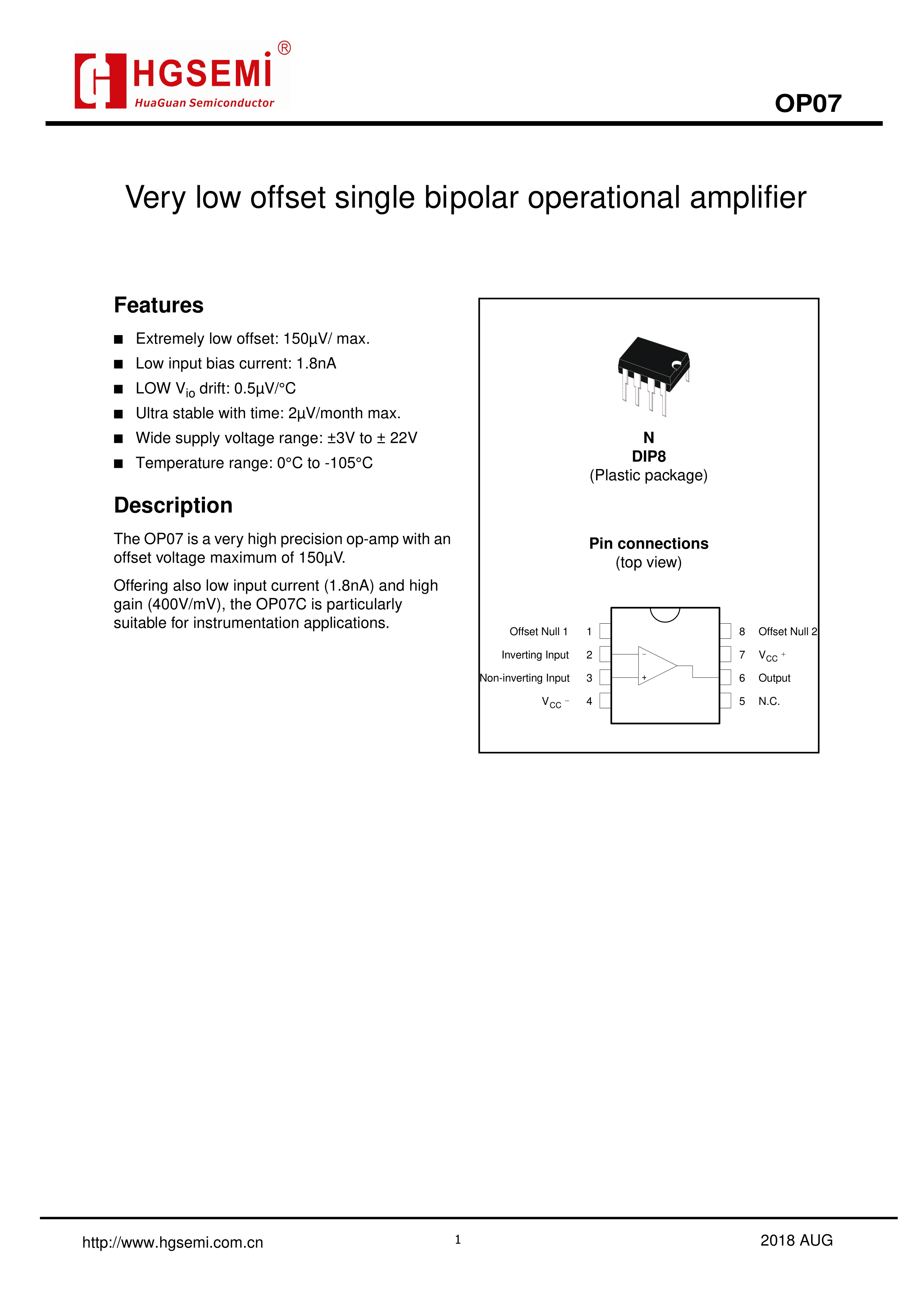 OP07N数据手册DIP-8封装HGSEMI(华冠)PDF规格书,中英文下载