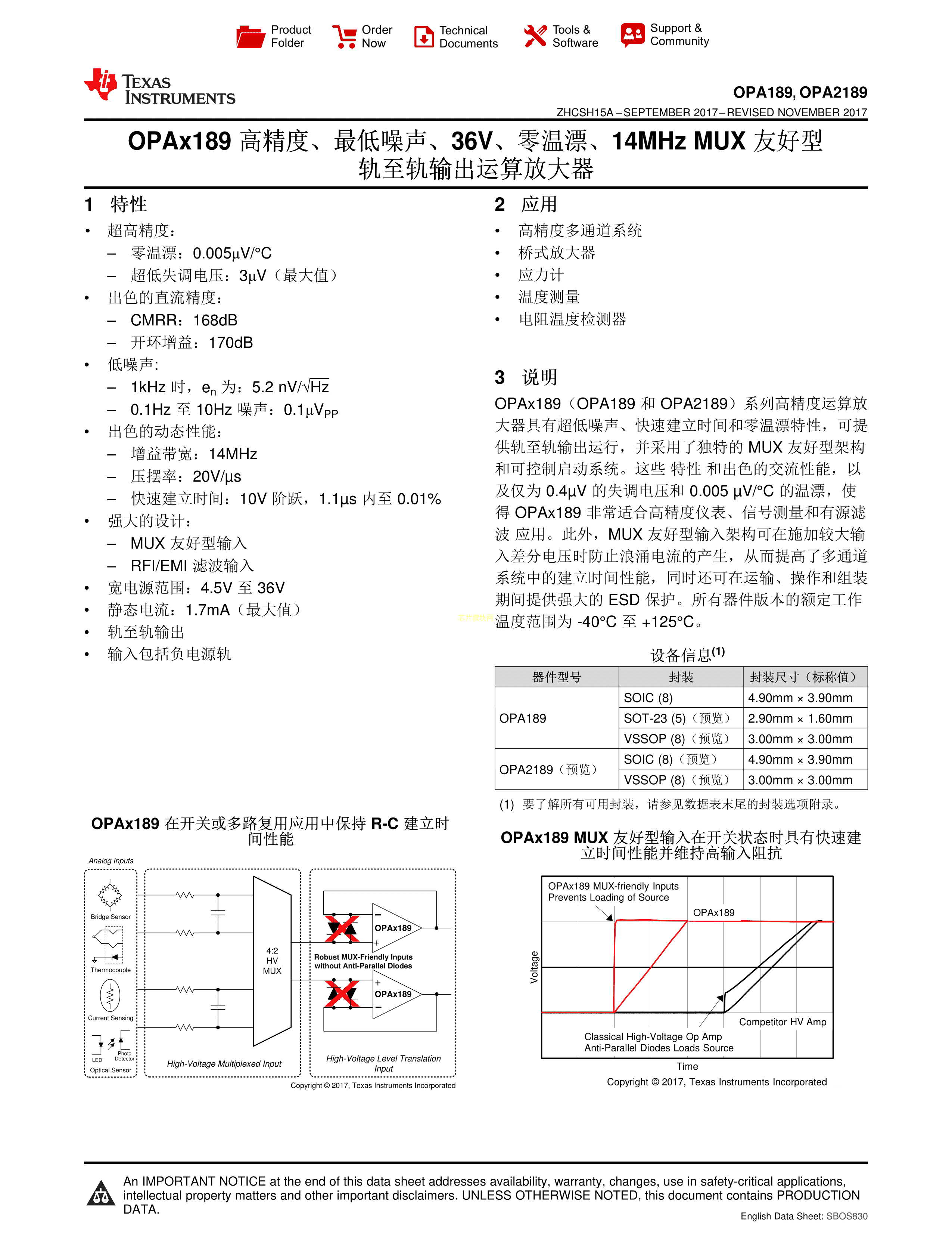 OPA189IDR数据手册SOIC-8封装TI(德州仪器)PDF规格书,中英文下载