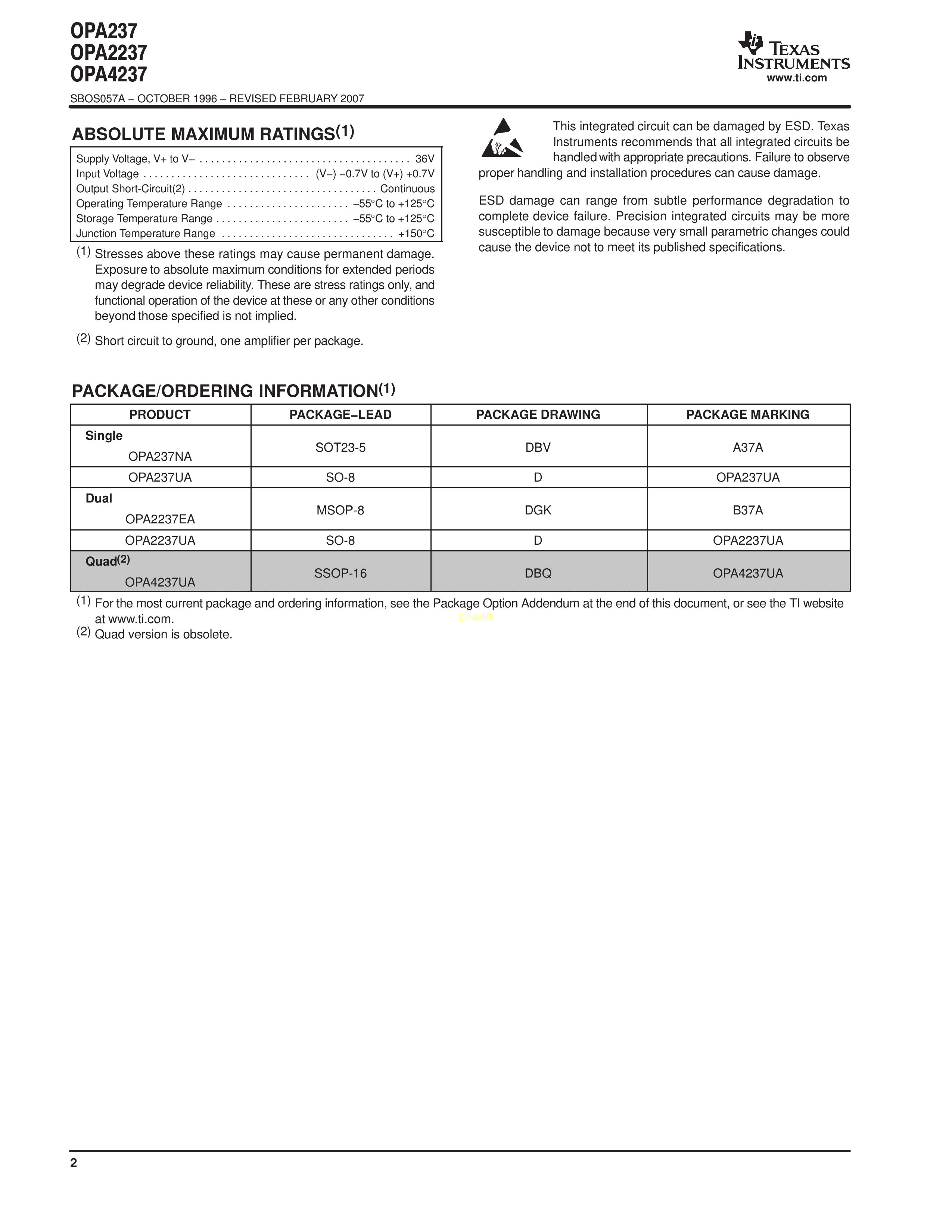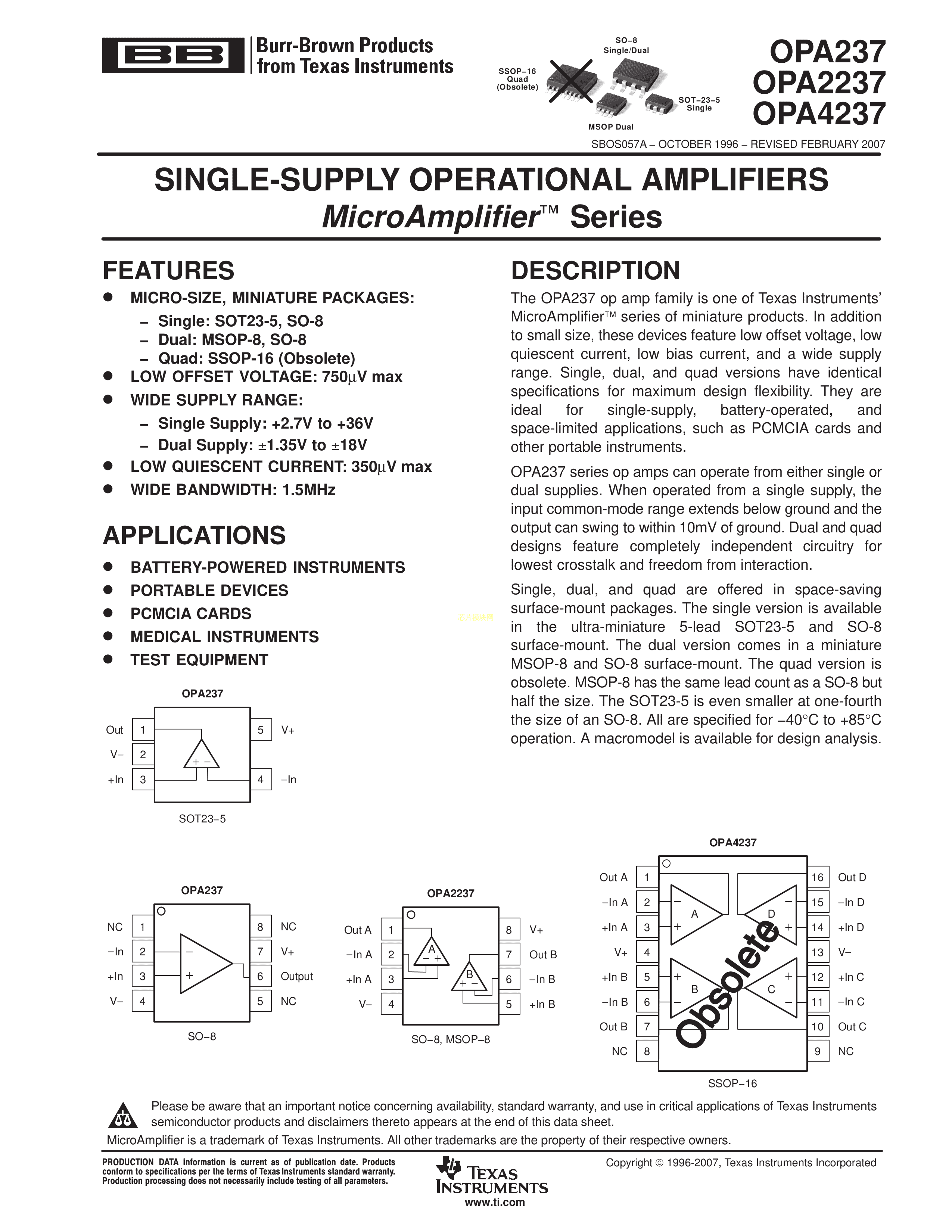 OPA237NA-250数据手册SOT-23-5封装TI(德州仪器)PDF规格书,中英文下载