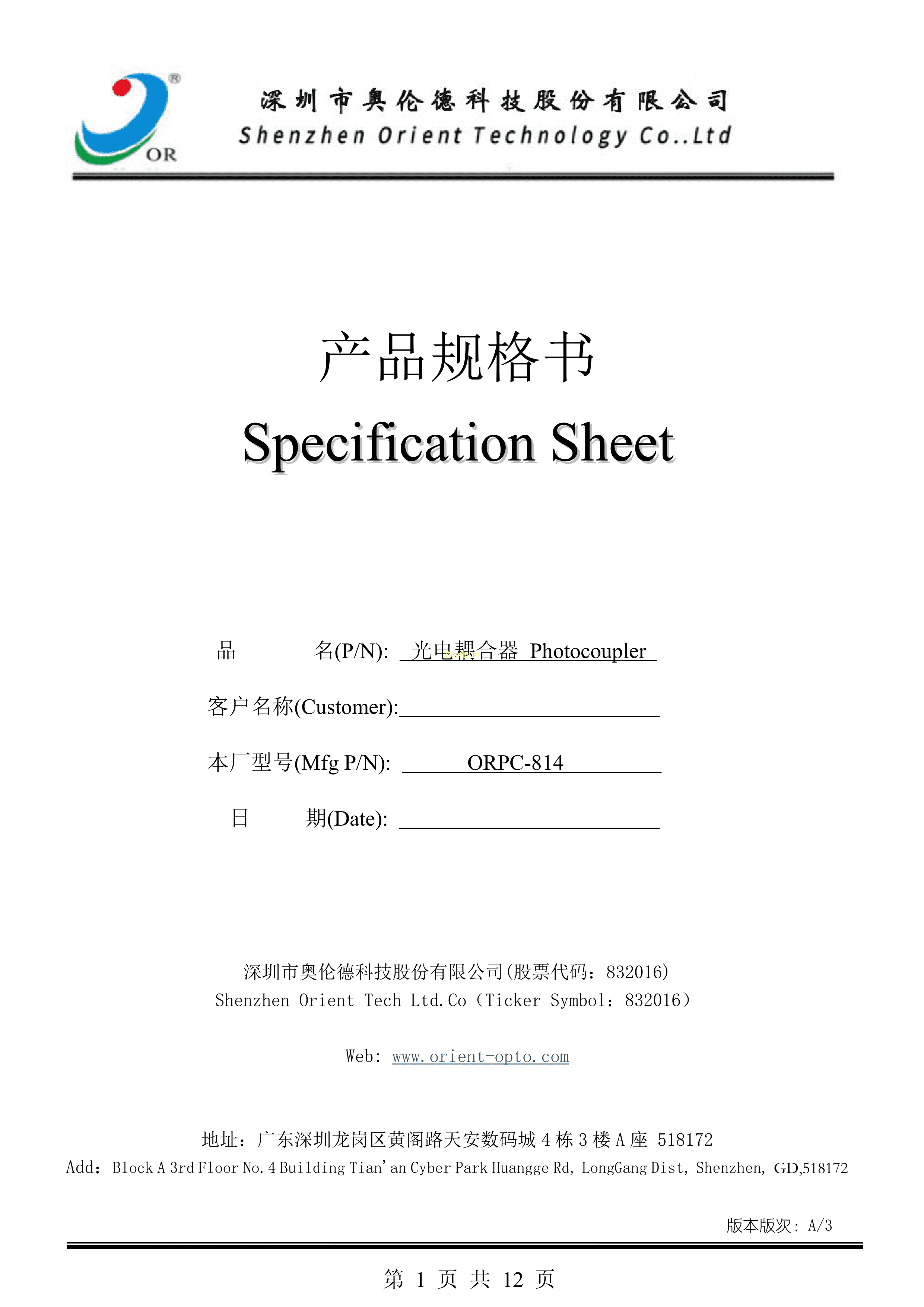 ORPC-814A数据手册DIP-4封装Orient(奥伦德)PDF规格书,中英文下载