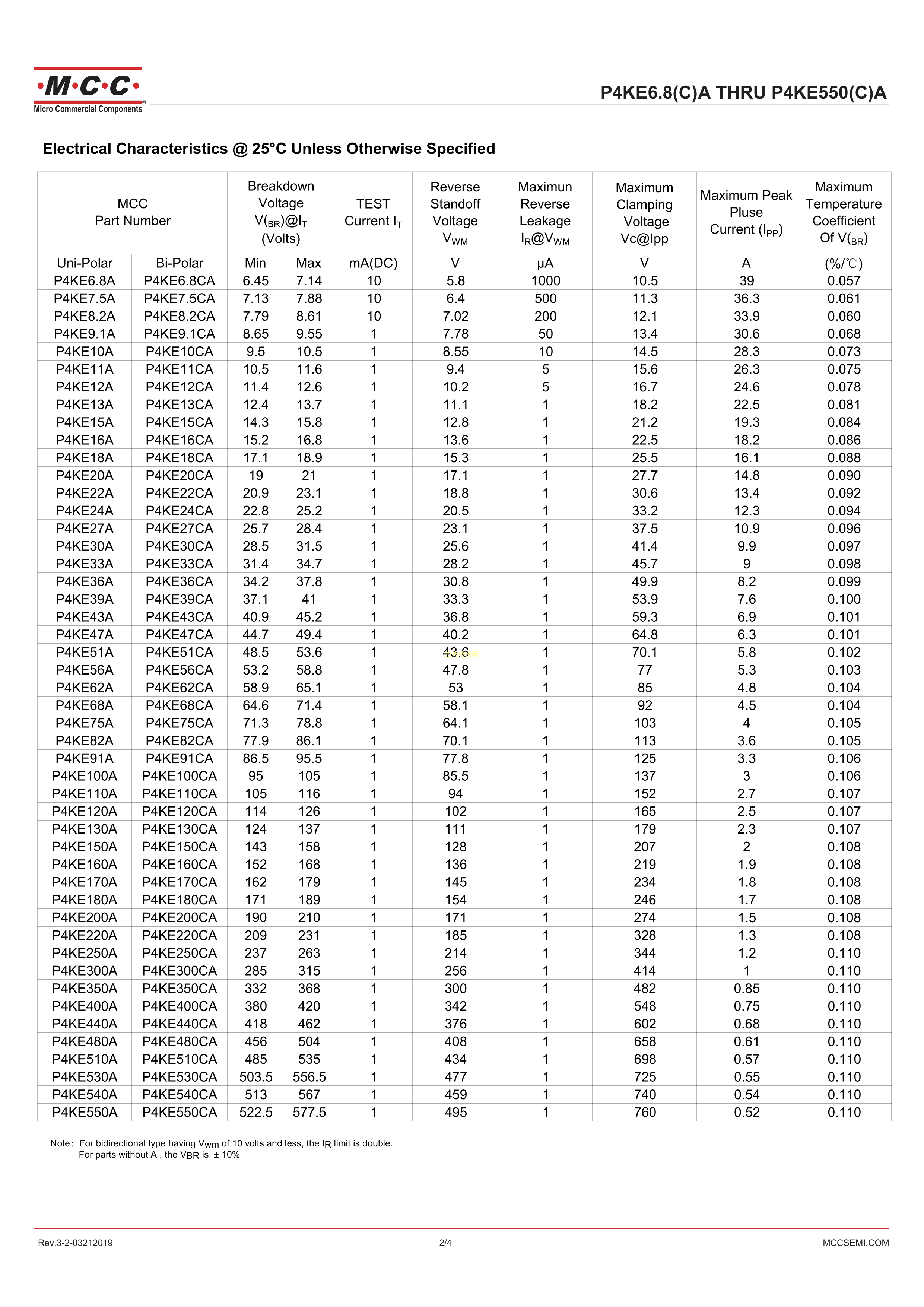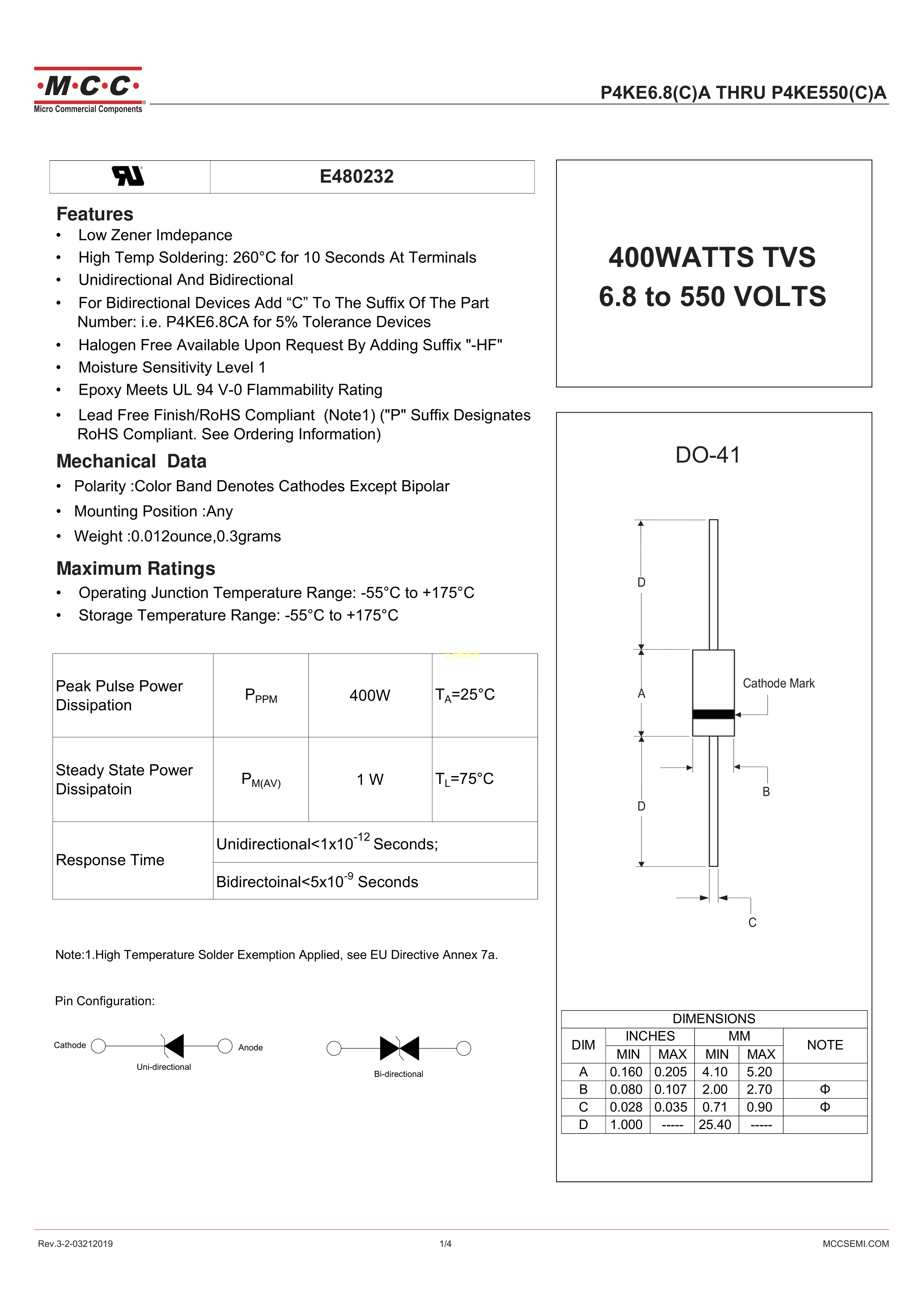 P4KE20A-TP数据手册DO-41封装MCC(美微科)PDF规格书,中英文下载