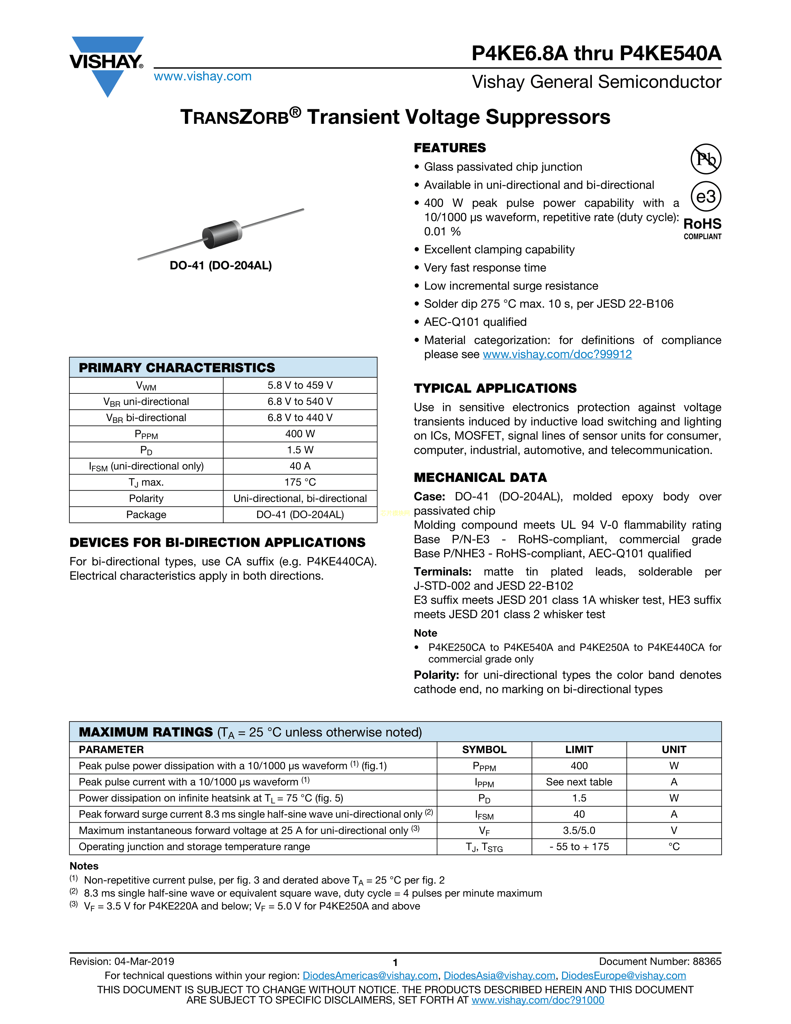 P4KE39CA-E3-73数据手册DO-41(DO-204AL)封装VISHAY(威世)PDF规格