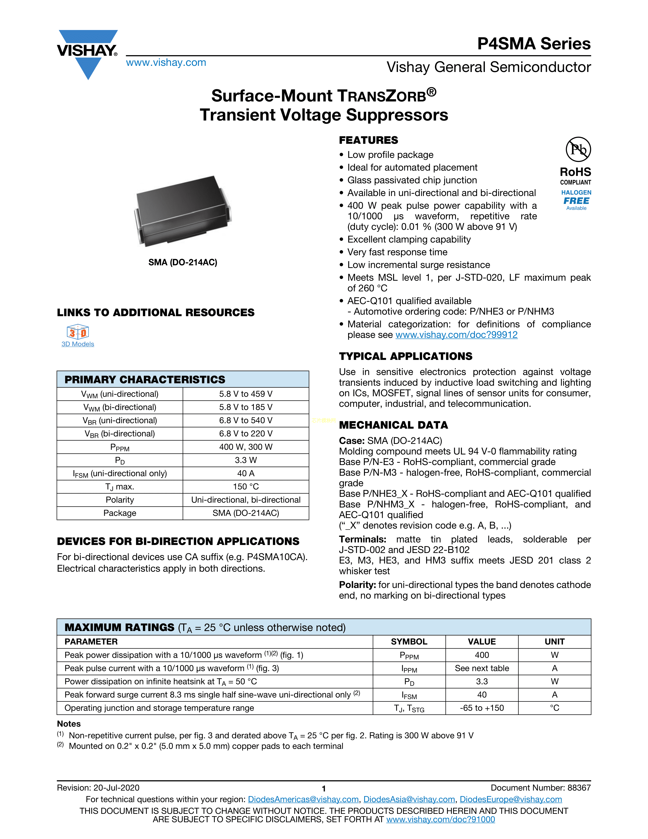 P4SMA12A-E3-61数据手册SMA(DO-214AC)封装VISHAY(威世)PDF规格书,