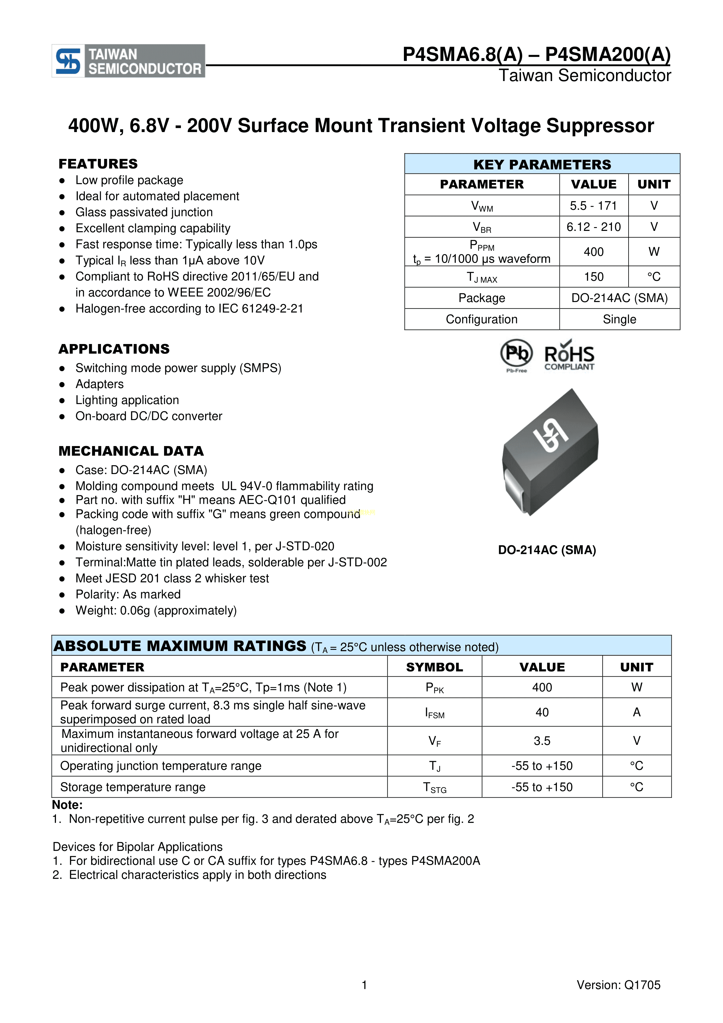 P4SMA150CA M2G数据手册SMA(DO-214AC)封装Taiwan Semiconduc