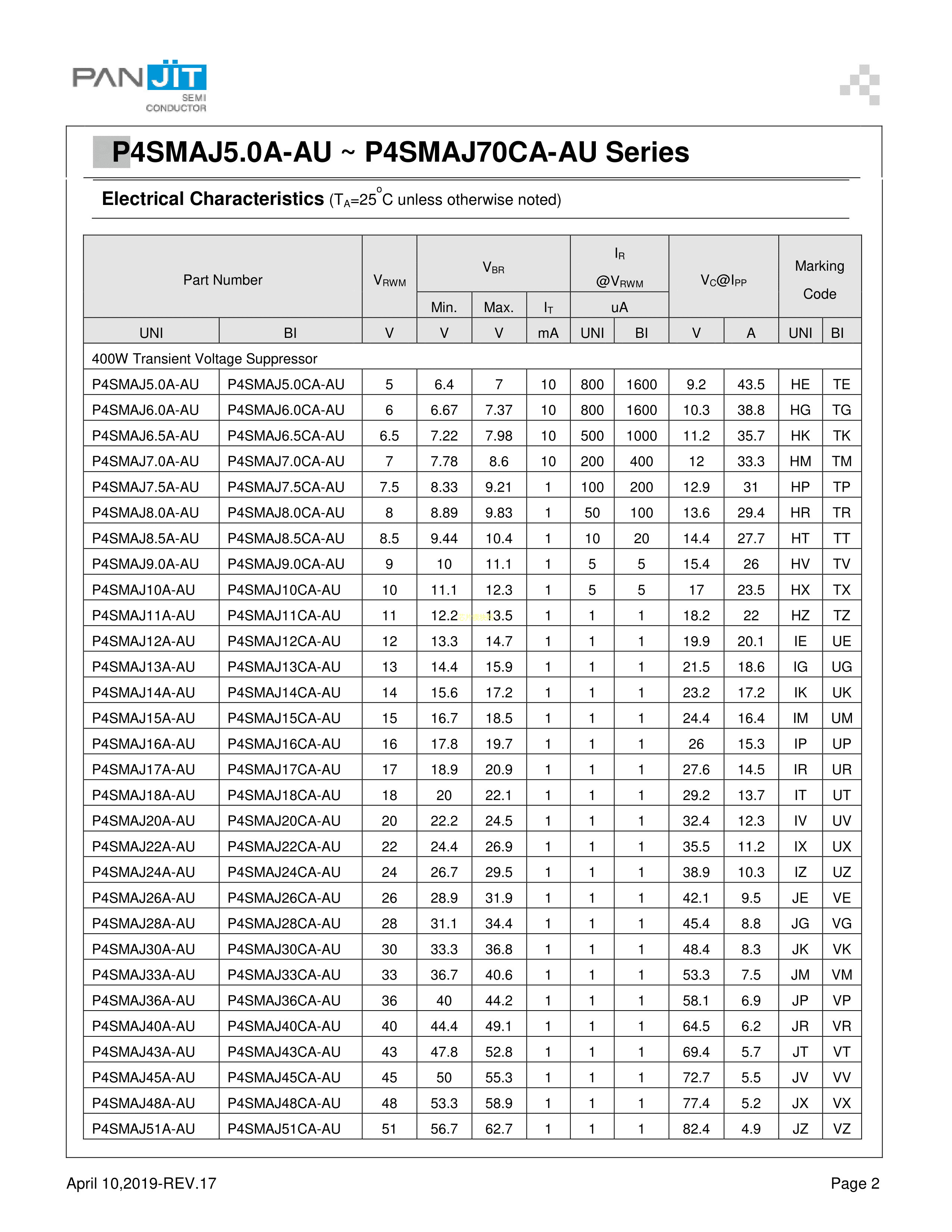 P4SMAJ28CA-AU_R1_00001数据手册SMA封装PANJIT(强茂)PDF规格书,中英