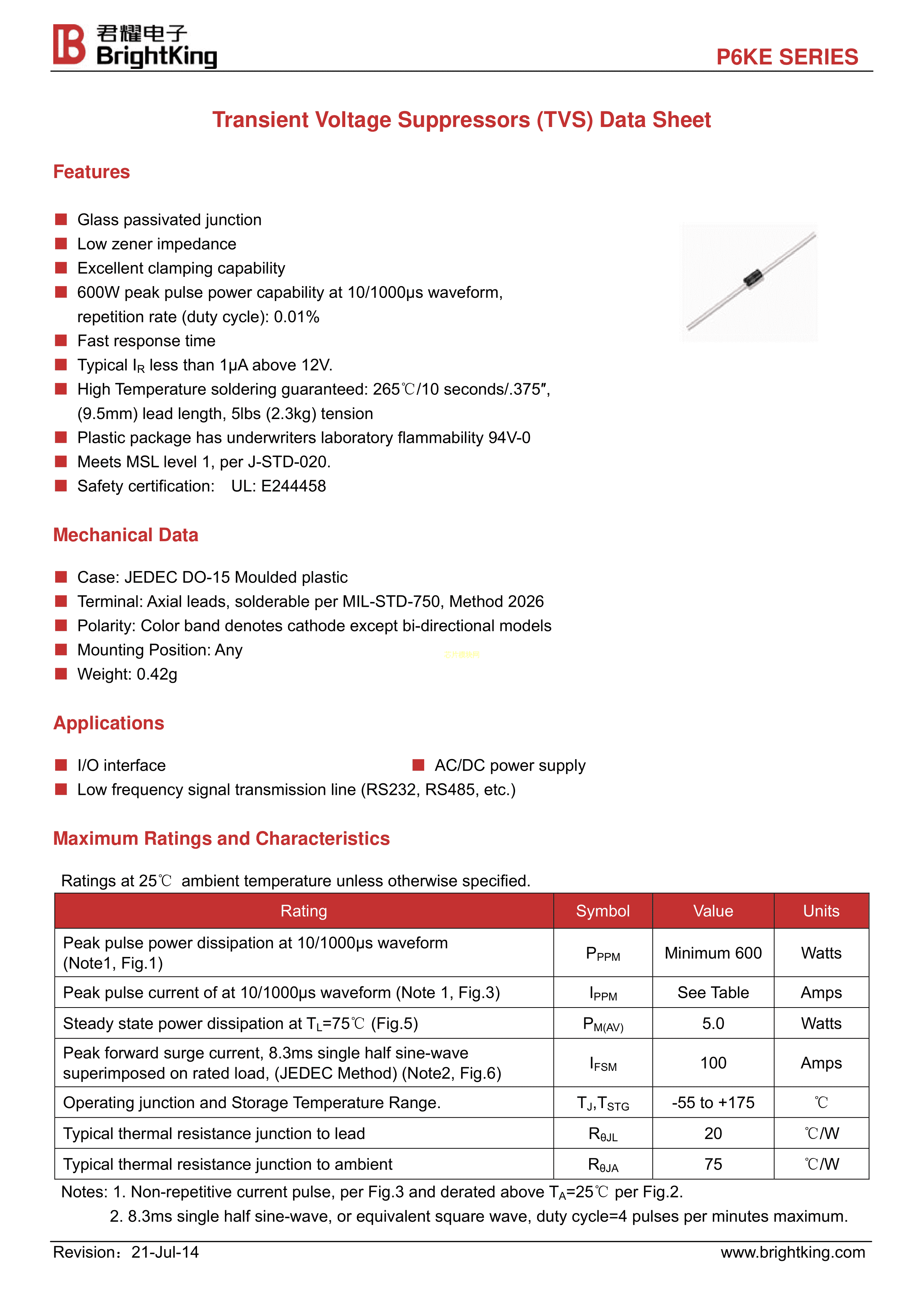 P6KE180CA数据手册DO-15(DO-204AC)封装Brightking(台湾君耀)PDF规