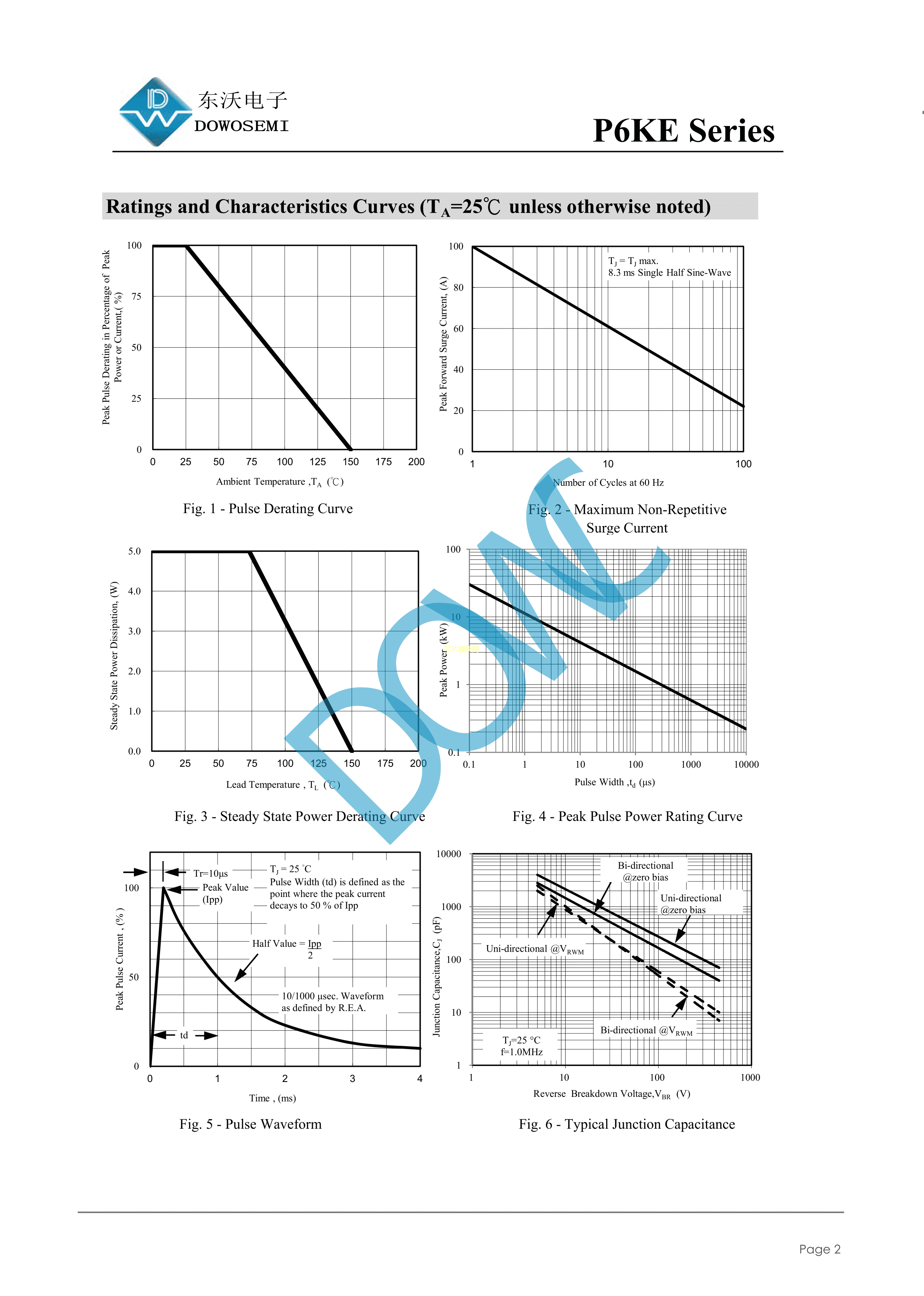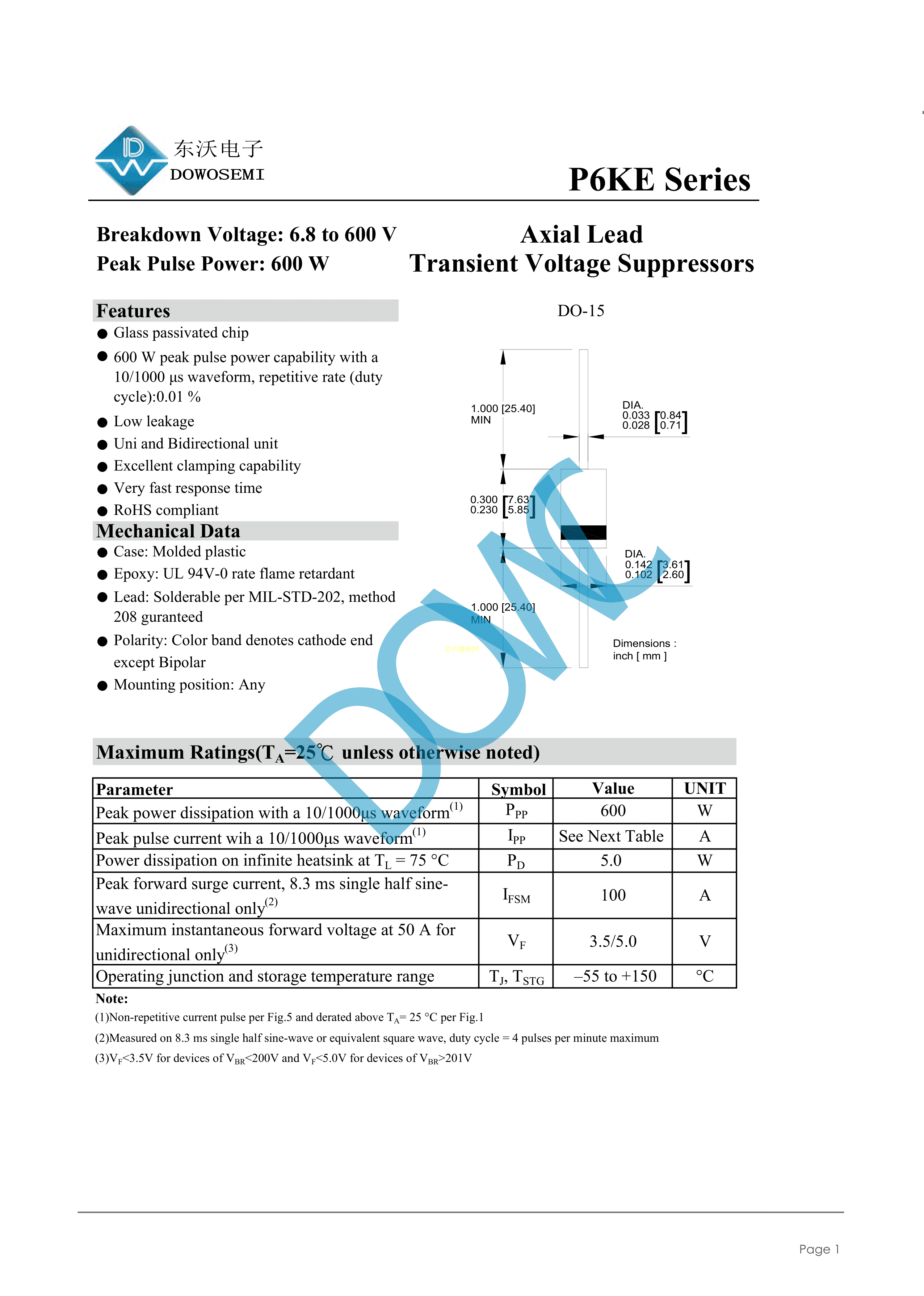 P6KE20CA数据手册DO-15封装DOWO(东沃)PDF规格书,中英文下载