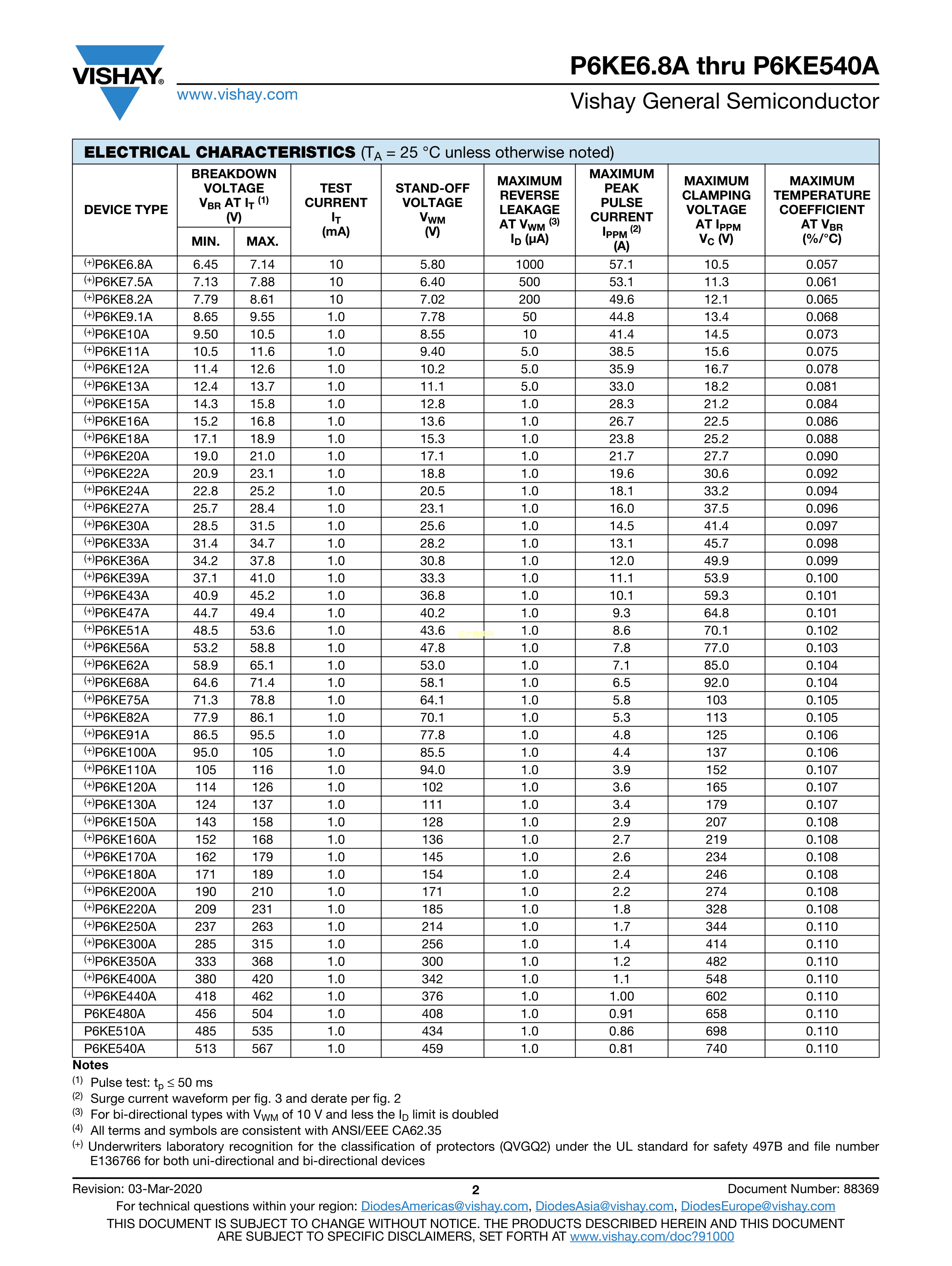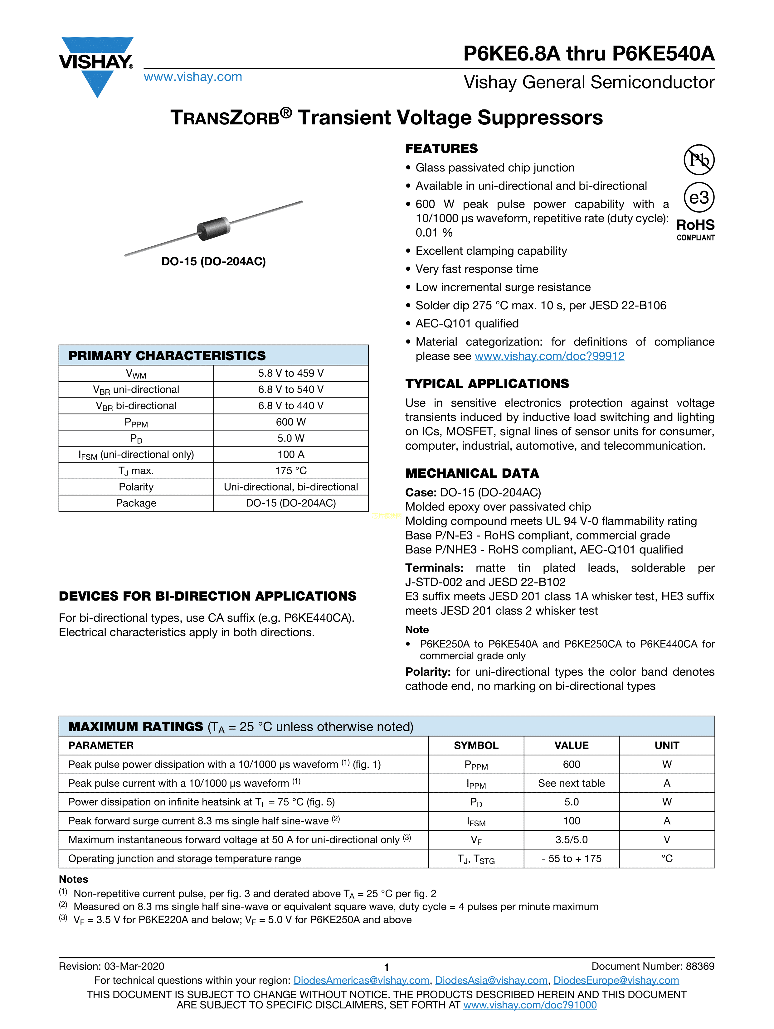 P6KE220AHE3-73数据手册DO-15(DO-204AC)封装VISHAY(威世)PDF规格