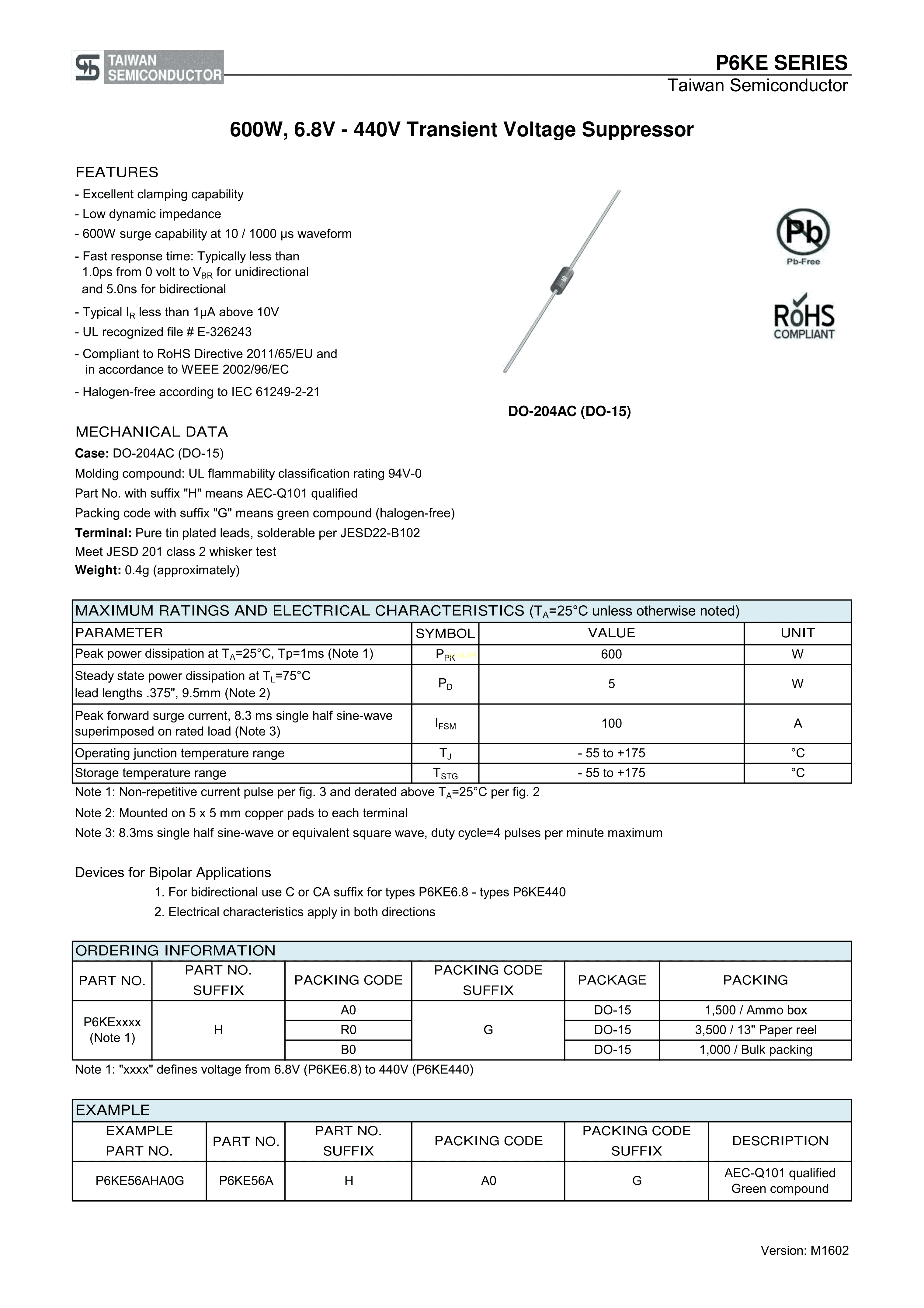 P6KE220CA R0G数据手册DO-15(DO-204AC)封装Taiwan Semicondu