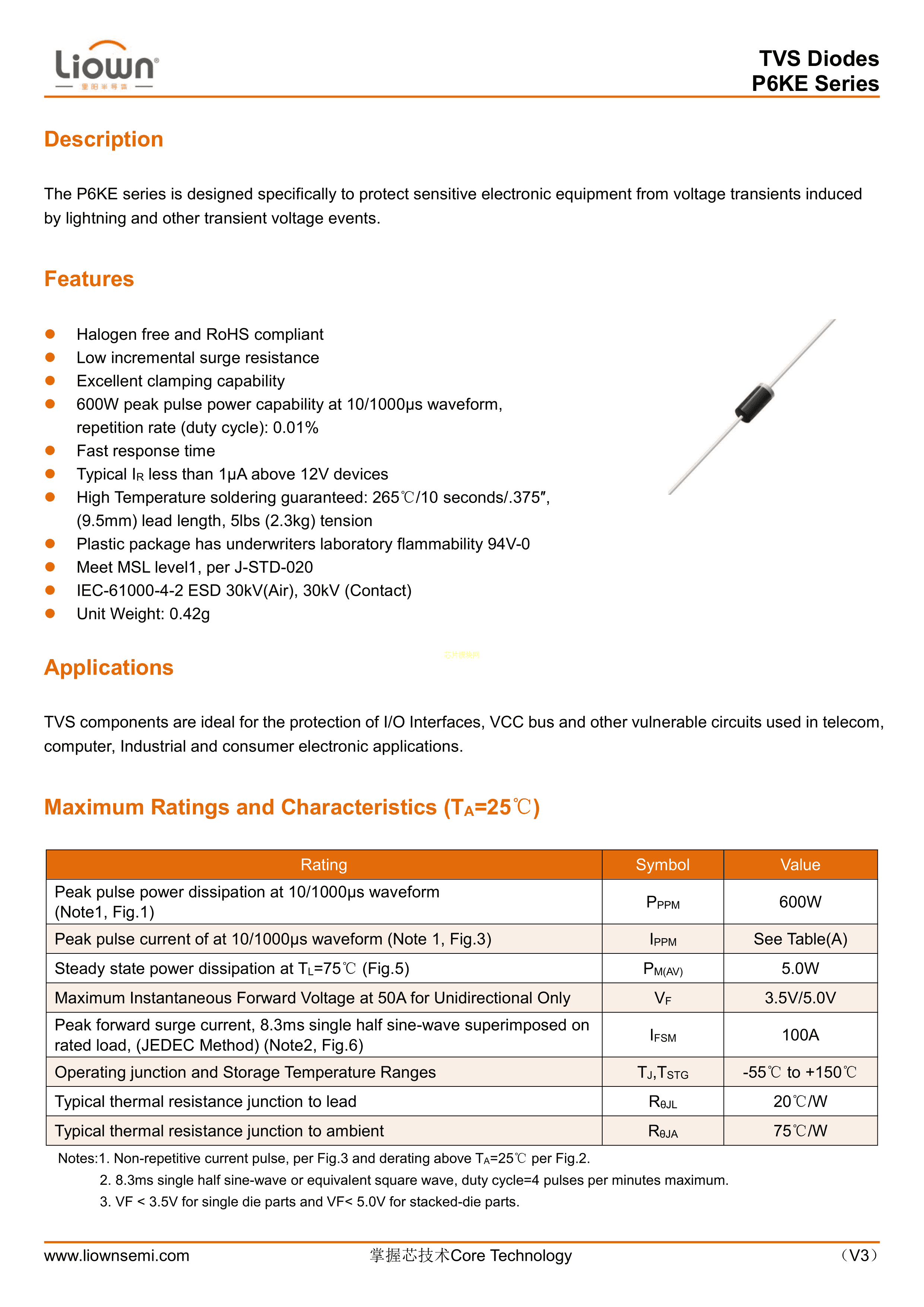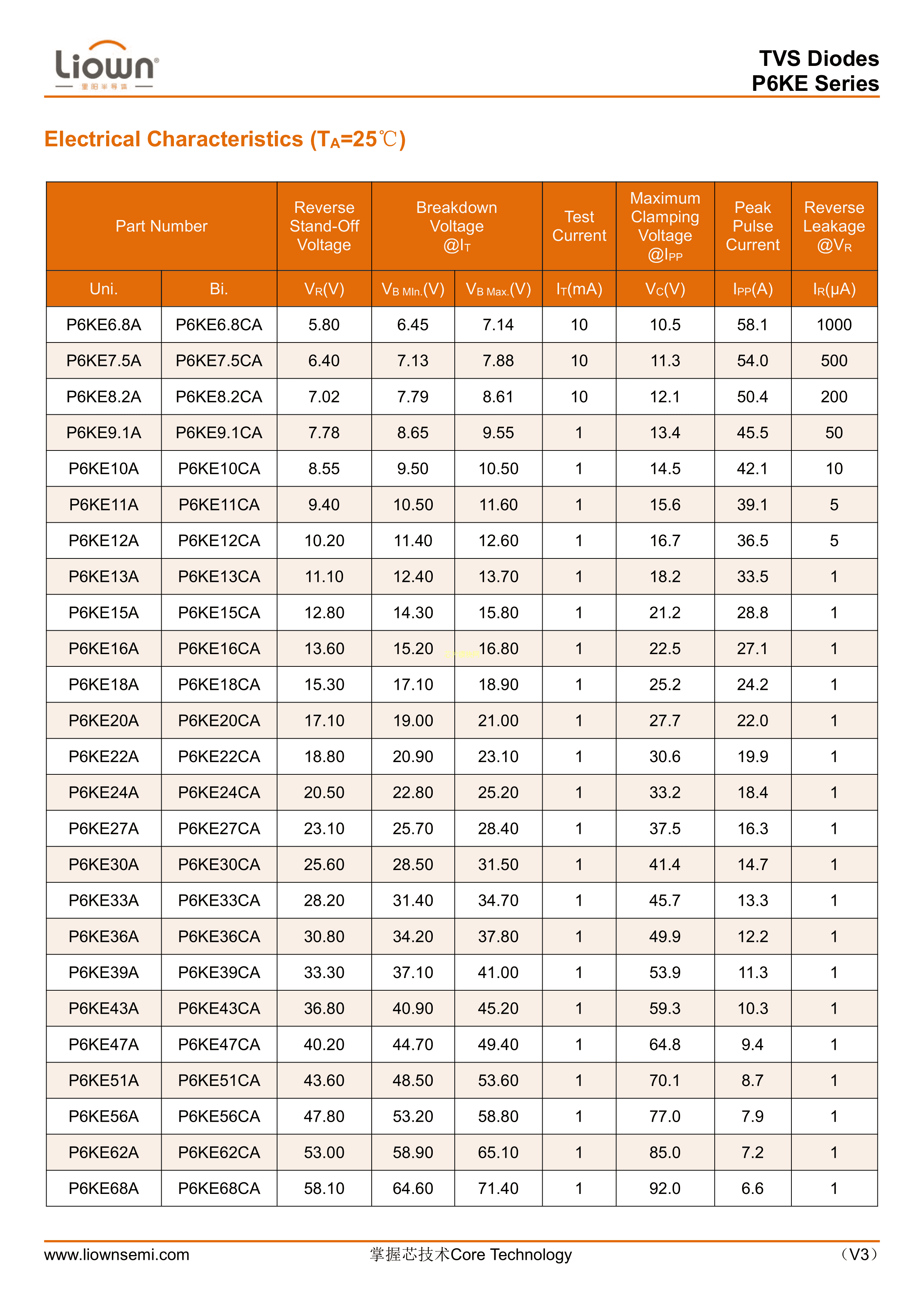 P6KE27CA数据手册DO-15封装Liown(里阳半导体)PDF规格书,中英文下载