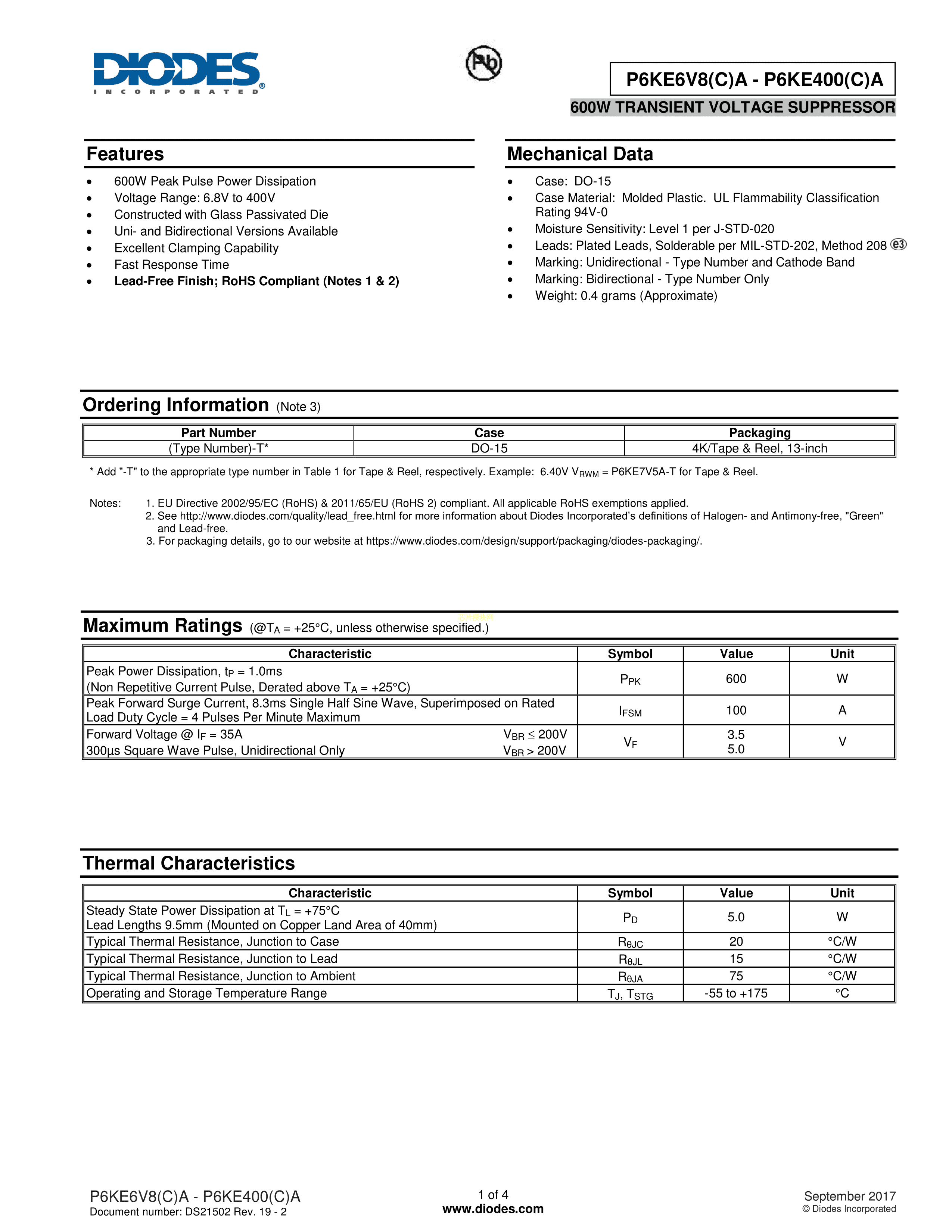 P6KE68CA-T数据手册DO-15封装DIODES(美台)PDF规格书,中英文下载