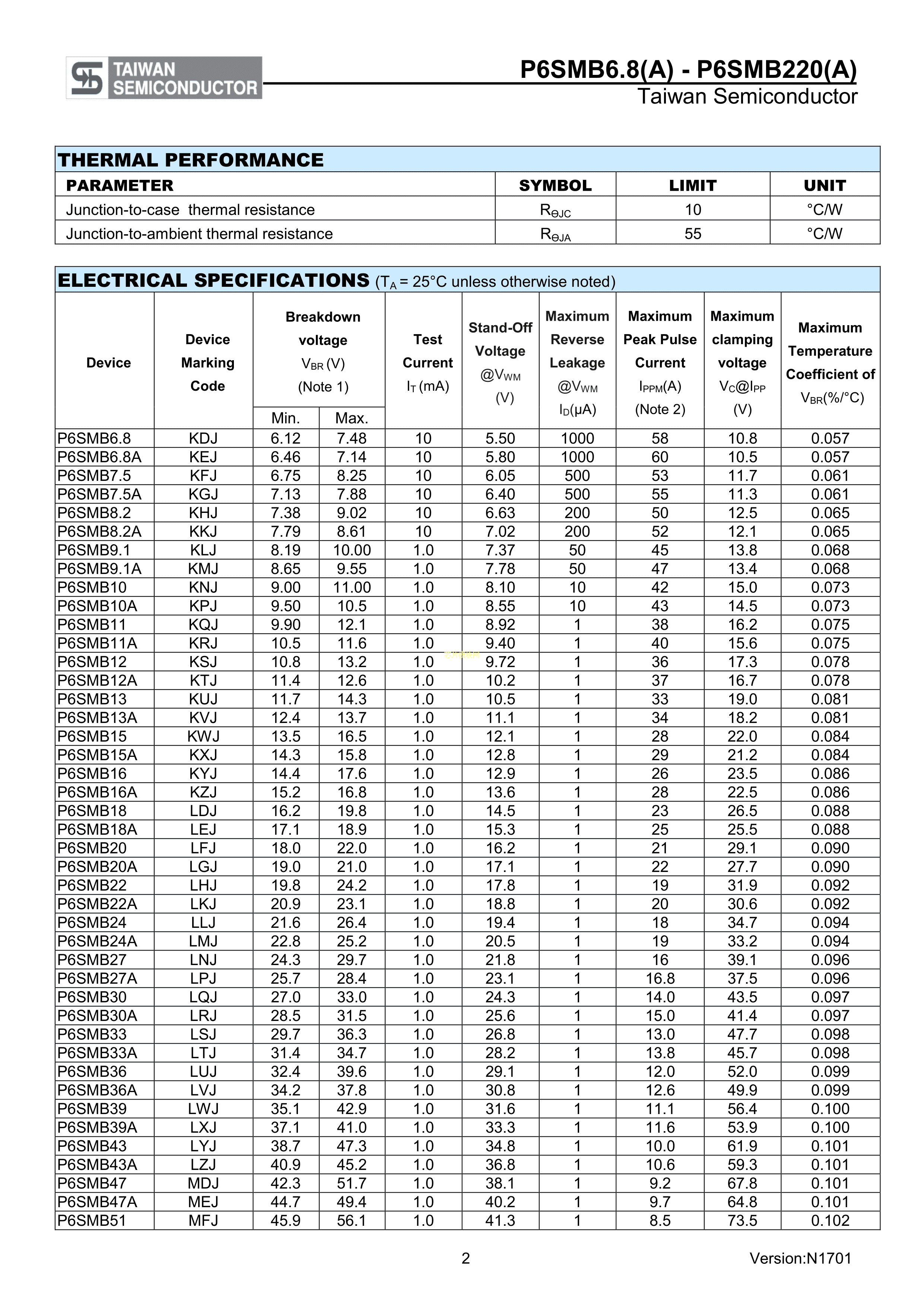 P6SMB150AHR5G数据手册SMB(DO-214AA)封装Taiwan Semiconduct