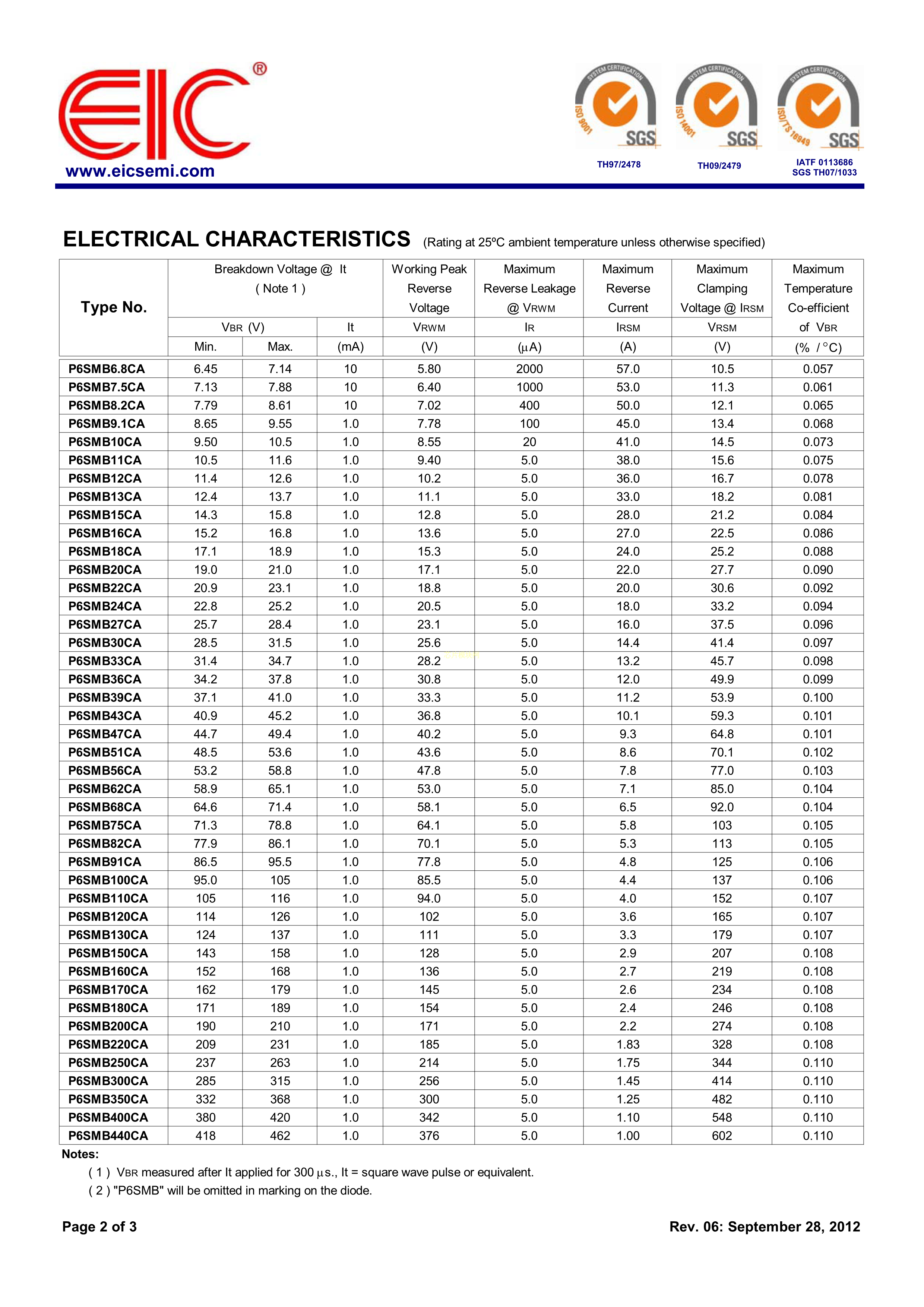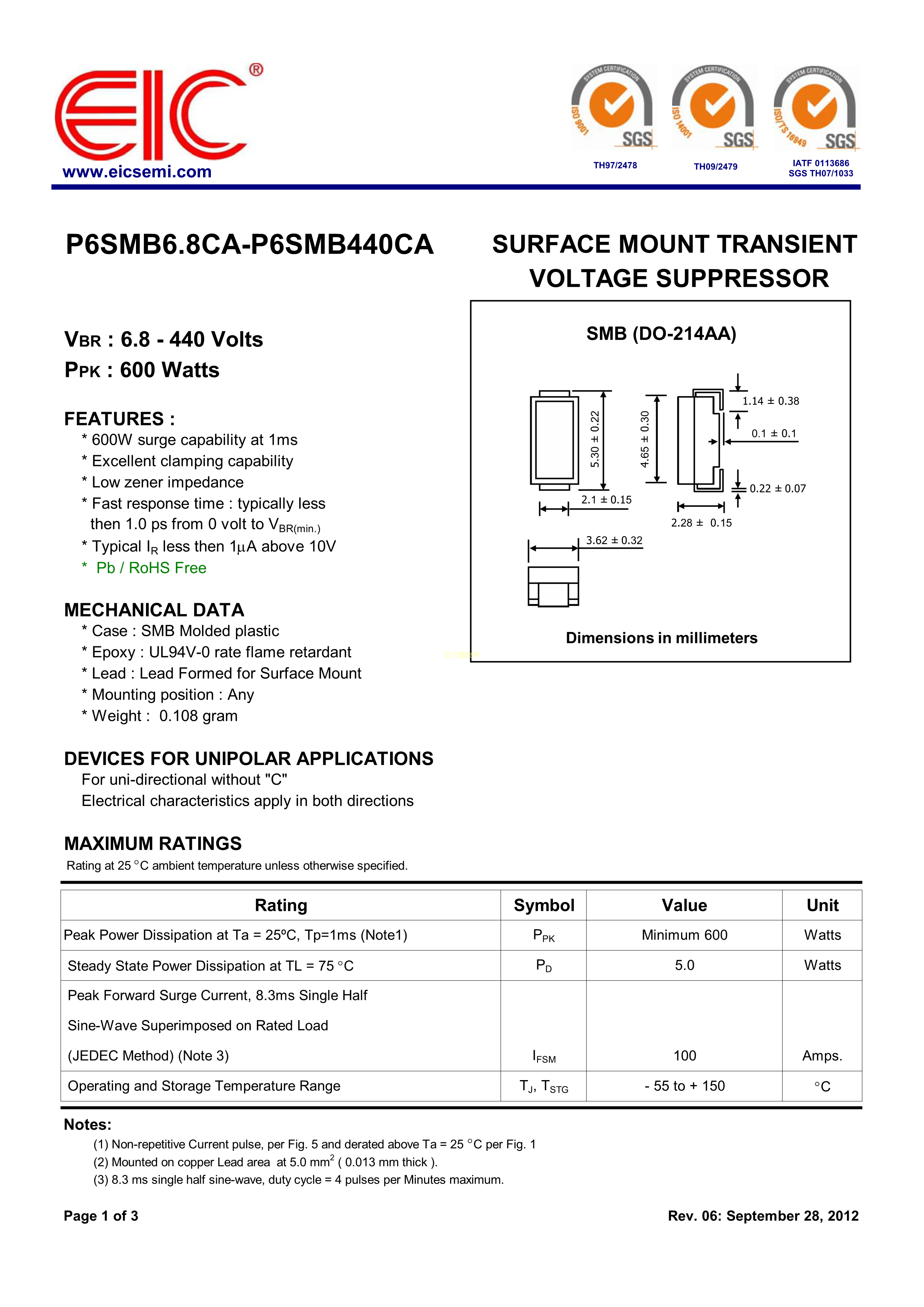 P6SMB33CA数据手册SMB(DO-214AA)封装EICPDF规格书,中英文下载