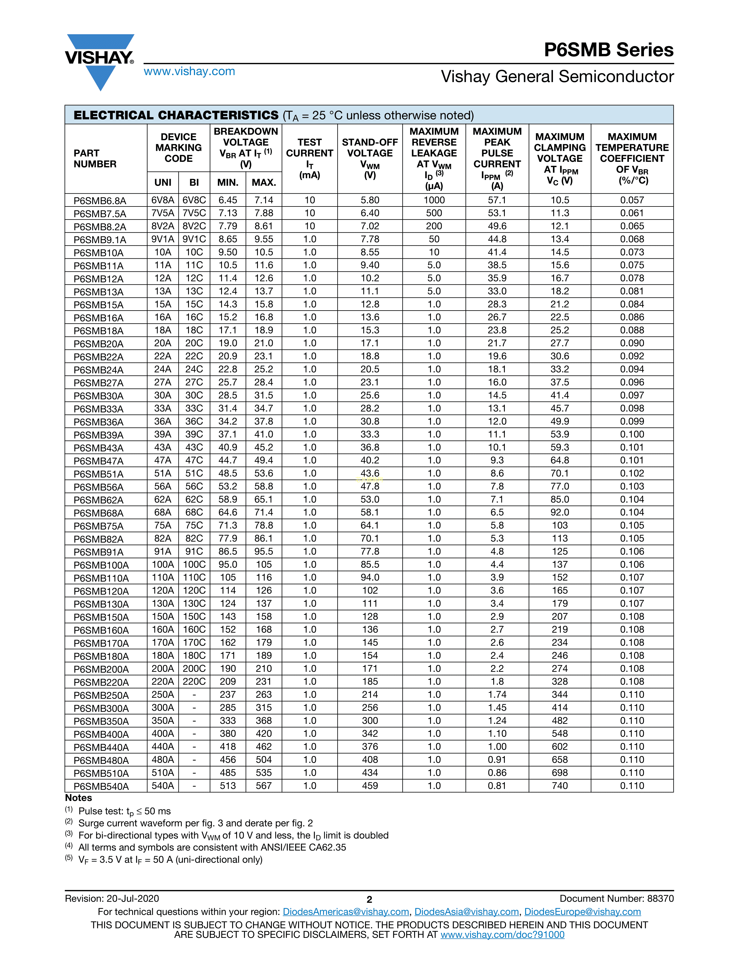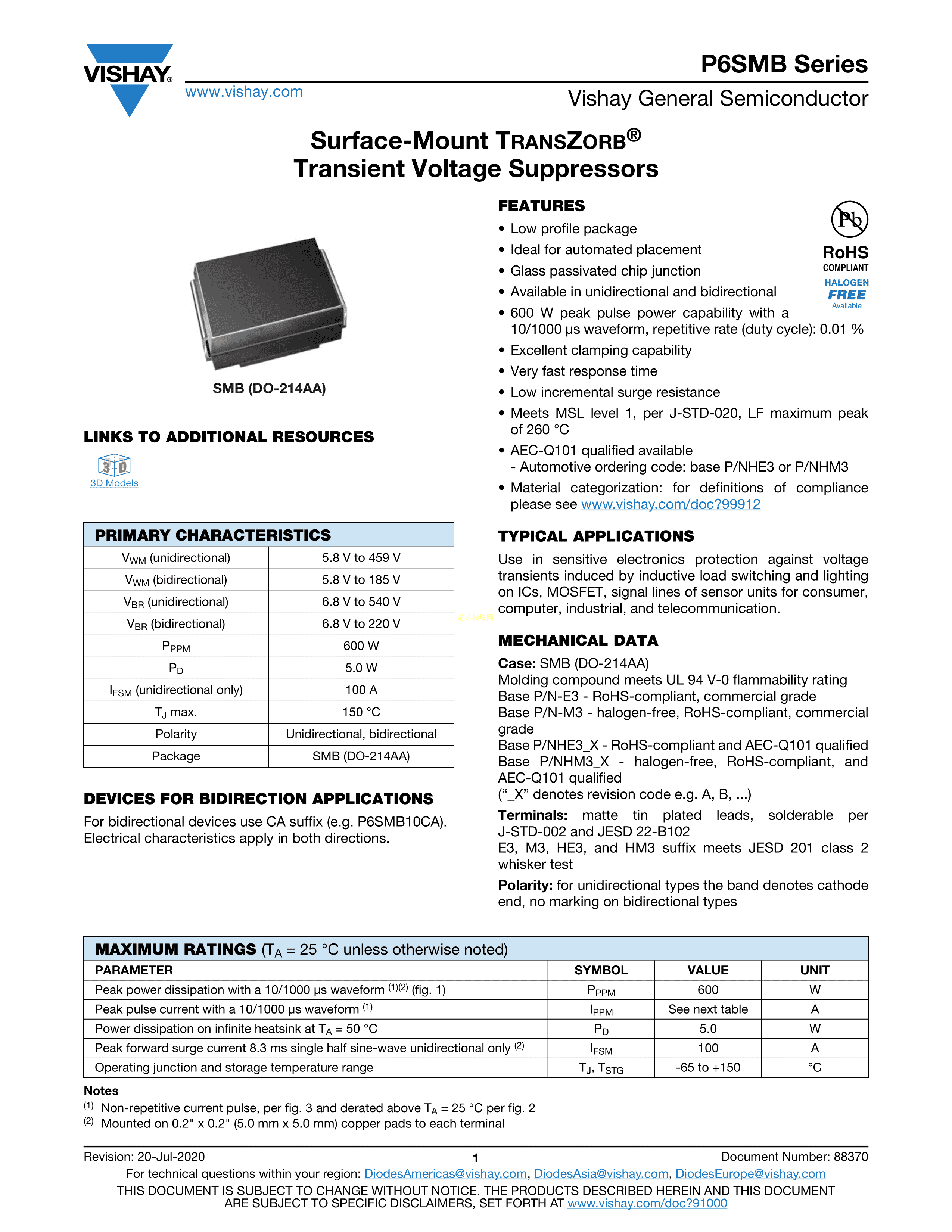 P6SMB350A-M3-52数据手册DO-214AA(SMBJ)封装VISHAY(威世)PDF规格