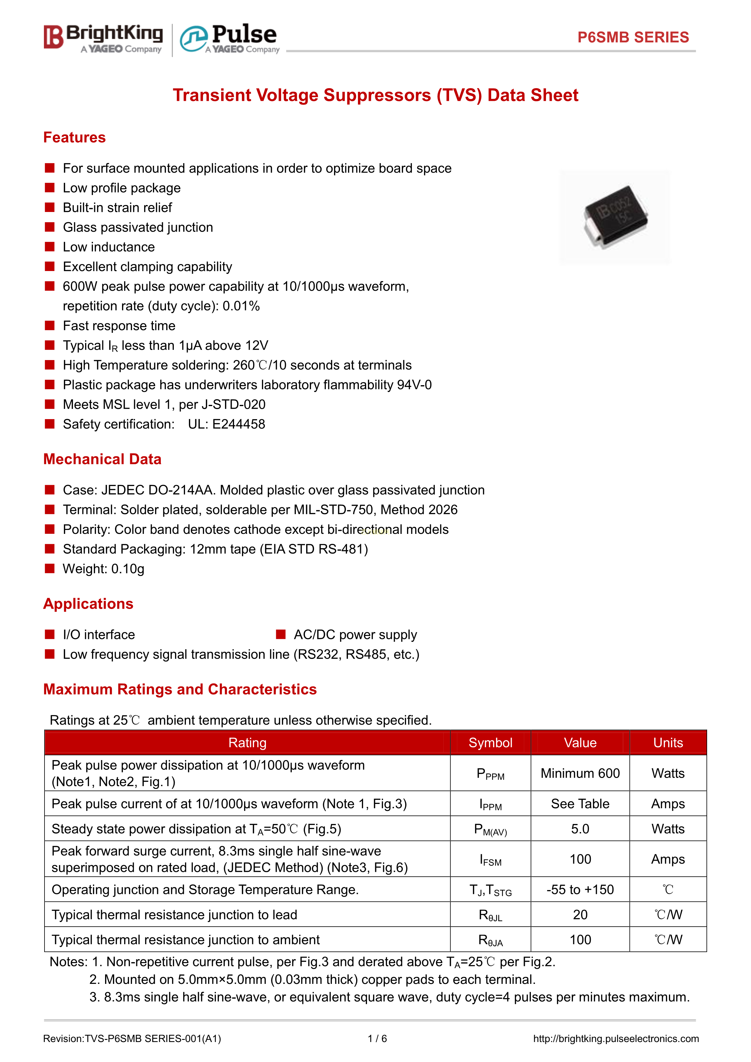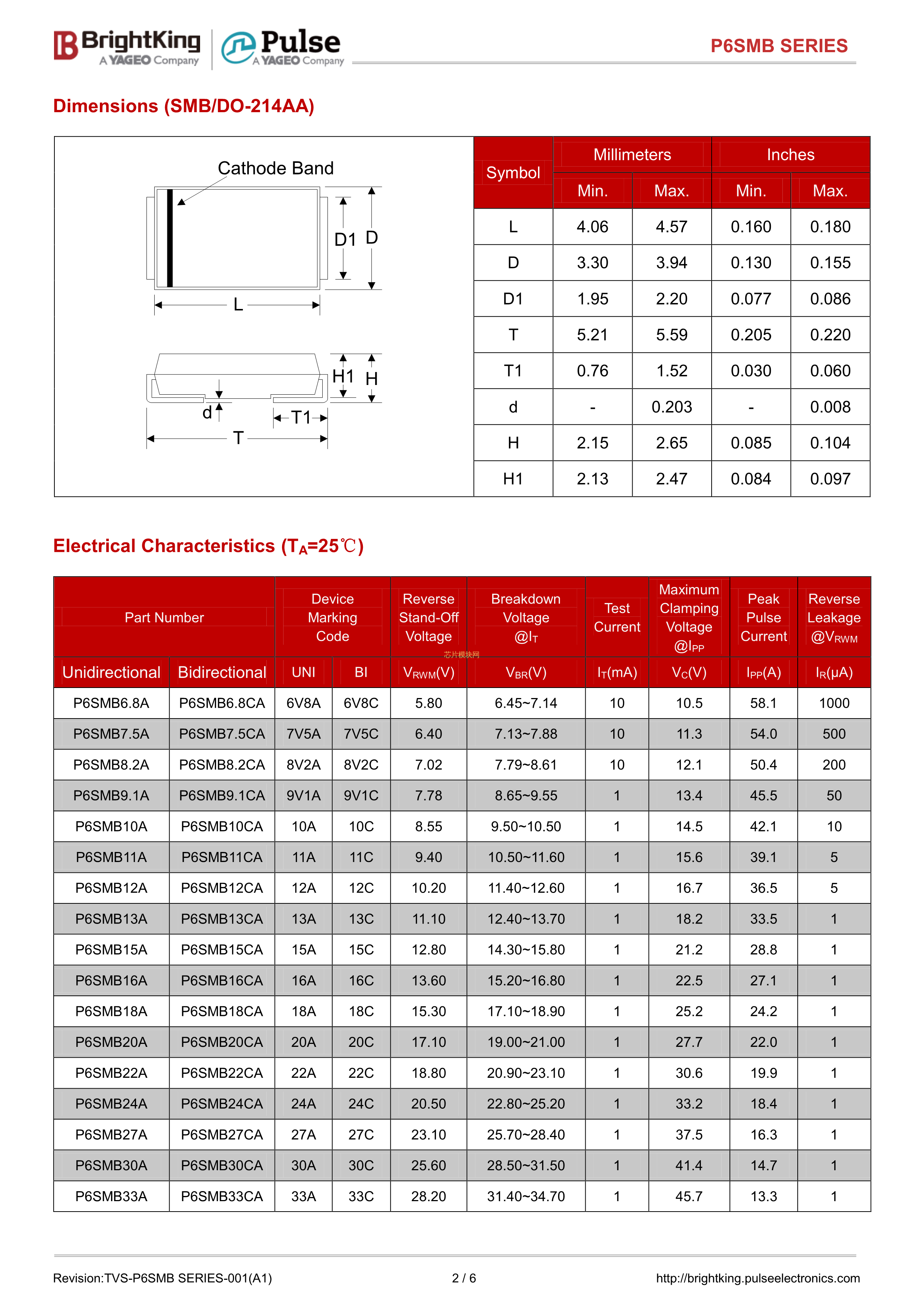 P6SMB36CA数据手册SMB封装Brightking(台湾君耀)PDF规格书,中英文下载
