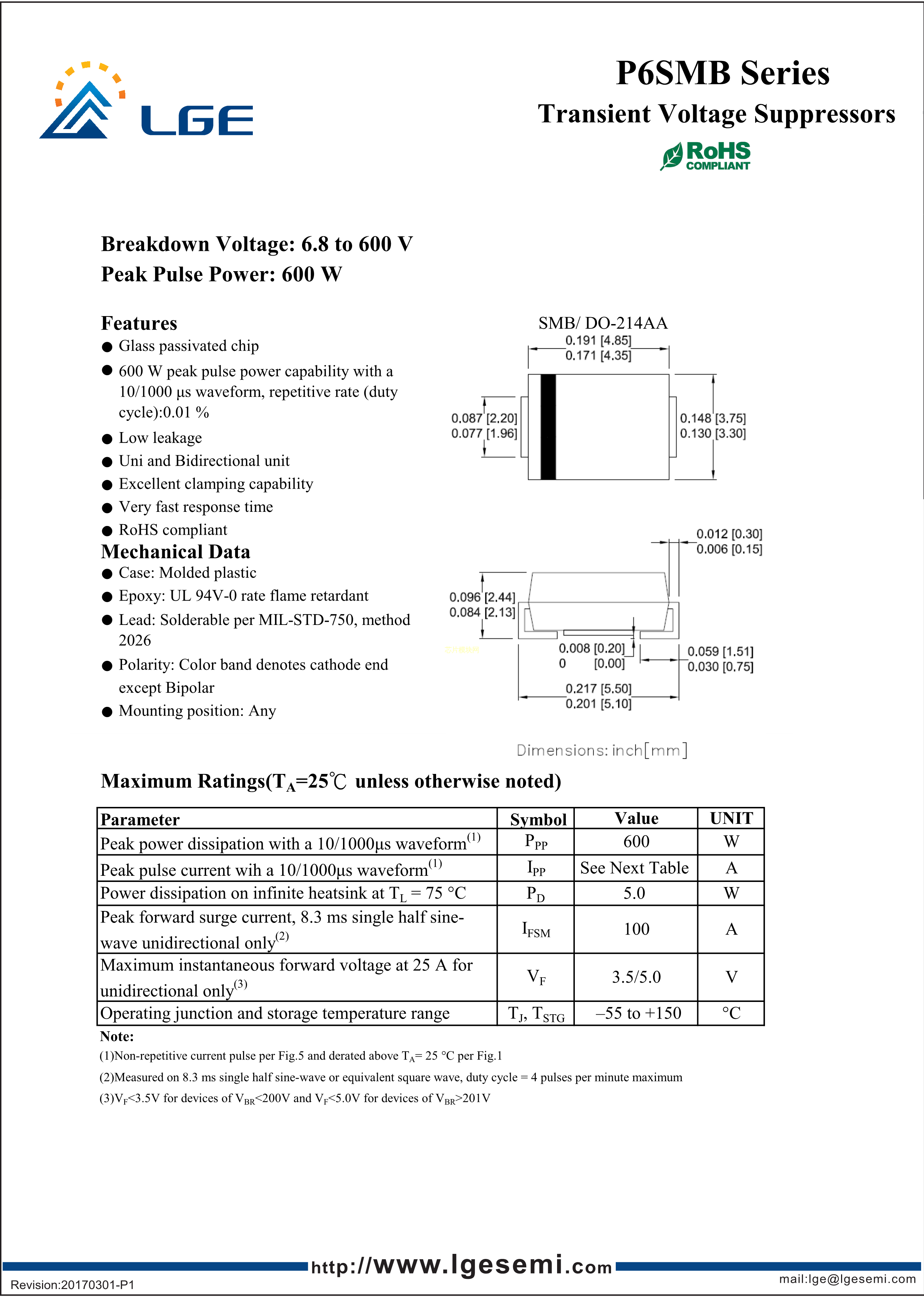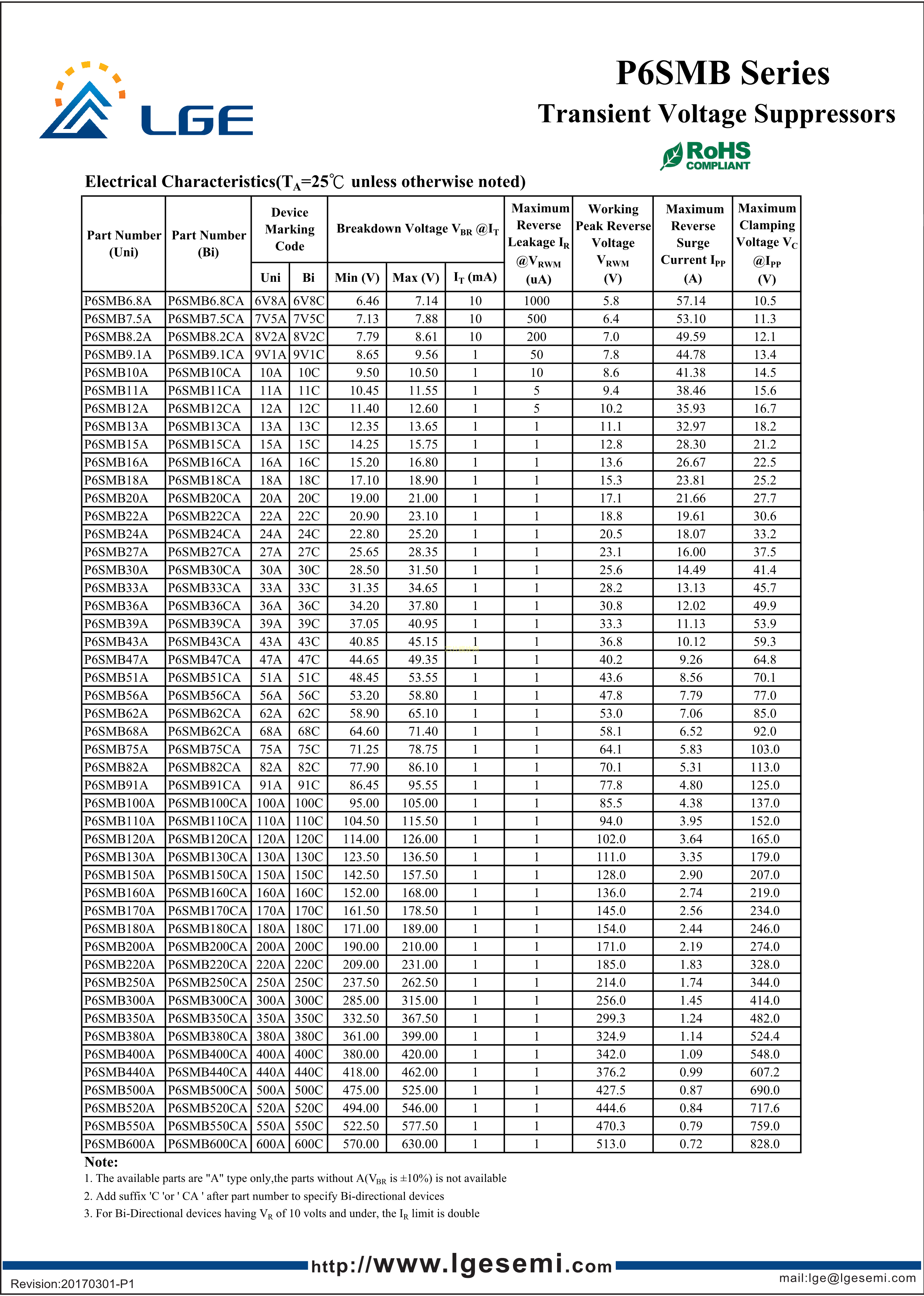 P6SMB43A数据手册SMB封装LGE(鲁光)PDF规格书,中英文下载