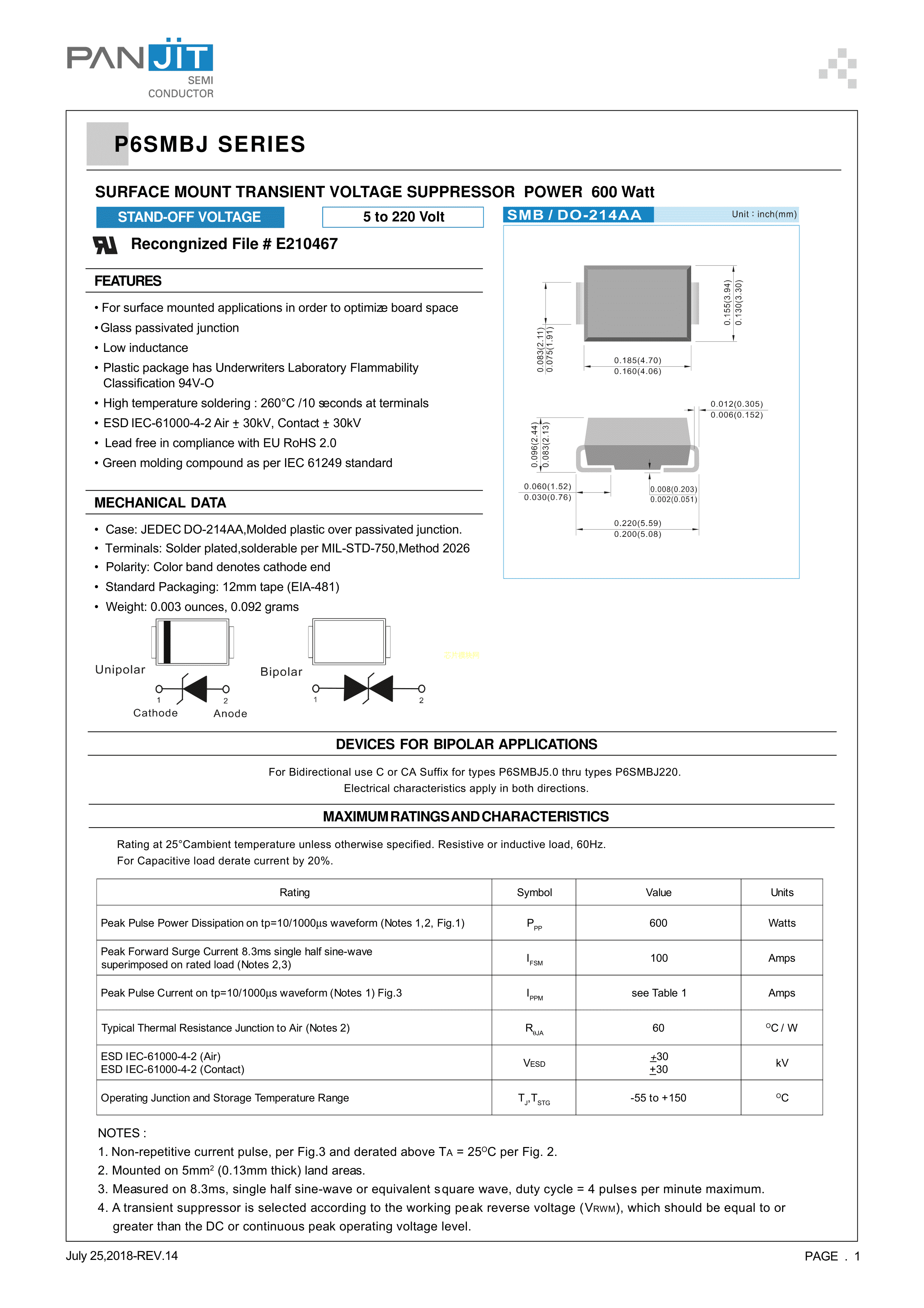 P6SMBJ40CA_R1_00001数据手册SMB封装PANJIT(强茂)PDF规格书,中英文下载
