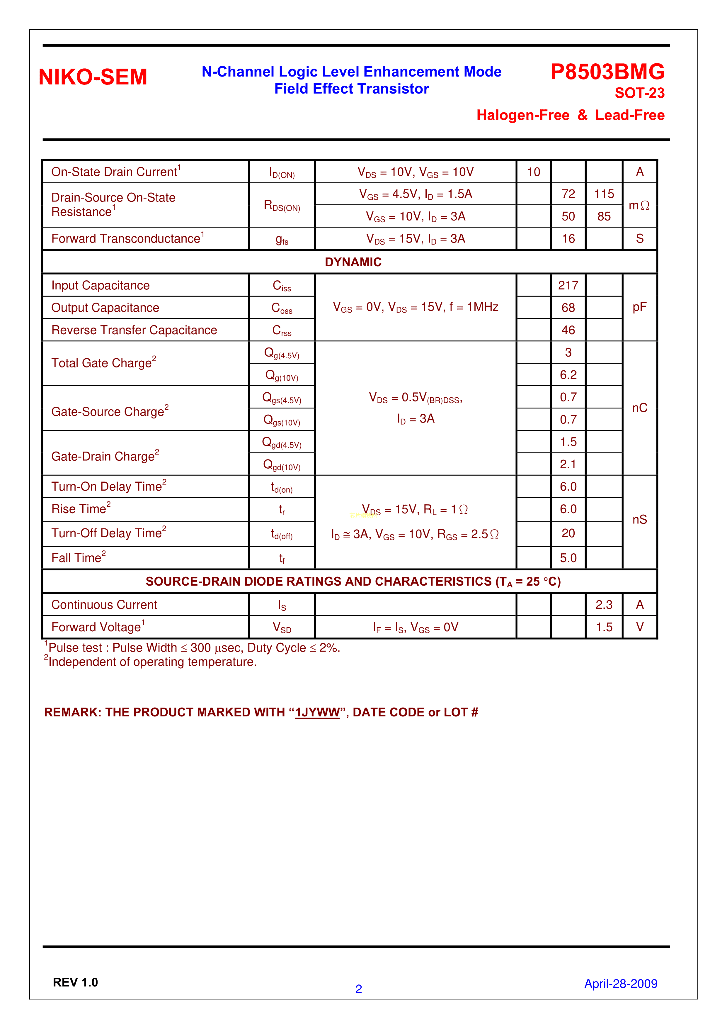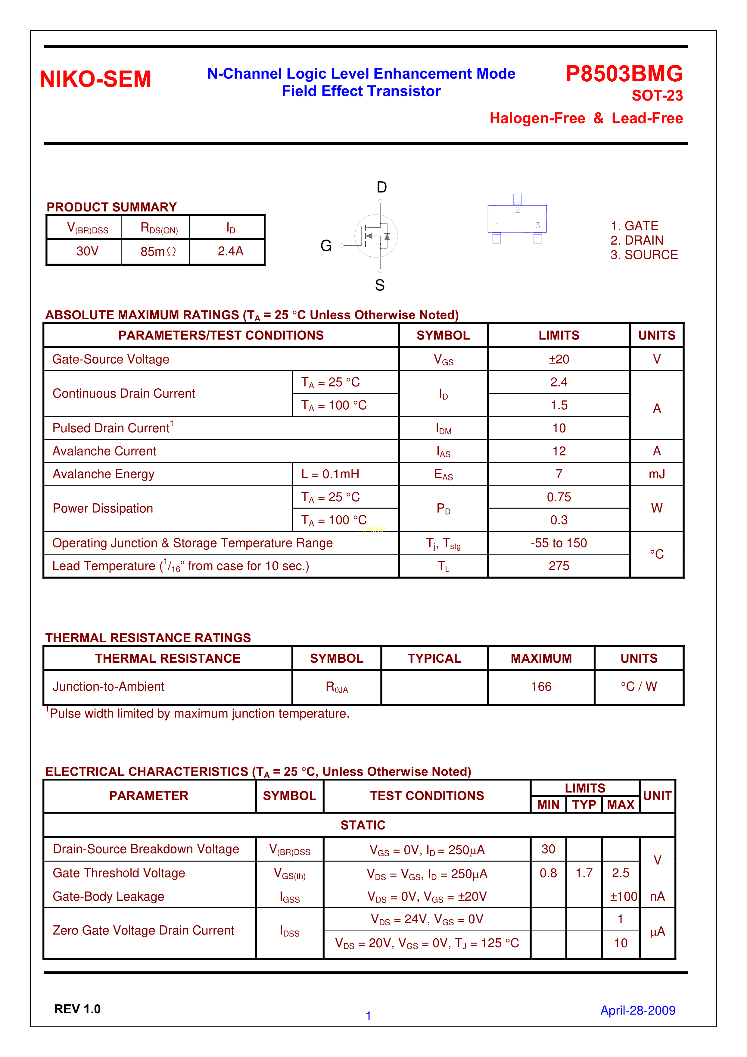 P8503BMG数据手册SOT-23封装NIKO-SEM(尼克森)PDF规格书,中英文下载