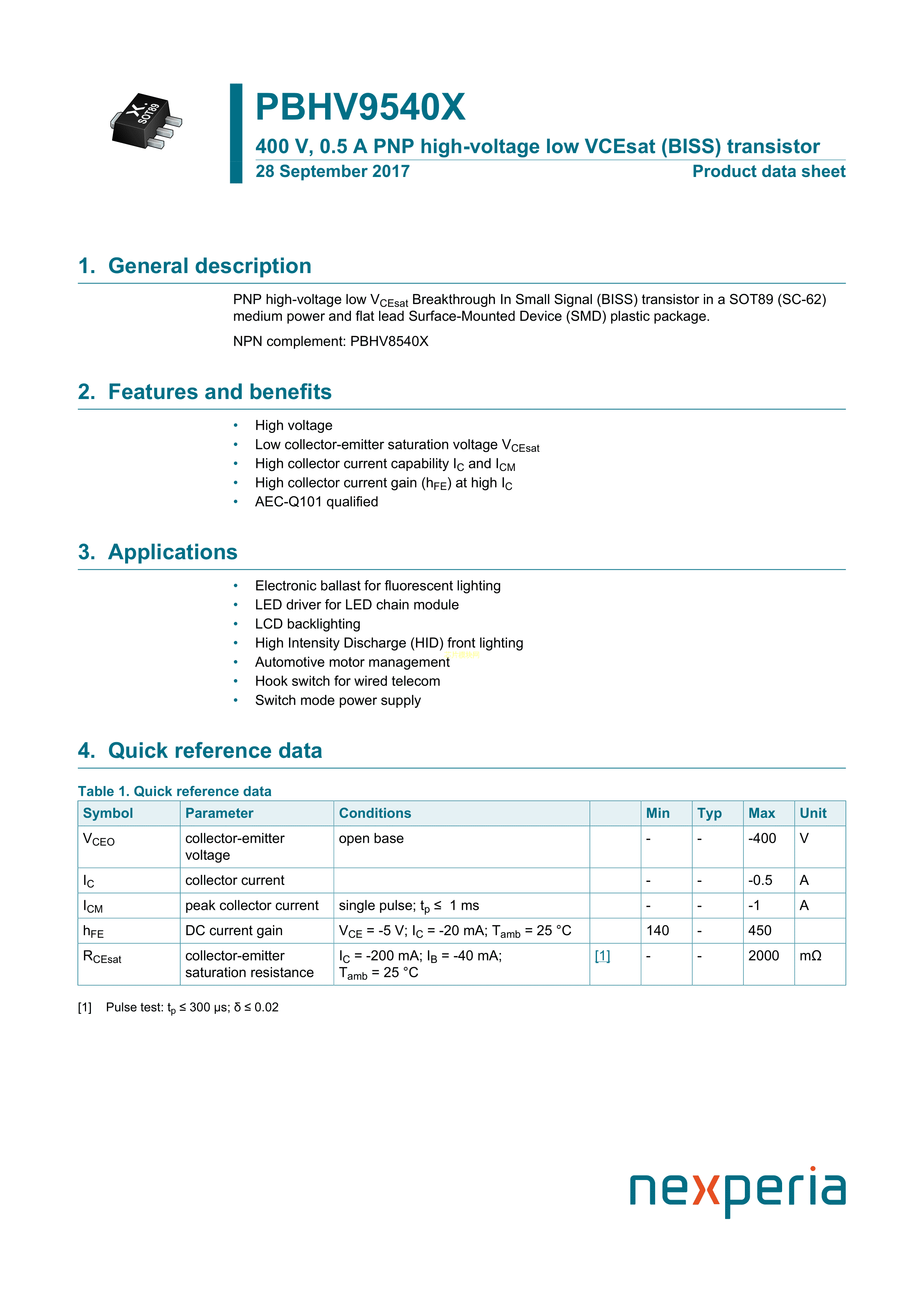 PBHV9540XX数据手册SOT-89封装Nexperia(安世)PDF规格书,中英文下载