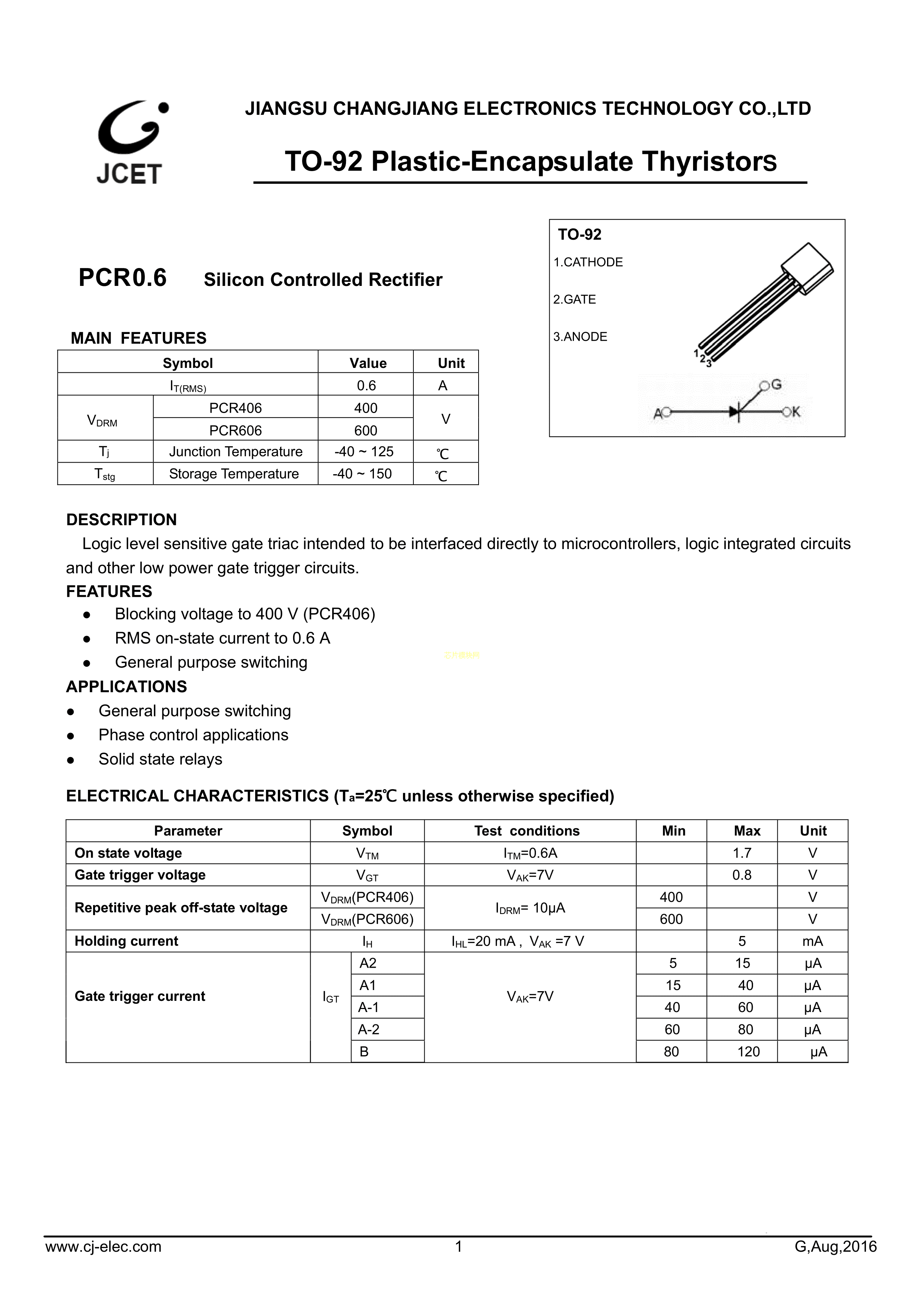 PCR606数据手册TO-92(TO-92-3)封装CJ(江苏长电-长晶)PDF规格书,中英文下载