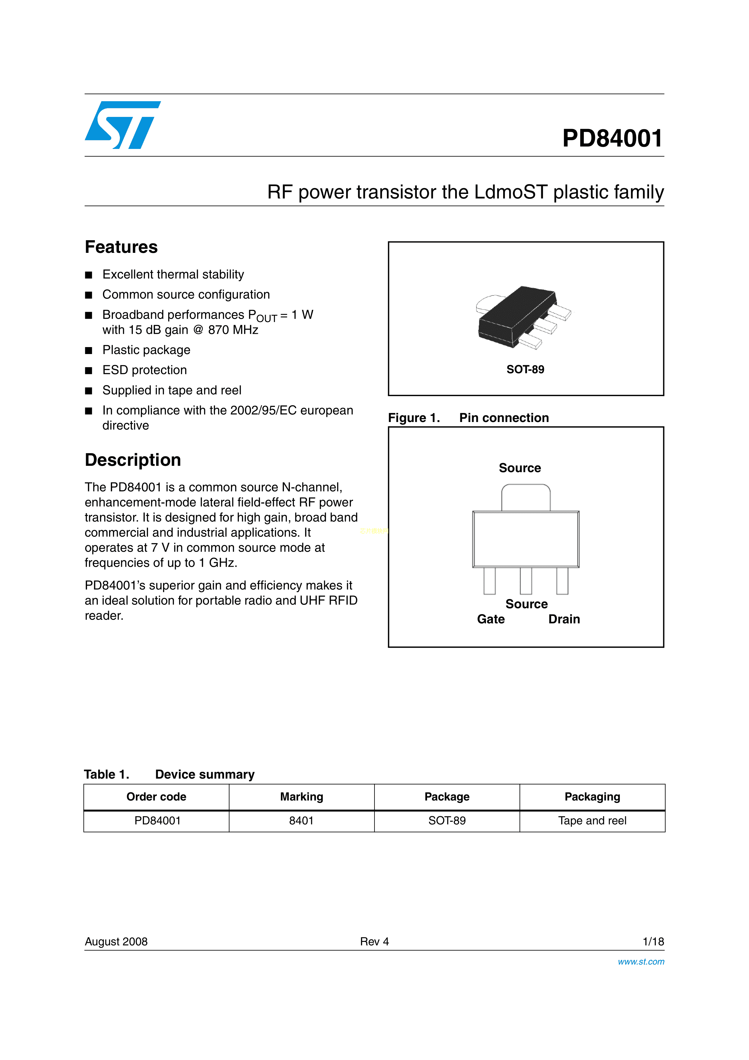 PD84001数据手册SOT-89封装ST(意法半导体)PDF规格书,中英文下载