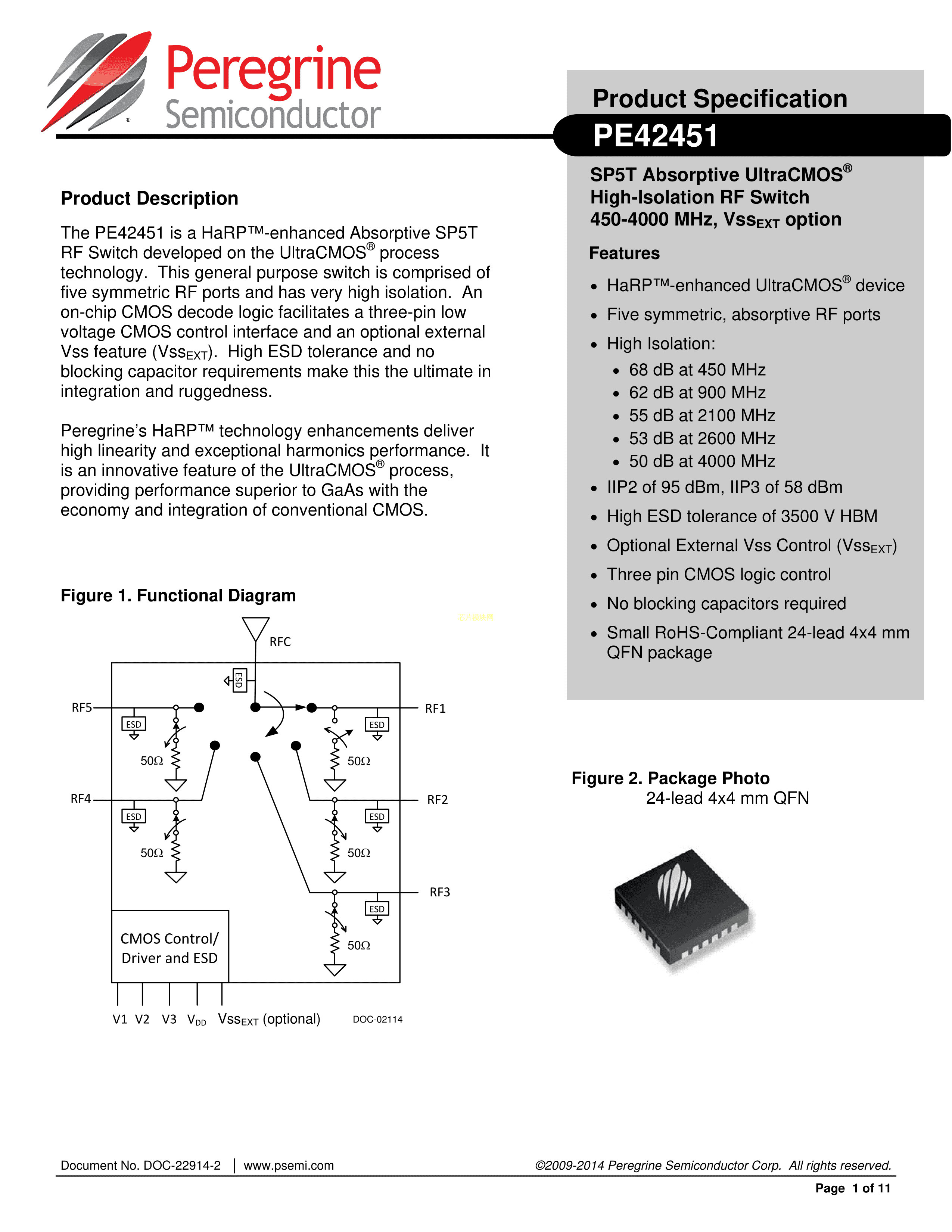 PE42451MLIAA-Z数据手册QFN-24(4x4)封装PSemiPDF规格书,中英文下载