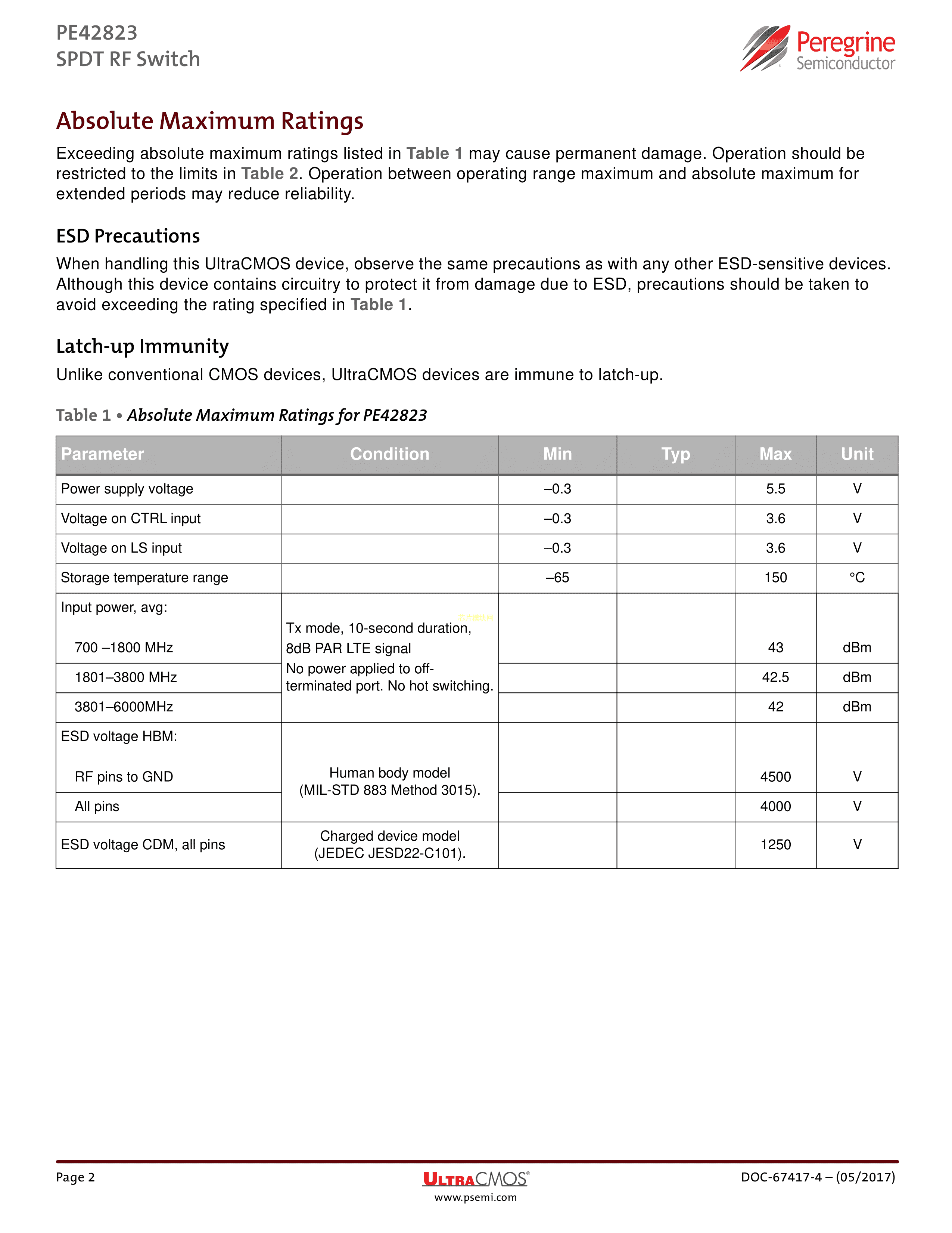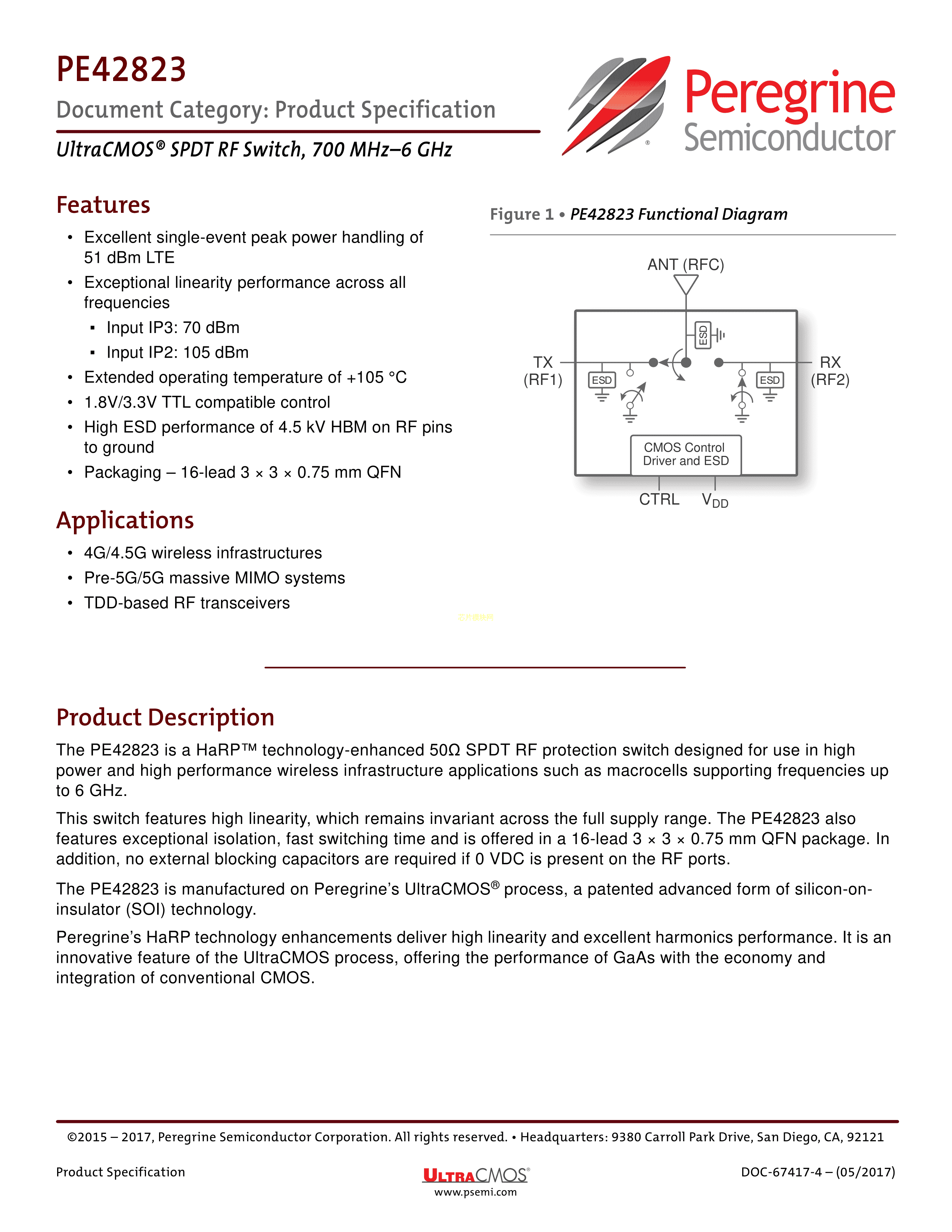PE42823A数据手册QFN-16封装PSemiPDF规格书,中英文下载