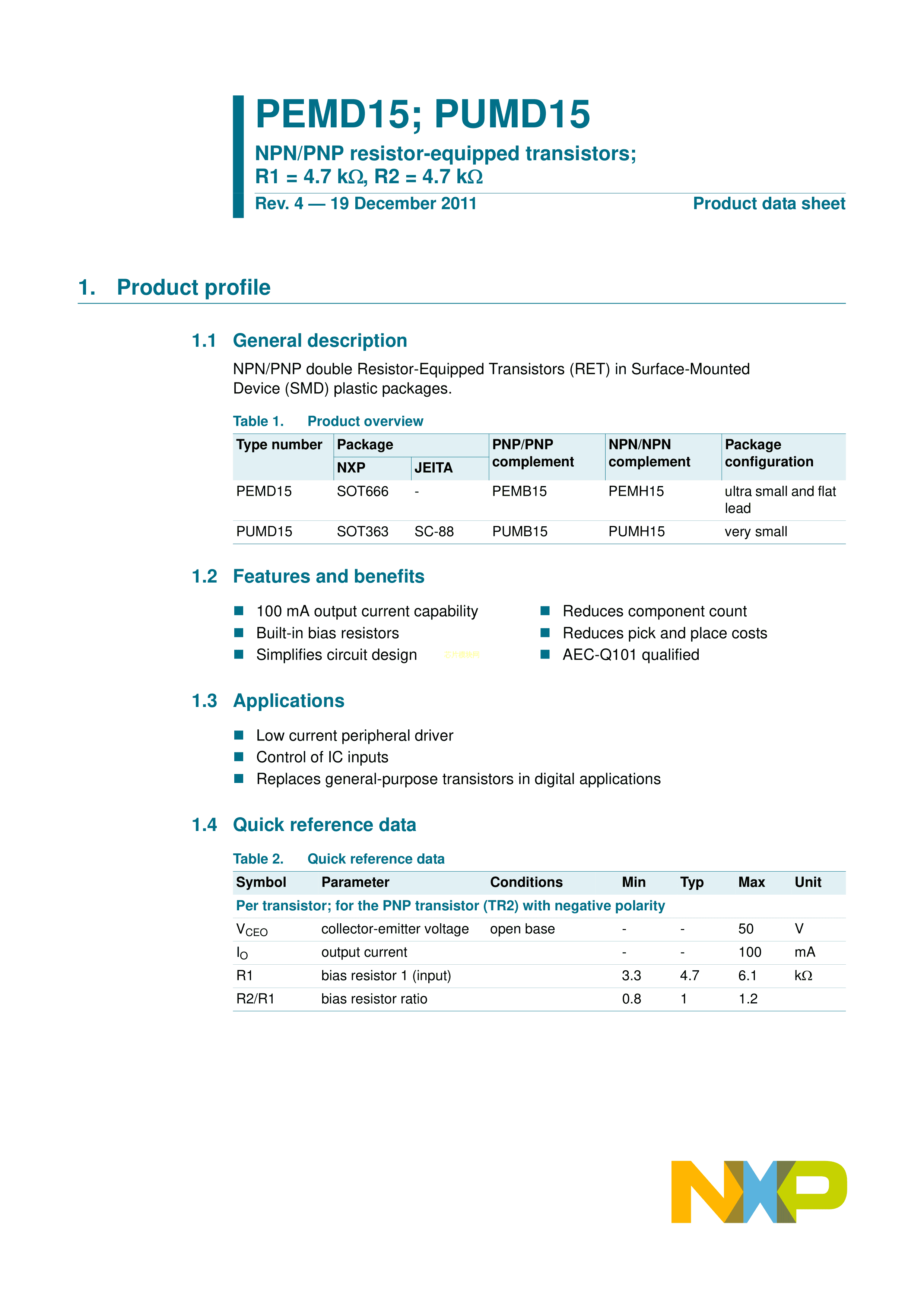 PEMD15115数据手册SOT-666封装Nexperia(安世)PDF规格书,中英文下载