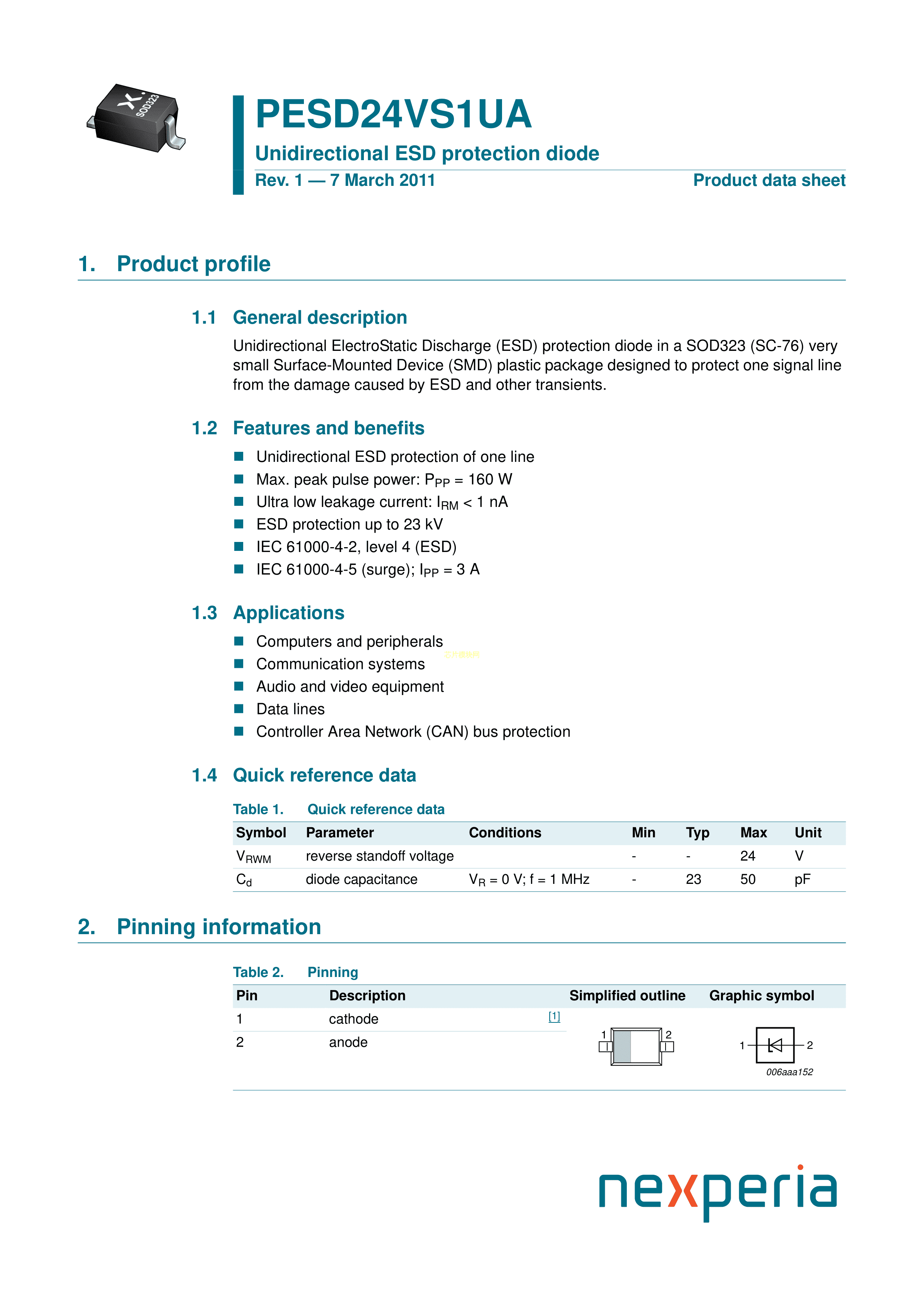 PESD24VS1UA115数据手册SOD-323封装Nexperia(安世)PDF规格书,中英文下载